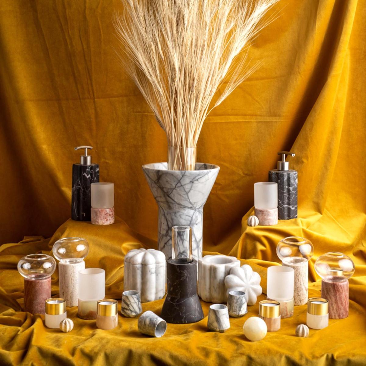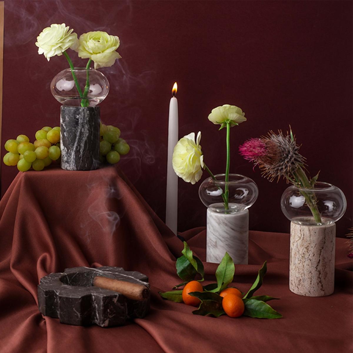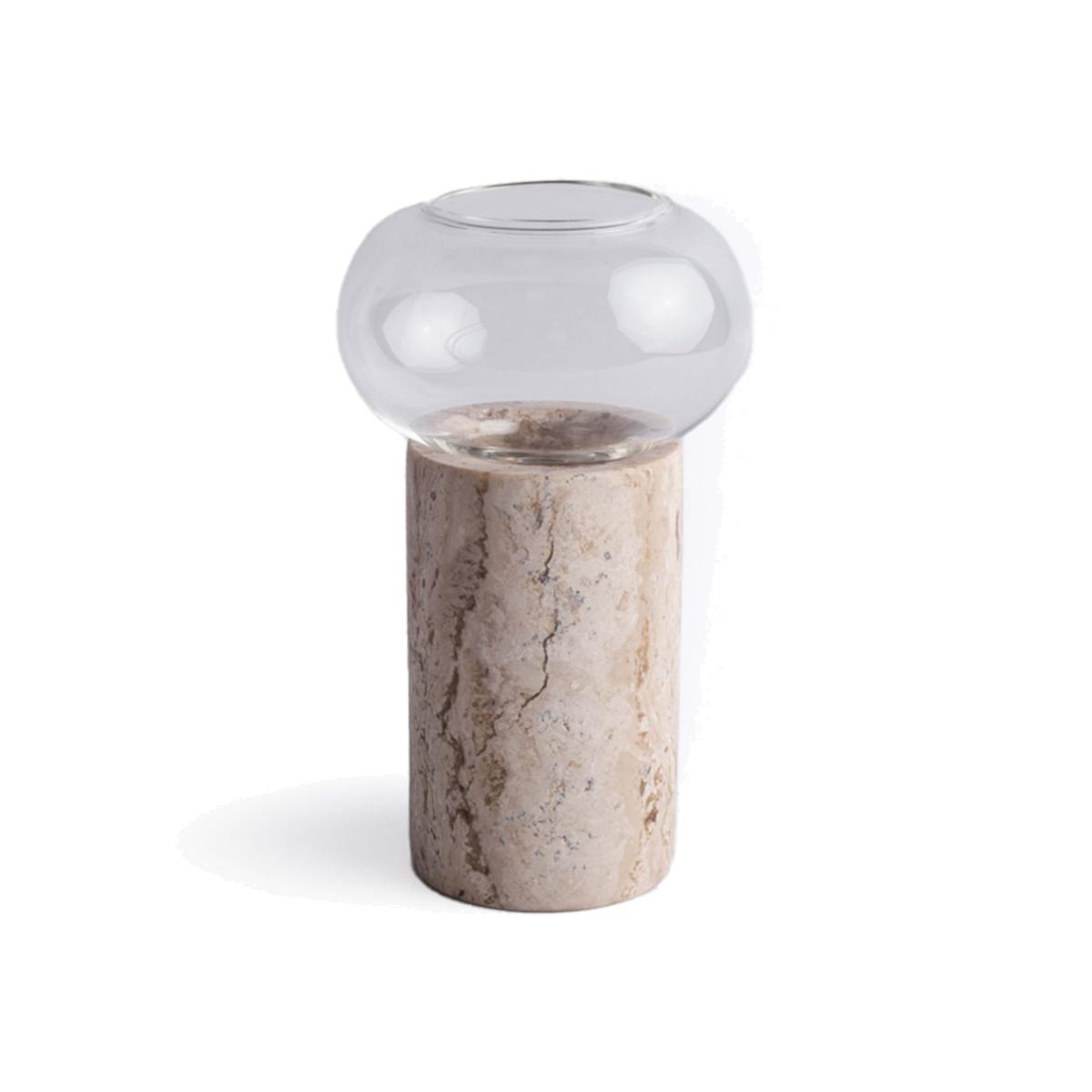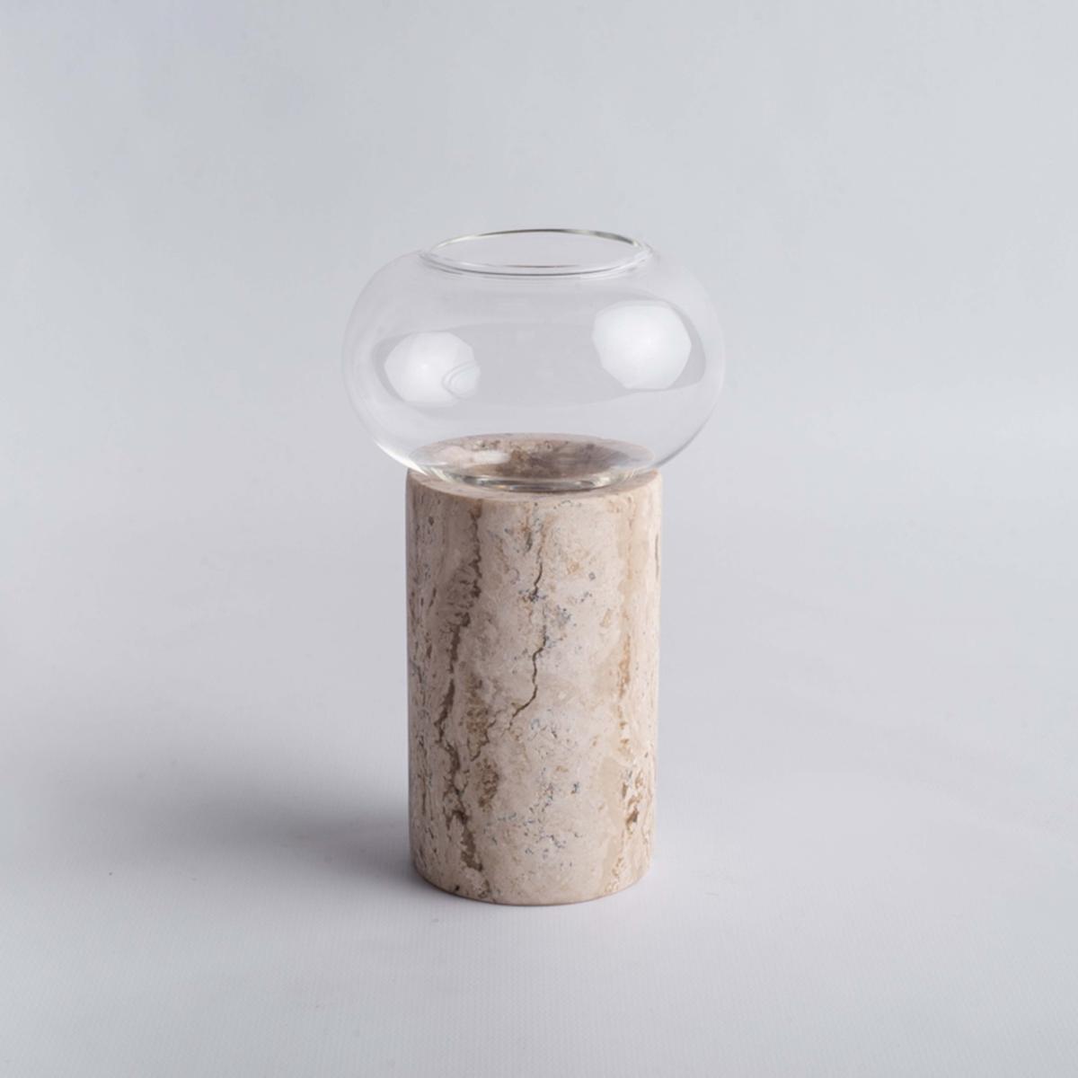 Expertly crafted, this unique piece is perfect for decorating a home. It can be a stand-alone piece, but is also a wonderful way to display a seasonal arrangement. The base of the vase is hand carved in marble of different colors: black, white, pink, volcanic stone, travertine etc. in which borosilicate glass is introduced. This glass is shaped like a beautiful original bubble. 9 x 9 x 16 cm