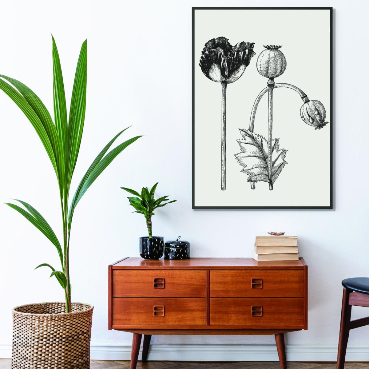 I love this vintage poppy plant print for its understated charm and neutral palette, making it versatile for a range of interiors. It works particularly well in contemporary, scandinavian, or even more traditional schemes, adding a touch of botanical interest without overwhelming the space. Practical styling tips include pairing it with other monochrome or muted-toned artwork for a cohesive look, or framing it alongside soft textiles like linen cushions to enhance a natural, relaxed vibe. Its small size makes it an adaptable piece to hang above a sofa or sideboard, offering visual interest without dominating the room.
