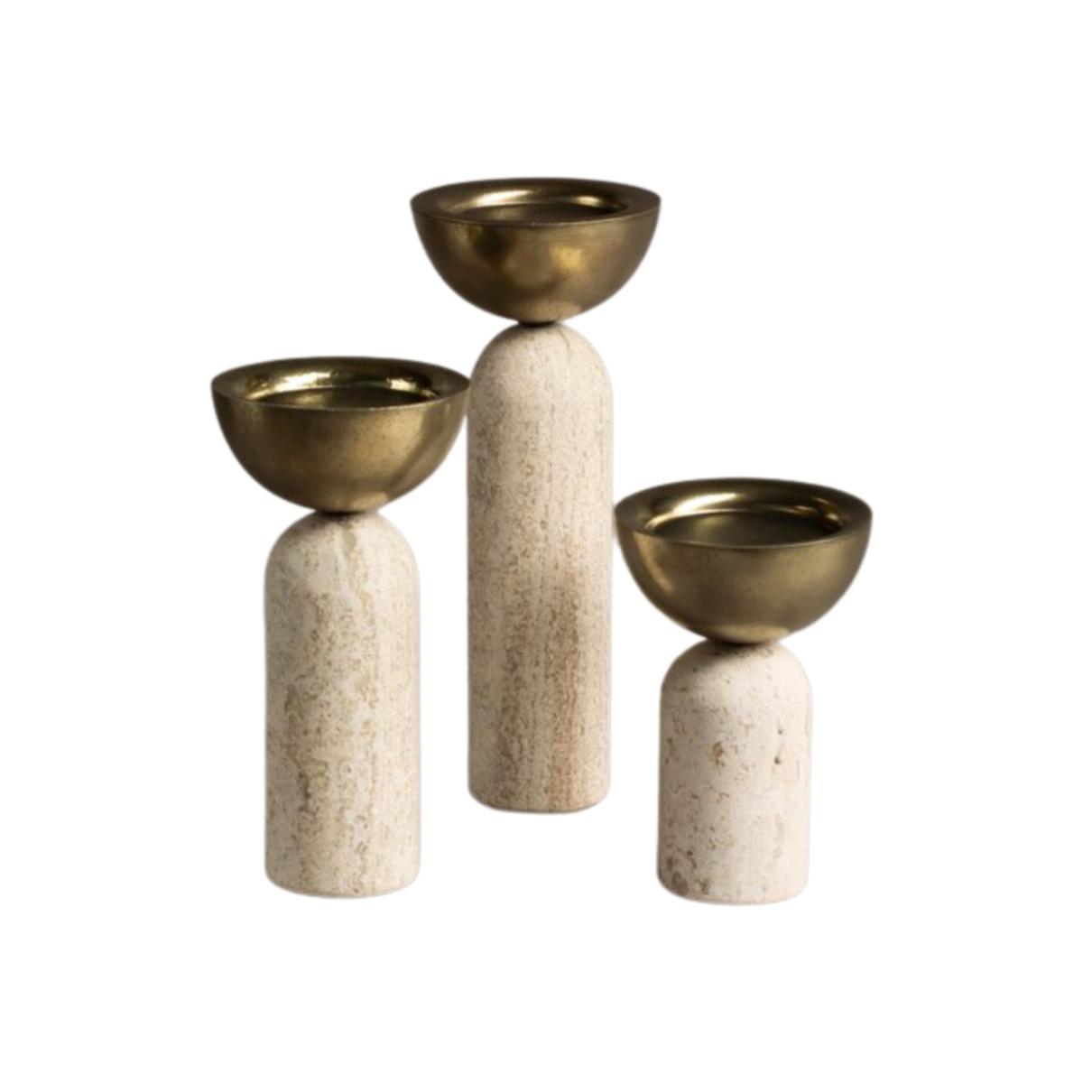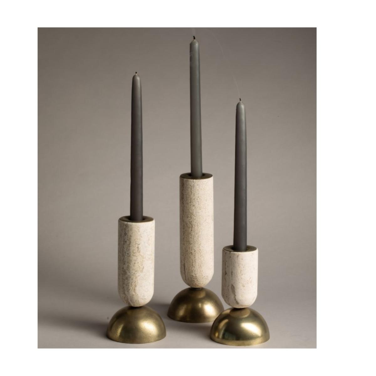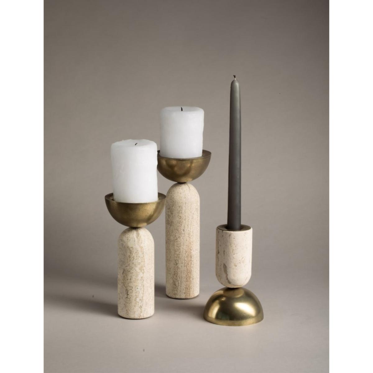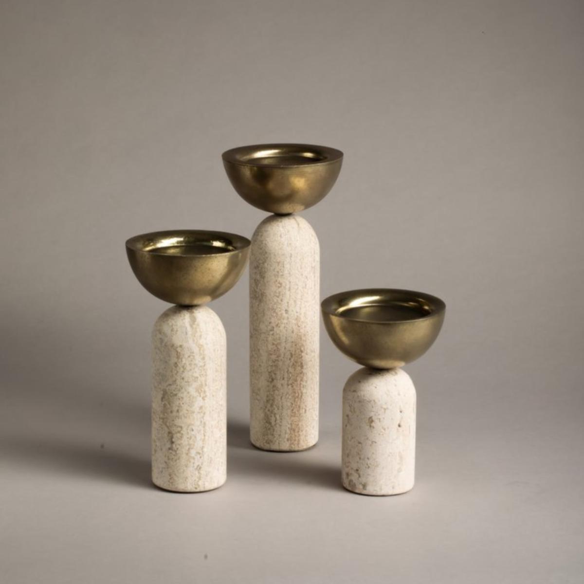 Votive is very versatile and quirky. This marble and particle-smashed brass candle holder has two main forms of use; for votive candle and pilar candle. Available in three different heights. create a composition with the different sizes or choose just one and play with its different ways of use. looks great on any surface. The set consists of one small, one medium and one large Votive Candle Holder