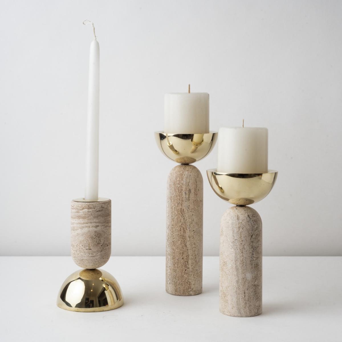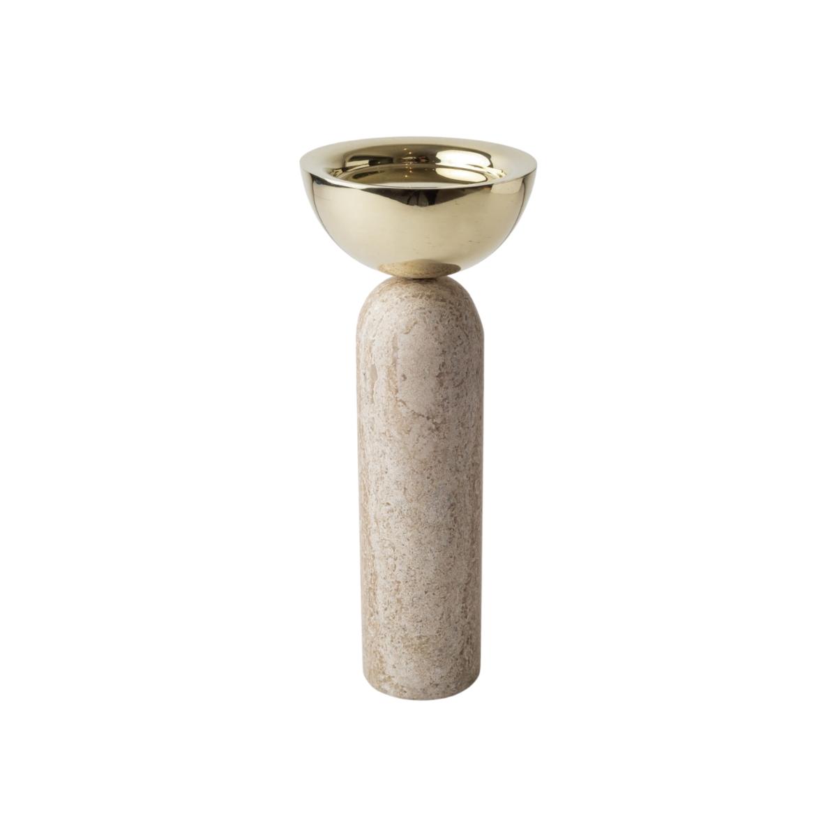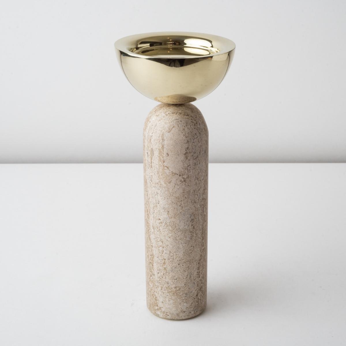 Votive is very versatile and quirky. This marble and polished brass candle holder has two main forms of use; for votive candle and pilar candle. Available in three different heights. create a composition with the different sizes or choose just one and play with its different ways of use. looks great on any surface. bruci's Large Candle Holders are available in white, black and travertine marble.