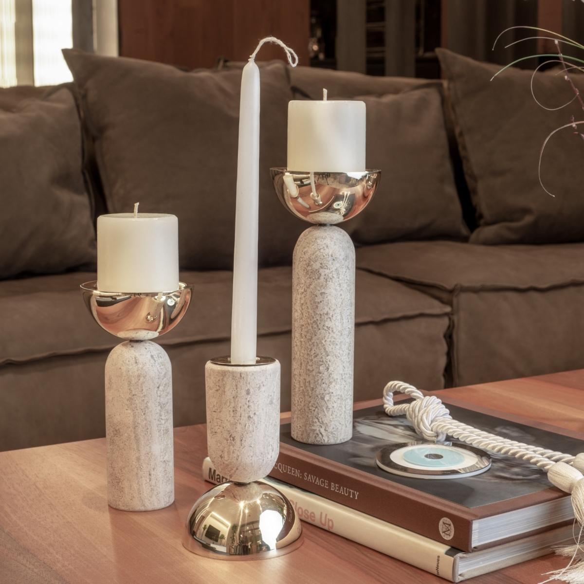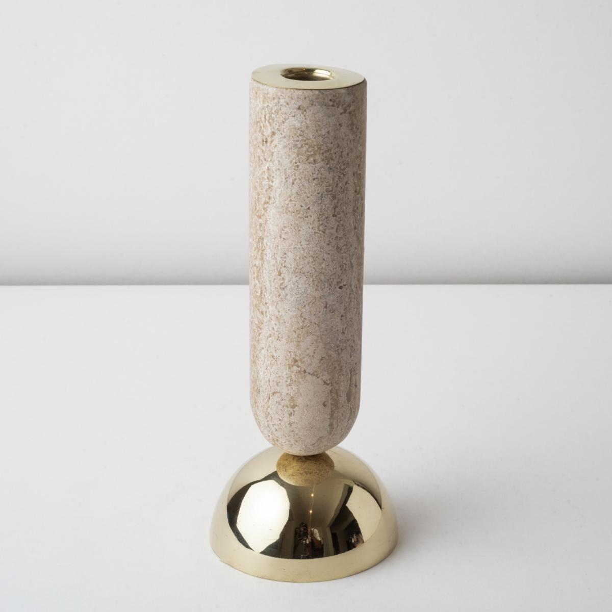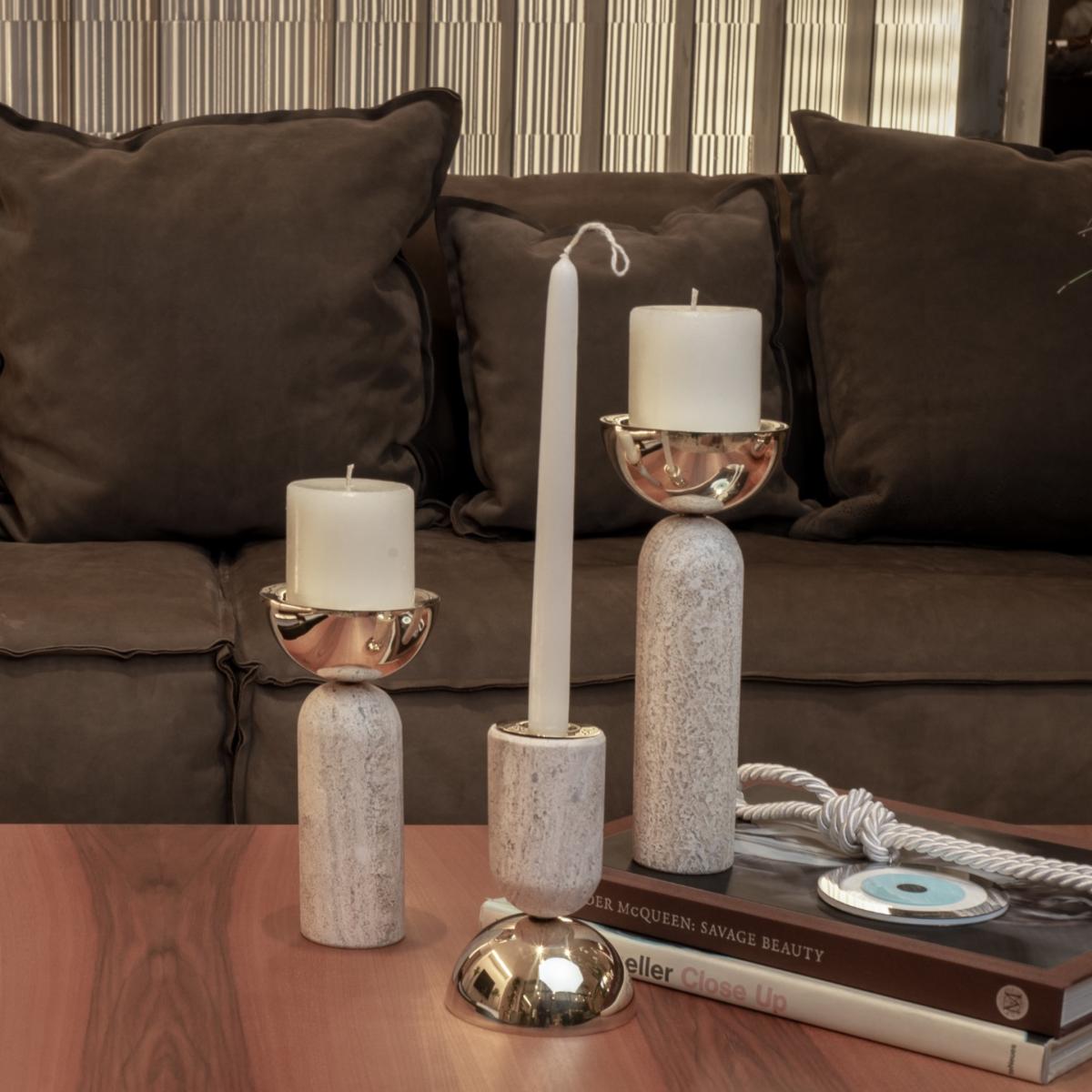Votive is very versatile and quirky. This marble and polished brass candle holder has two main forms of use; for votive candle and pilar candle. Available in three different heights. create a composition with the different sizes or choose just one and play with its different ways of use. looks great on any surface. bruci's Large Candle Holders are available in white, black and travertine marble.