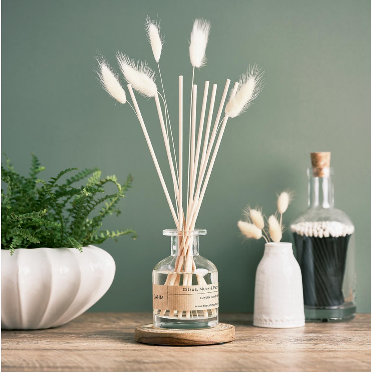 Vibrant freshly sliced grapefruit intertwined with sweet Brazilian orange, mandarin and gentle green floral hints on a base of musk and patchouli. This zesty scent gives clean vibes, helping you to focus, breathe, and be present in the moment. Hand-poured in Yorkshire, and finished with natural lagurus grass or 'bunny tails' - this reed diffuser will add a stylish element to any space or home. Made with premium fragrance oils, this 120ml diffuser will give you between 3 to 6 months of fragrance. Packaged in an FSC-certified custom cardboard box, the diffuser is accompanied by a positive mental health mantra card to spread joy.