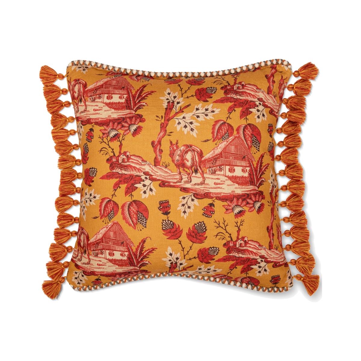 The golden colourway of this uplifting cushion makes it a sunny addition to any sofa of chair. Crafted from NAMLOS linen fabric that illustrates the Tyrolean mountain life, it’s edged with plush fringing as well as crochet piping, all of which make it a truly striking accessory.