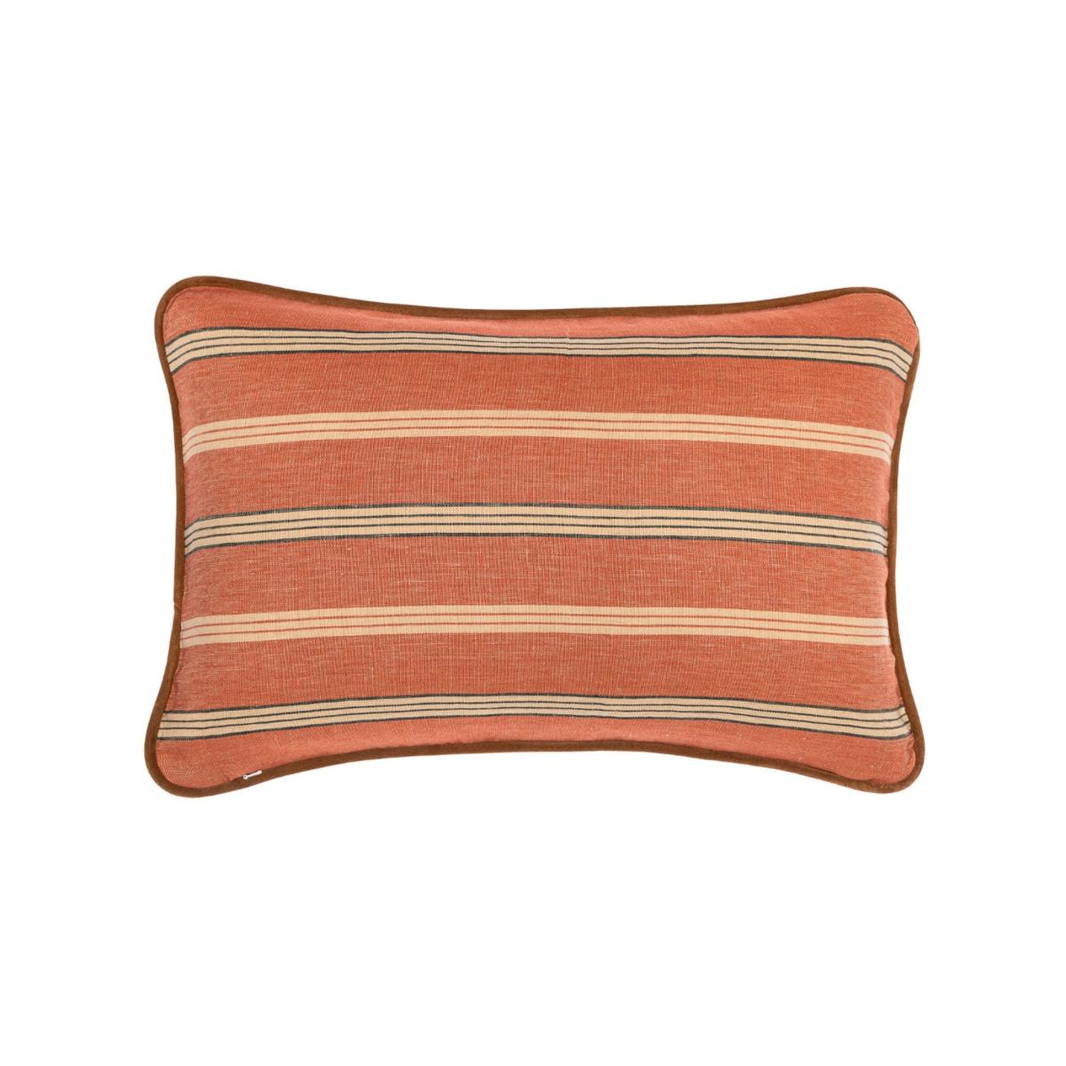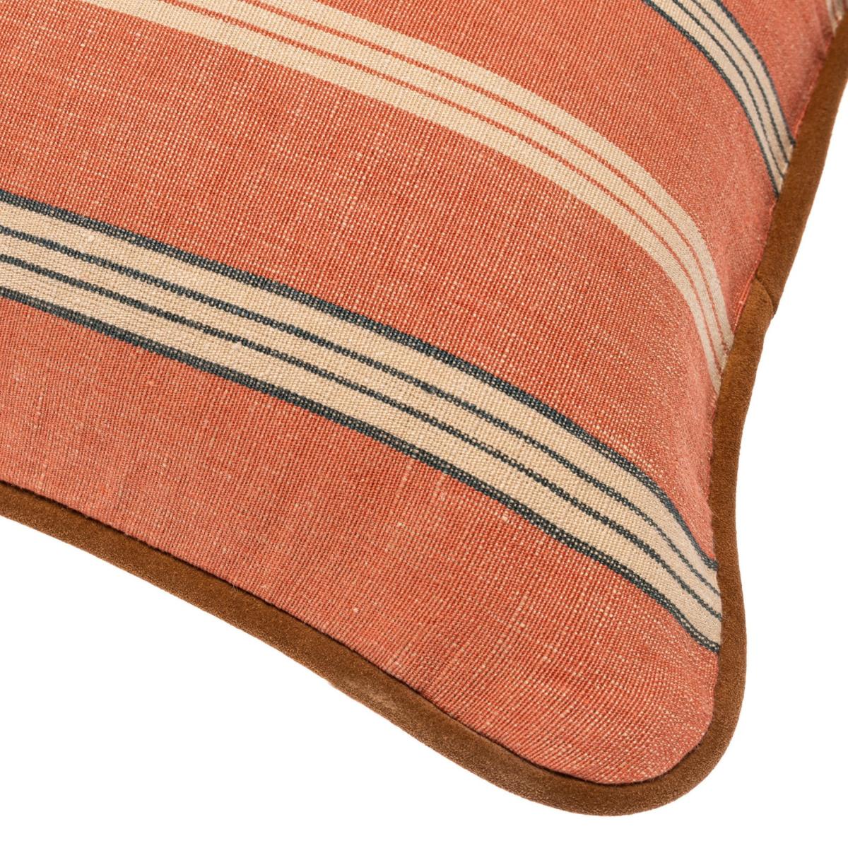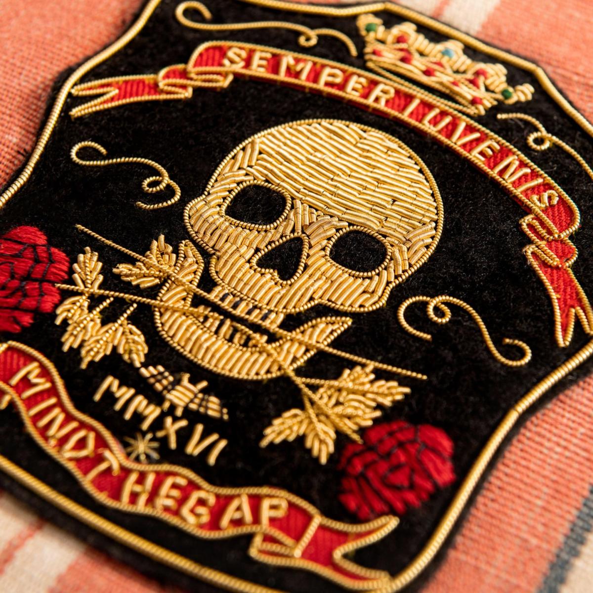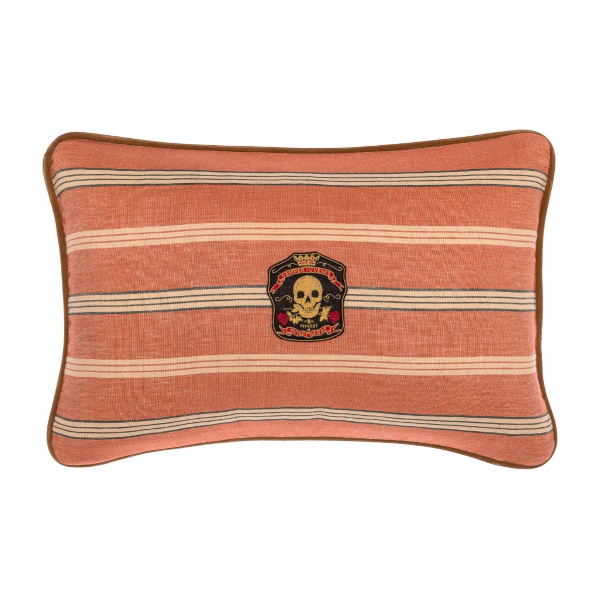 Referencing Vortex I, the rock festival held in Oregon in 1970, the OREGON STRIPES woven linen cushions show a colour palette which embodies the stonewashed denim fashion of the era. The Denim Washed and Orange Washed striped linen cushions are complemented with a brown leather piping, that enhance the premium look of the product. The front cover is decorated with a beautiful hand-embroidered metallic bullion displaying a skull and two roses representing the main symbol of the Woodstock Collection, Semper Iuvenis.