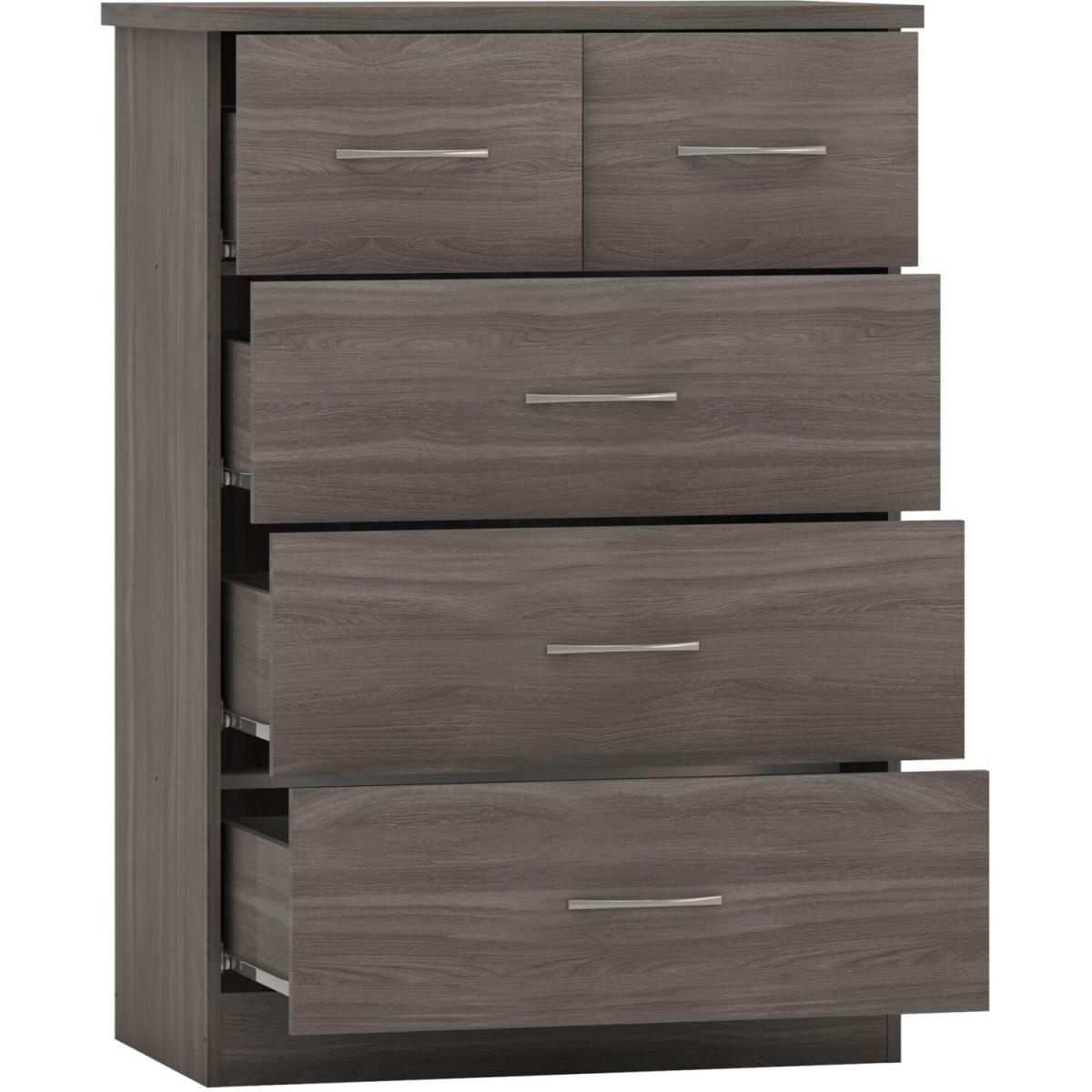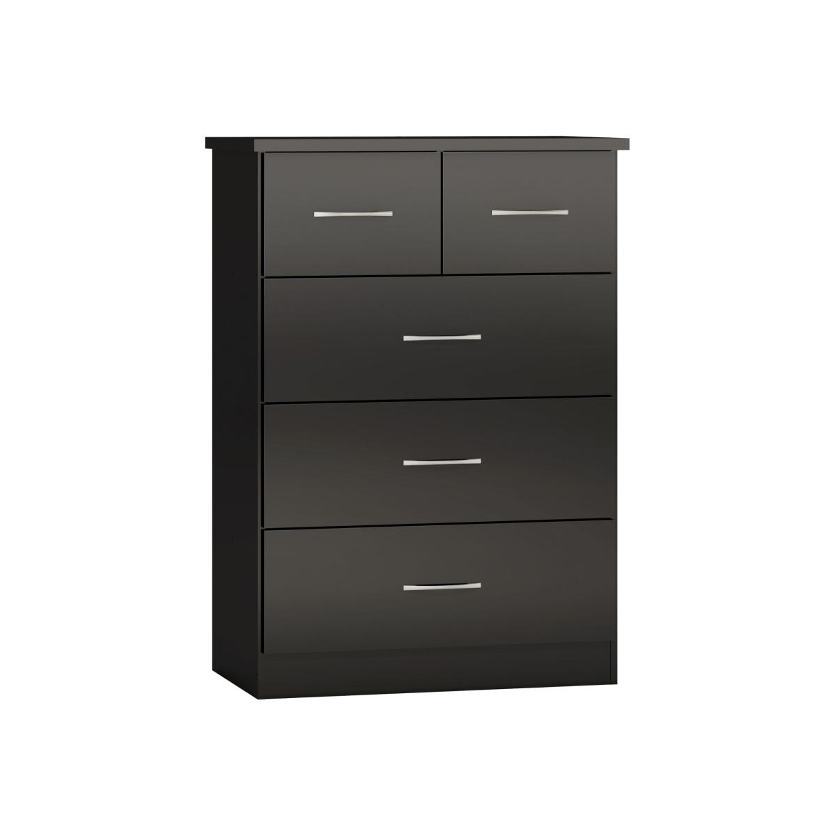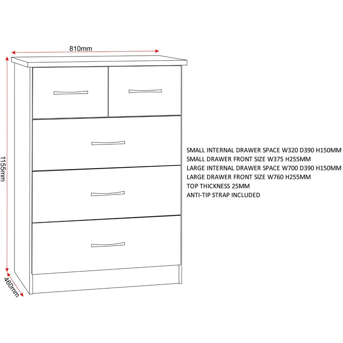 Solve storage woes with style using this chest of drawers, which is brimming with contemporary appeal. Available in a range of colours to suit your existing decor, the chest features a streamlined silhouette and accent handles for plenty of modern flair. Five drawers provide useful storage space for clothing and more. Care Instructions Wipe clean with a soft cloth. UK Mainland delivery only, between 9am - 9pm (weekdays) the courier will contact you on the day of delivery to offer a time slot. This takes place within 10 working days (Ground floor only). Please also ensure that we have a note of your up-to-date address and contact information, to be passed to the couriers.