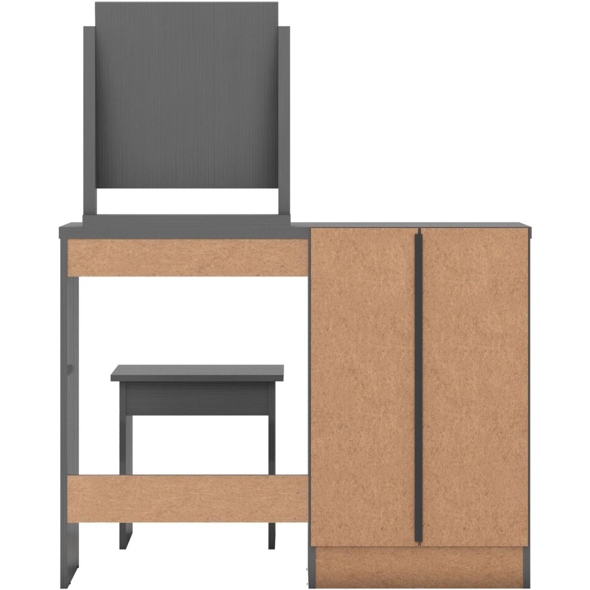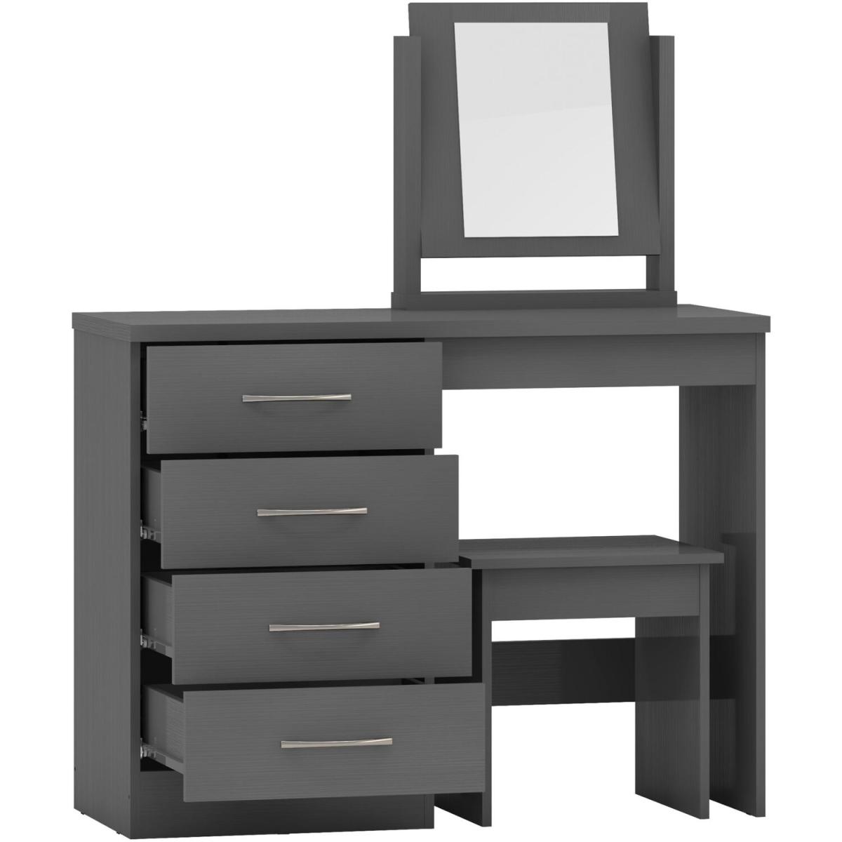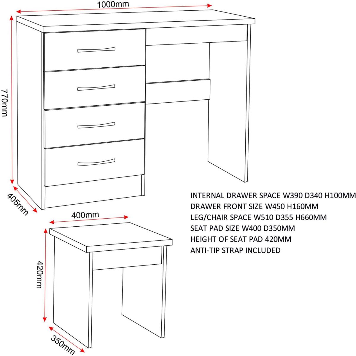 This simple, functional vanity table is a complete and contemporary solution for the bedroom. It includes an adjustable mirror, a generous desk top, four drawers, and a stool. It is made from manufactured wood with metal drawer handles. Assembly required. UK Mainland delivery only, between 9am - 9pm (weekdays) the courier will contact you on the day of delivery to offer a time slot. This takes place within 10 working days (Ground floor only). Please also ensure that we have a note of your up-to-date address and contact information, to be passed to the couriers.