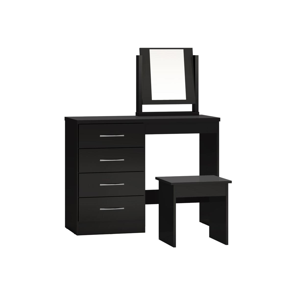 This simple, functional vanity table is a complete and contemporary solution for the bedroom. It includes an adjustable mirror, a generous desk top, four drawers, and a stool. It is made from manufactured wood with metal drawer handles. Assembly required. UK Mainland delivery only, between 9am - 9pm (weekdays) the courier will contact you on the day of delivery to offer a time slot. This takes place within 10 working days (Ground floor only). Please also ensure that we have a note of your up-to-date address and contact information, to be passed to the couriers.