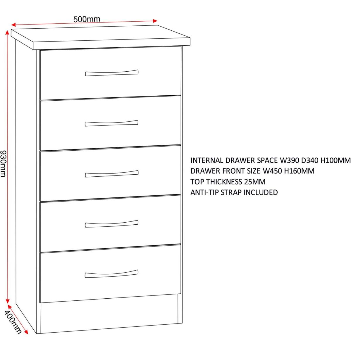 This narrow chest offers style and storage solutions in a subdued palette that would fit well within a bedroom, living area, or hallway. A quality finish gives it a contemporary edge. The chest includes five drawers and is made from manufactured wood. Assembly is required. UK Mainland delivery only, between 9am - 9pm (weekdays) the courier will contact you on the day of delivery to offer a time slot. This takes place within 10 working days (Ground floor only). Please also ensure that we have a note of your up-to-date address and contact information, to be passed to the couriers.