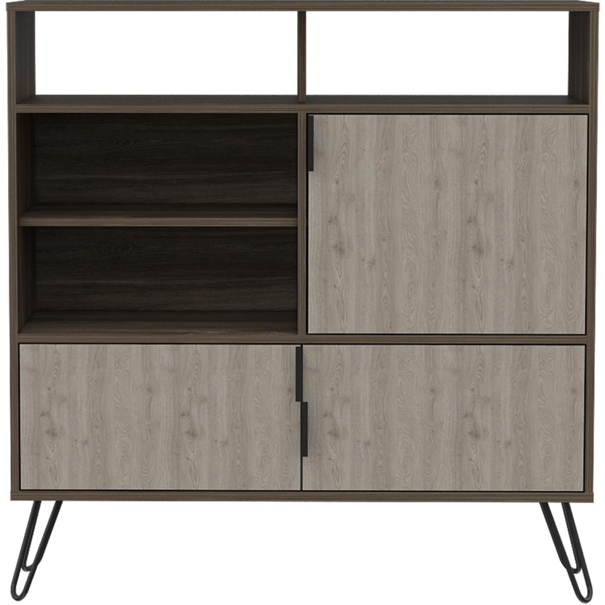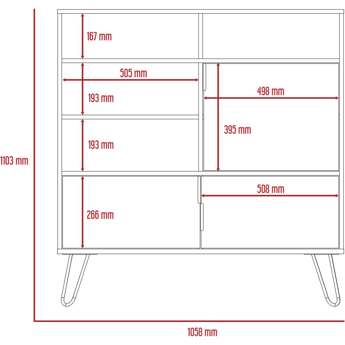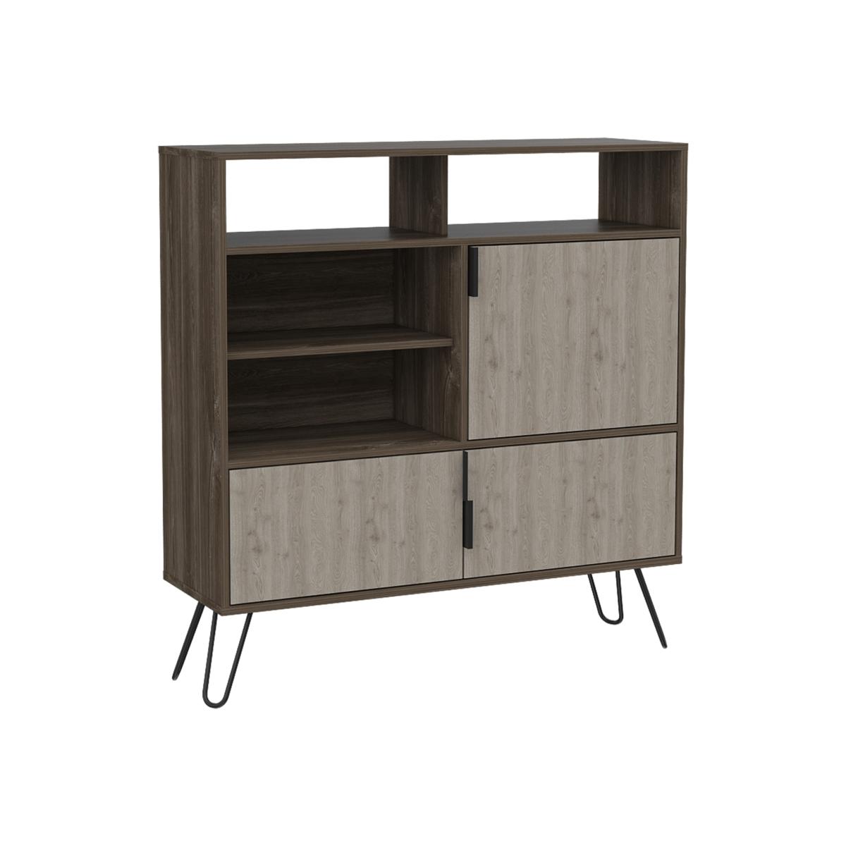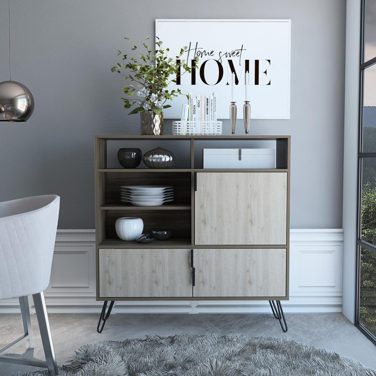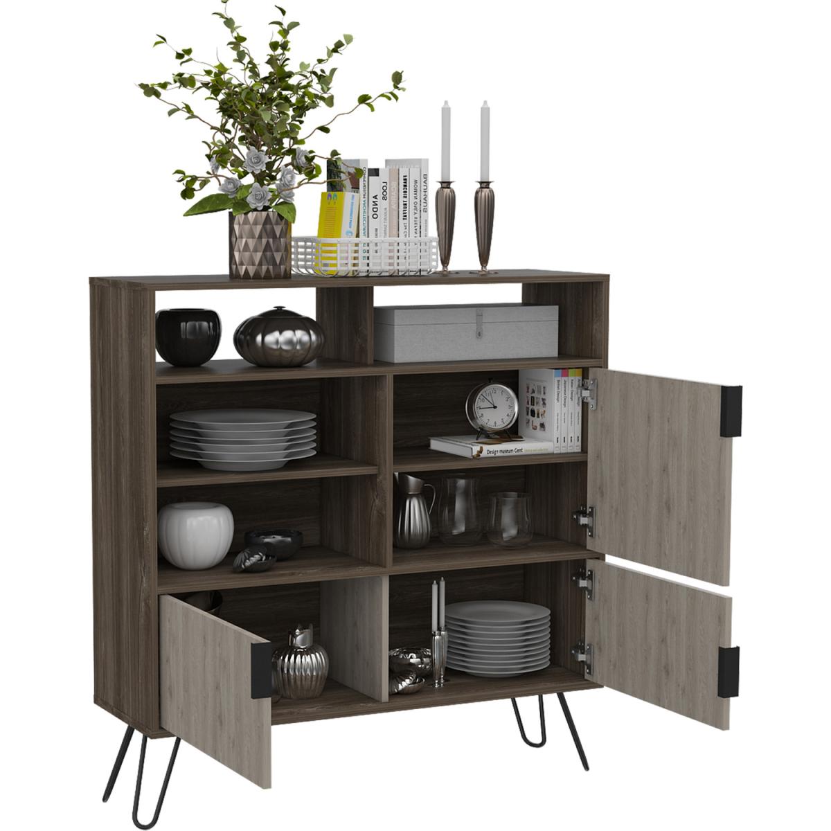 The Nevada collection is designed to give you a fresh outlook on making the most of your home, with innovative pieces which are ideal for todays casual living lifestyle. Each piece is designed to serve a practical purpose and can be used individually or combined with other pieces from our Nevada range for a fully co-ordinated look. Made from hardwearing manufactured boards. An easy to clean woodgrain textured smoked oak effect is used for the cabinets with bleached grey effect for the fronts and coordinating panels. The industrial feel is further accented with real metal black painted grip handles and hairpin legs. If you need to optimise storage space in your dining area, this high sideboard offers you more storage than a standard sideboard. The top section offers plenty of display space and the inspiring combination of open and enclosed storage of different sizes is really useful. Inside the large cupboard you will also find a rigid shelf.