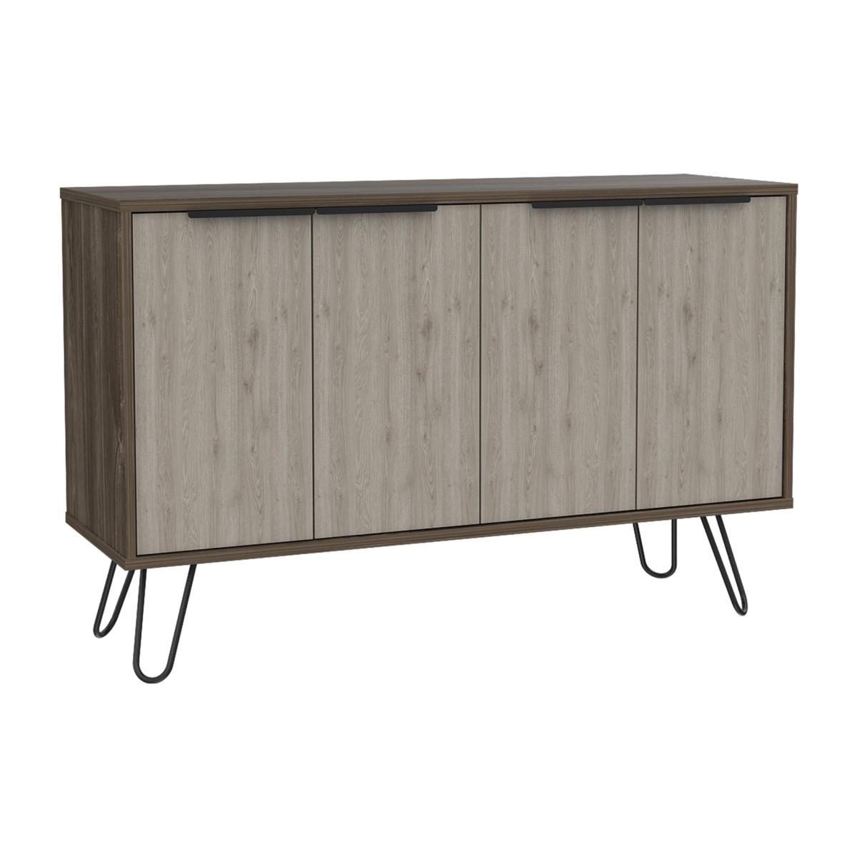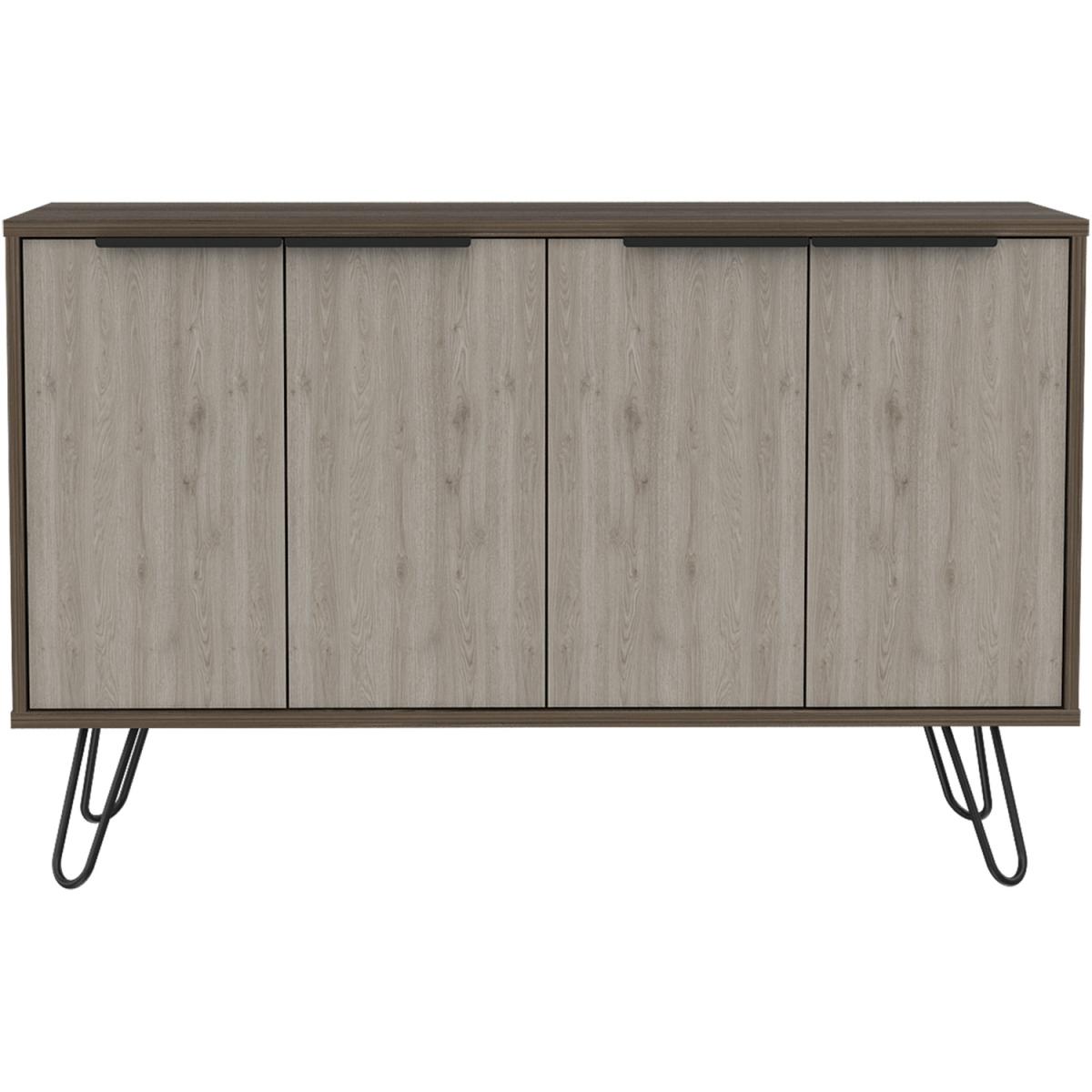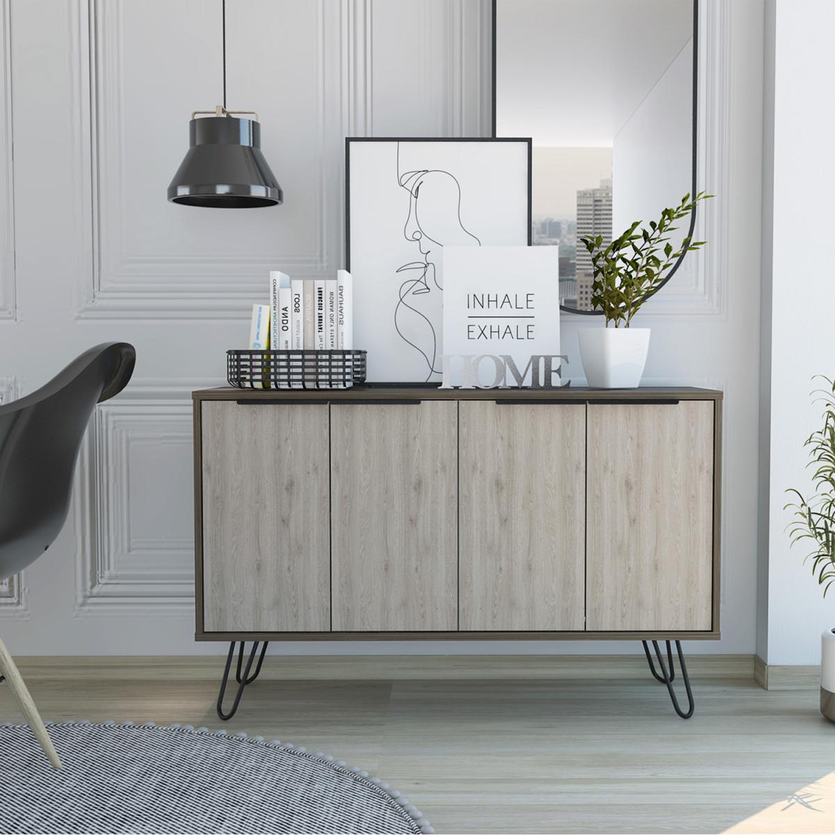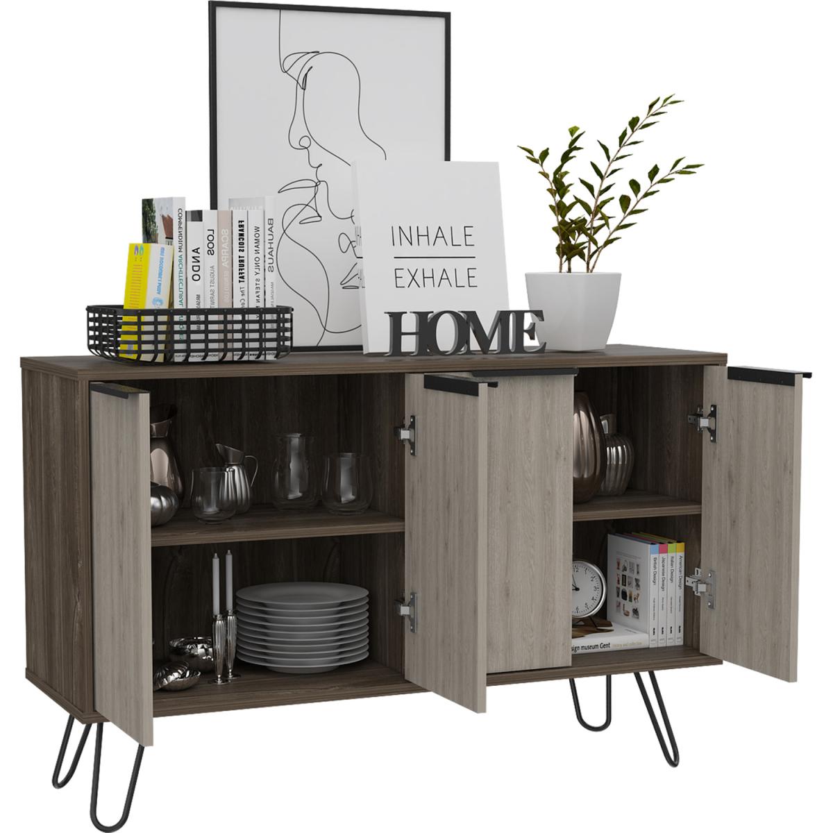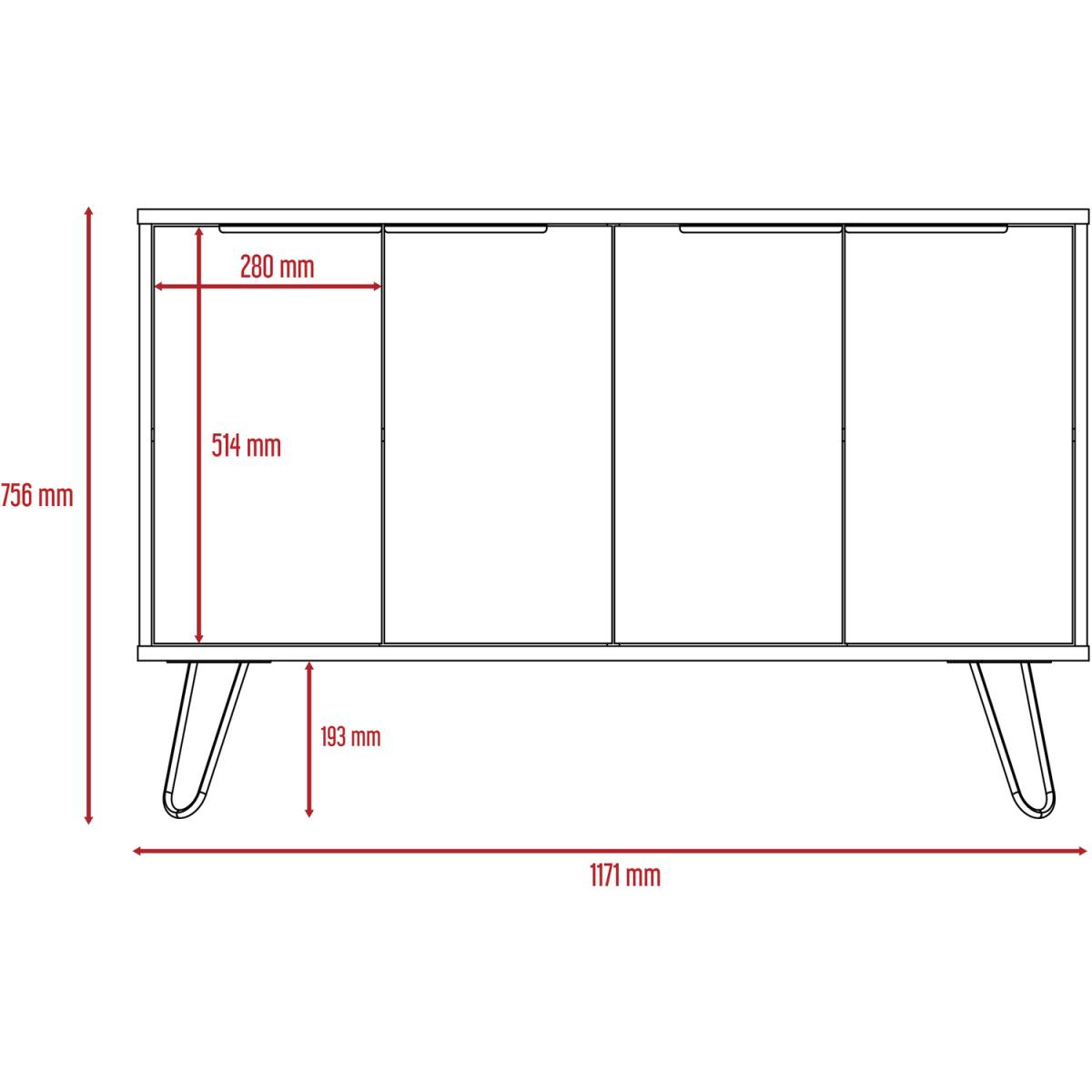 The Nevada collection is designed to give you a fresh outlook on making the most of your home, with innovative pieces which are ideal for todays casual living lifestyle. Each piece is designed to serve a practical purpose and can be used individually or combined with other pieces from our Nevada range for a fully co-ordinated look. Made from hardwearing manufactured boards. An easy to clean woodgrain textured smoked oak effect is used for the cabinets with bleached grey effect for the fronts and coordinating panels. The industrial feel is further accented with real metal black painted grip handles and hairpin legs. Our large 4 door sideboard is great for storage and practical too. The wipe clean top surface is great for use as a serving area, for display or even for a TV.Underneath you will find two sets of doors concealing cupboard areas, both with shelves so plenty of storage for glasses, dinnerware or anything else you want to keep handy.