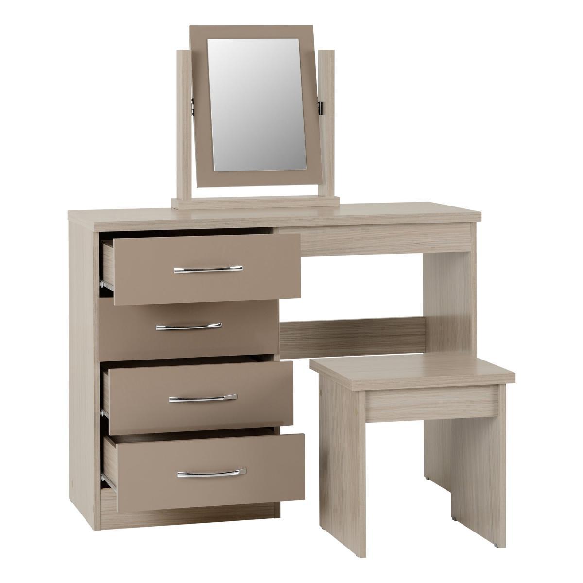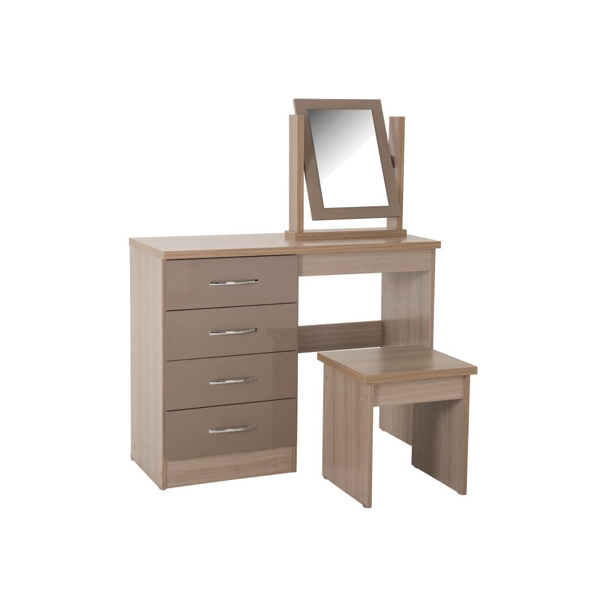 The Nevada Oyster Dressing Table Set features a contemporary design owing to the gloss finished front which contrasts perfectly with the light oak veneers. The Nevada has your storage needs covered thanks to the four drawers and table space. Featuring an adjustable mirror and matching oak stool, this dressing table is a modern addition to any home décor. Please note, unfortunately we cannot deliver this item to Northern Ireland or the Channel Islands.