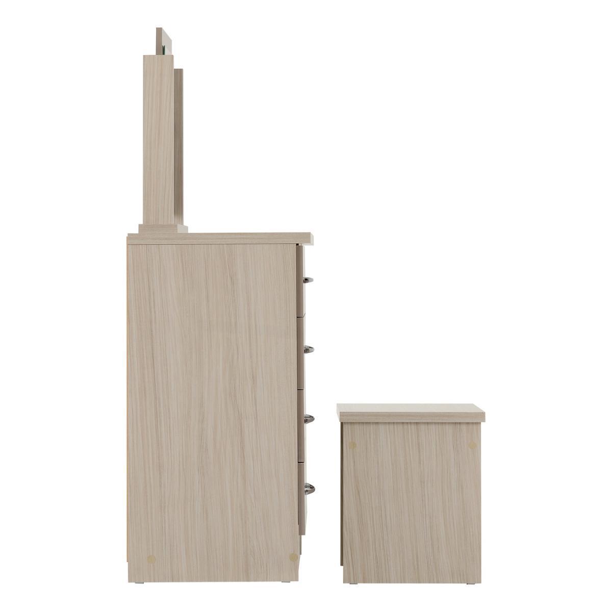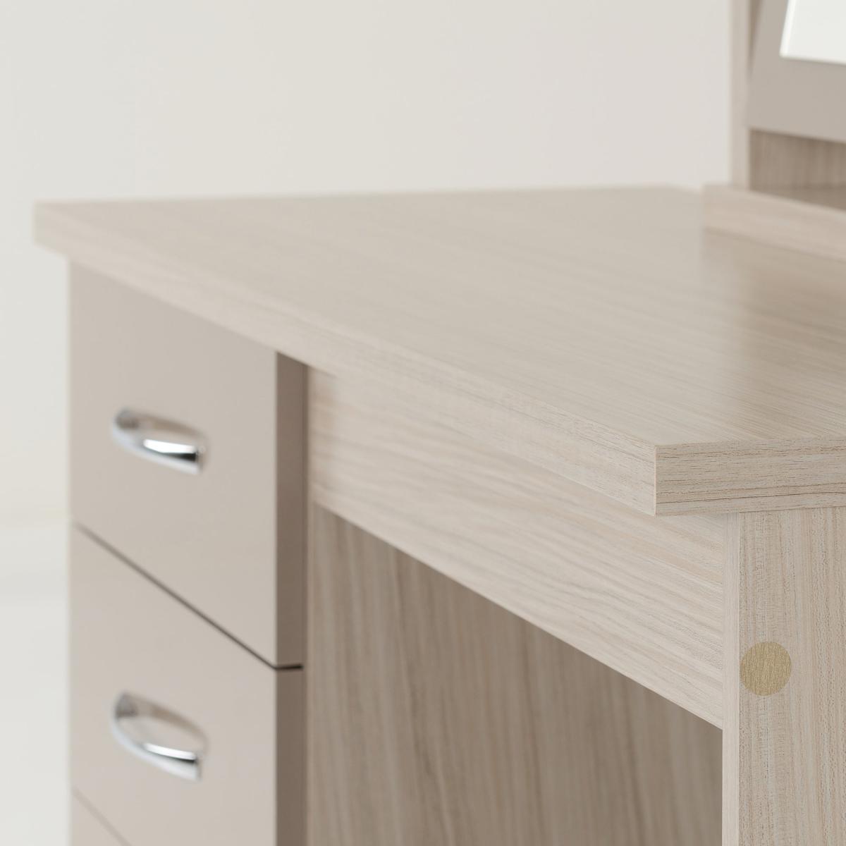 I love this dressing table set’s neutral oyster shade, which makes it incredibly versatile for various interior styles. Its understated design works well in both contemporary and traditional bedrooms, adding a light and airy feel. I recommend pairing it with soft textiles and minimalist accessories for a modern look, or with vintage-inspired pieces for a more classic vibe. Practical styling tips include using the top for daily essentials and organising smaller items in the drawers to keep the surface clutter-free. The mirror’s adjustable tilt is a thoughtful feature, making it easy to find the most flattering angle, while the stool provides a comfortable seating option without taking up excess space. Overall, it suits those looking for a functional and aesthetically neutral piece that can adapt to different decor schemes.