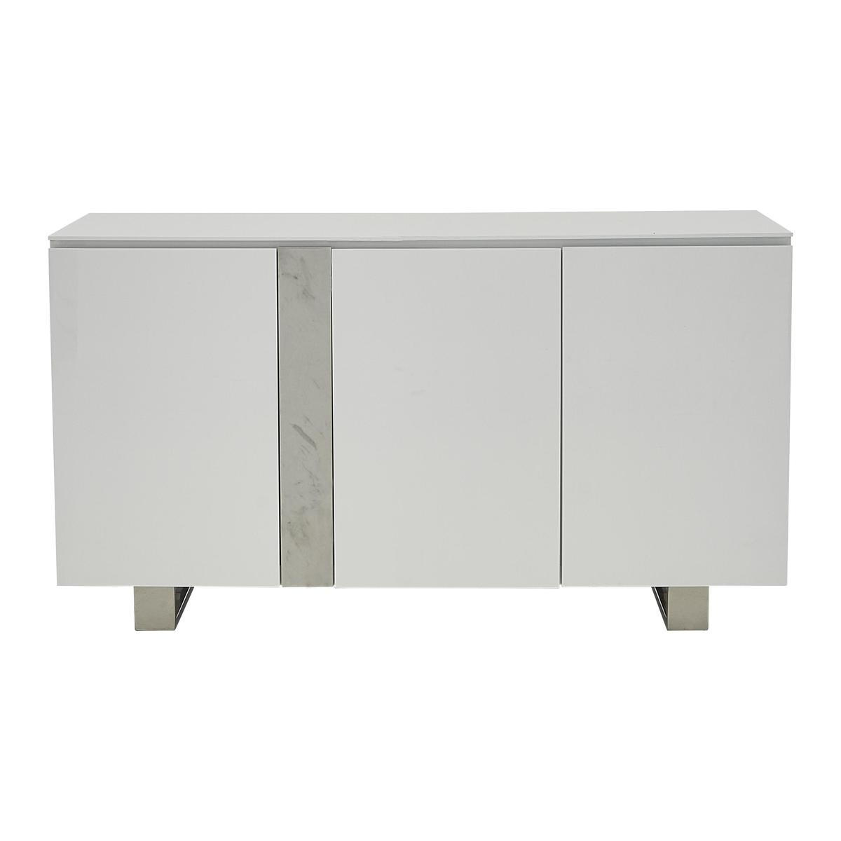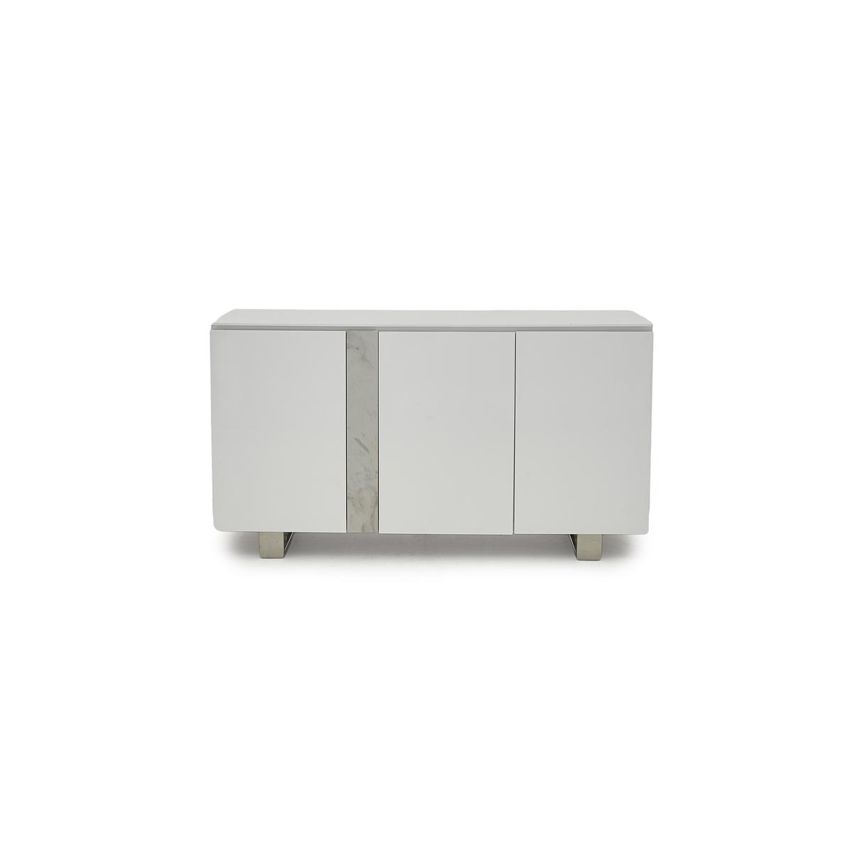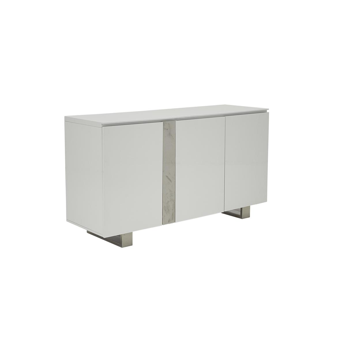 Entertain in sleek modern style with the luxuriously glamorous Nevada dining and occasional collection. The extending dining table’s top is beautiful white marble effect ceramic on glass, while its ultra-modern base is polished stainless steel. The table extends to seat up to 8, with two concealed leaves. Relax on the softly cushioned, faux leather upholstered dining chairs with steel cantilever legs. Ceramic is water resistant, heat resistant and scratch resistant, does not dent or stain and is easy to clean. Striking modern 3 door sideboard. Finished in white, high gloss lacquer. Integrated concealed handles maintain a sleek silhouette. Sophisticated white marbled ceramic strip detailing. White laminate interior with practical shelving. Ultra-modern legs are polished stainless steel. Part of the Nevada dining and occasional collection. WARNING!. Furniture can tip over unexpectedly and cause injury. This item shall be fixed to a wall using the anti-tip kit provided with the furniture. Be sure to use the correct wall fixings suitable for the walls in your home.