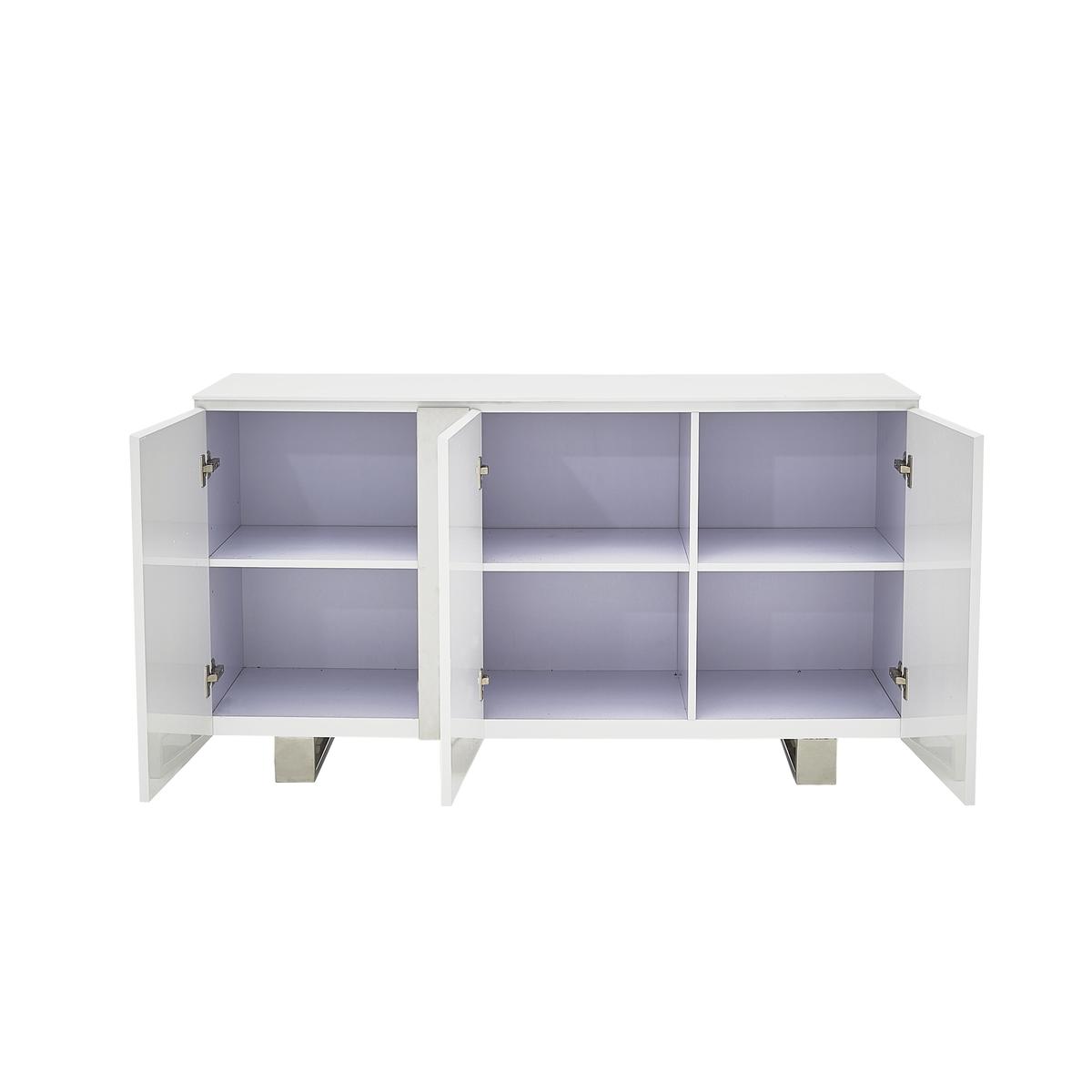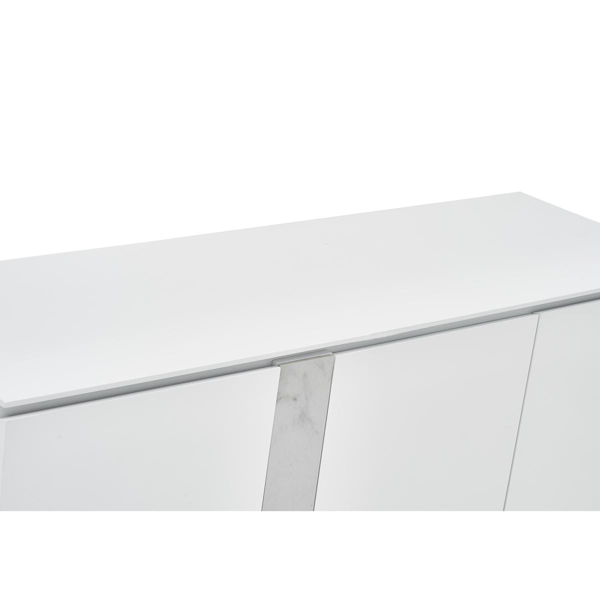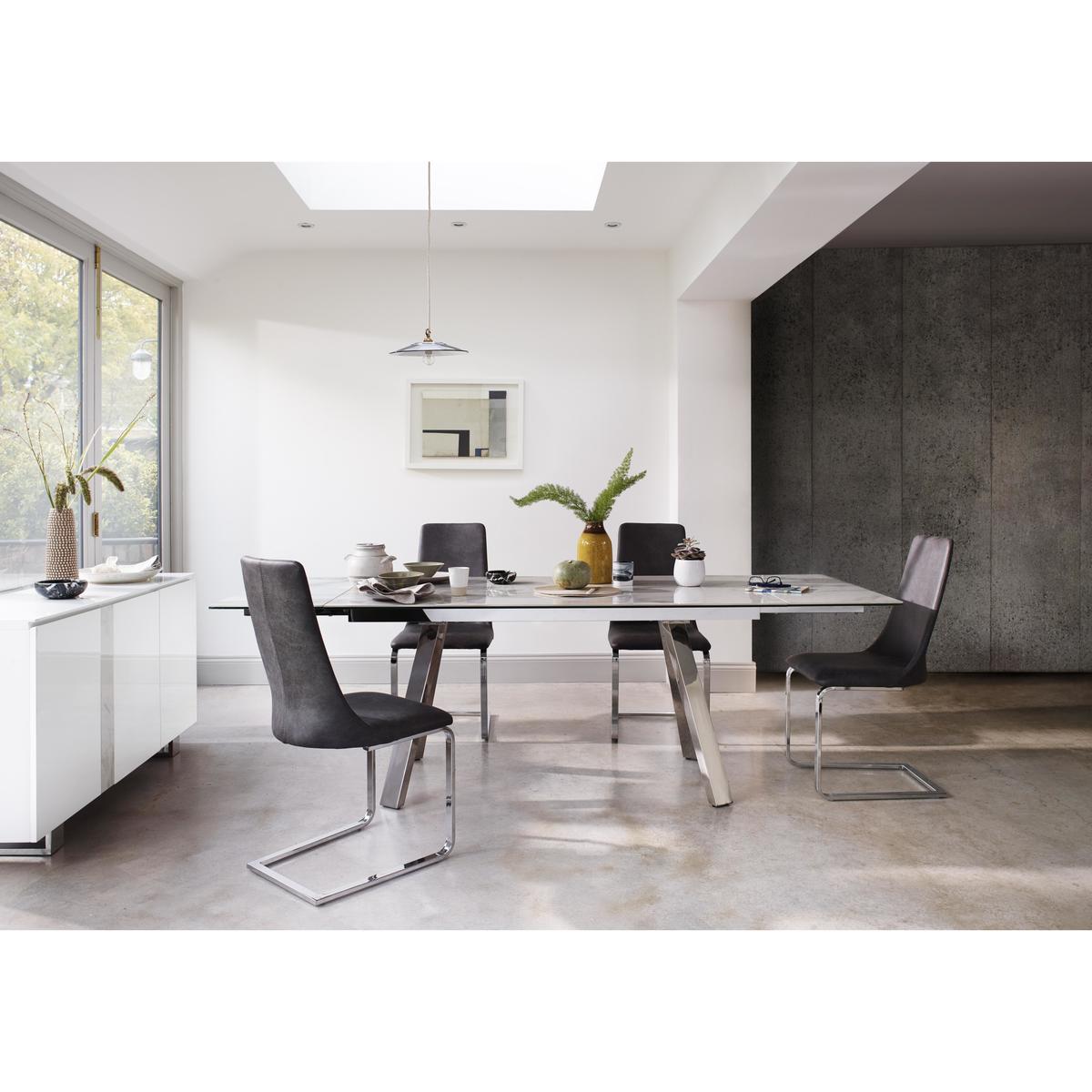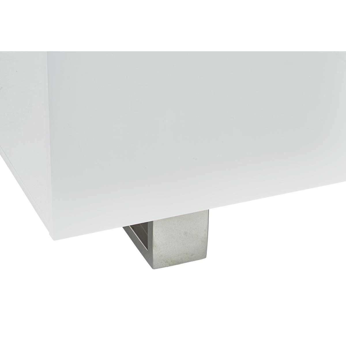 Entertain in sleek modern style with the luxuriously glamorous Nevada dining and occasional collection. The extending dining table’s top is beautiful white marble effect ceramic on glass, while its ultra-modern base is polished stainless steel. The table extends to seat up to 8, with two concealed leaves. Relax on the softly cushioned, faux leather upholstered dining chairs with steel cantilever legs. Ceramic is water resistant, heat resistant and scratch resistant, does not dent or stain and is easy to clean. Striking modern 3 door sideboard. Finished in white, high gloss lacquer. Integrated concealed handles maintain a sleek silhouette. Sophisticated white marbled ceramic strip detailing. White laminate interior with practical shelving. Ultra-modern legs are polished stainless steel. Part of the Nevada dining and occasional collection. WARNING!. Furniture can tip over unexpectedly and cause injury. This item shall be fixed to a wall using the anti-tip kit provided with the furniture. Be sure to use the correct wall fixings suitable for the walls in your home.