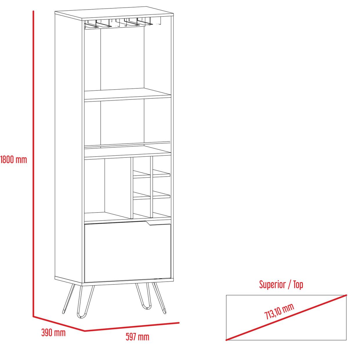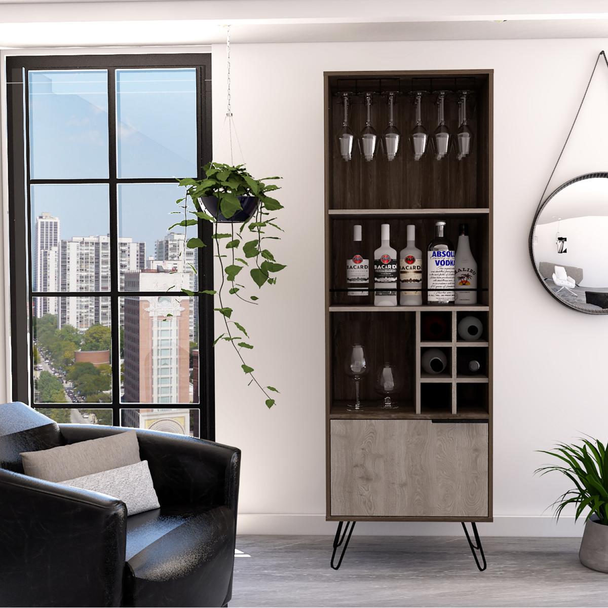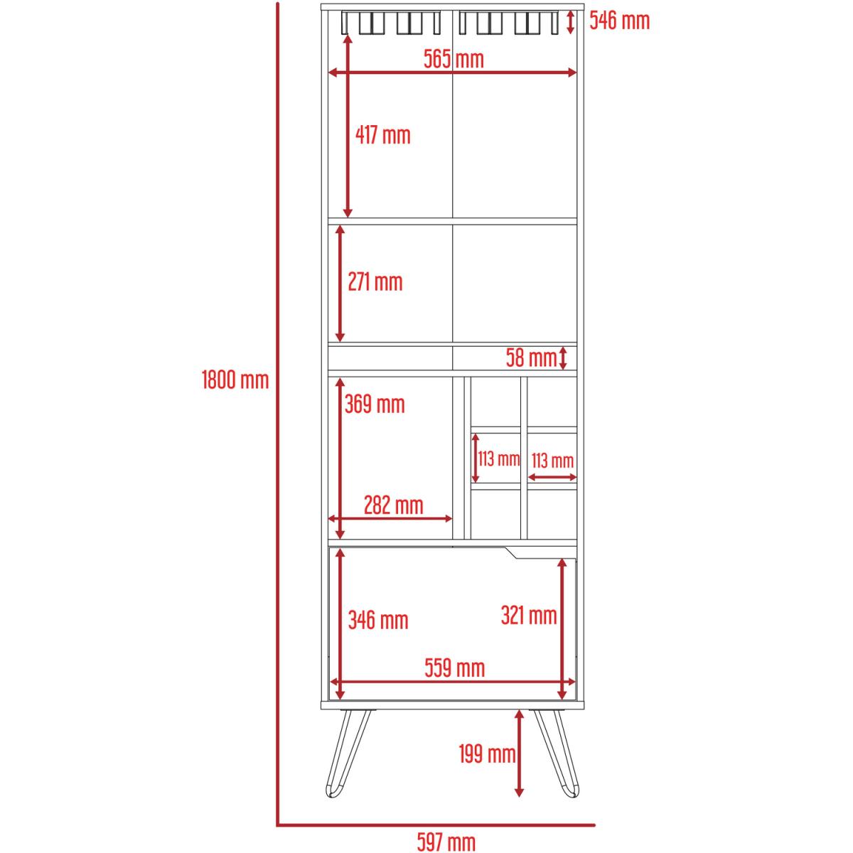 The Nevada collection is designed to give you a fresh outlook on making the most of your home, with innovative pieces which are ideal for todays casual living lifestyle. Each piece is designed to serve a practical purpose and can be used individually or combined with other pieces from our Nevada range for a fully co-ordinated look. Made from hardwearing manufactured boards. An easy to clean woodgrain textured smoked oak effect is used for the cabinets with bleached grey effect for the fronts and coordinating panels. The industrial feel is further accented with real metal black painted grip handles and hairpin legs. Our tall bar cabinet encompasses everything you need in a compact space. From the top you have a metal suspension rack ideal for wine glasses, a contrasting finish shelf for tumblers and a wipe clean shelf which effortlessly works as a servery. It also features a front safety rail to help avoid spilling. You then have an upright bottle storage area alongside 6 bottle racks. The contrasting wide drop down door at the bottom with adjustable hinges conceals even more storage space for you.