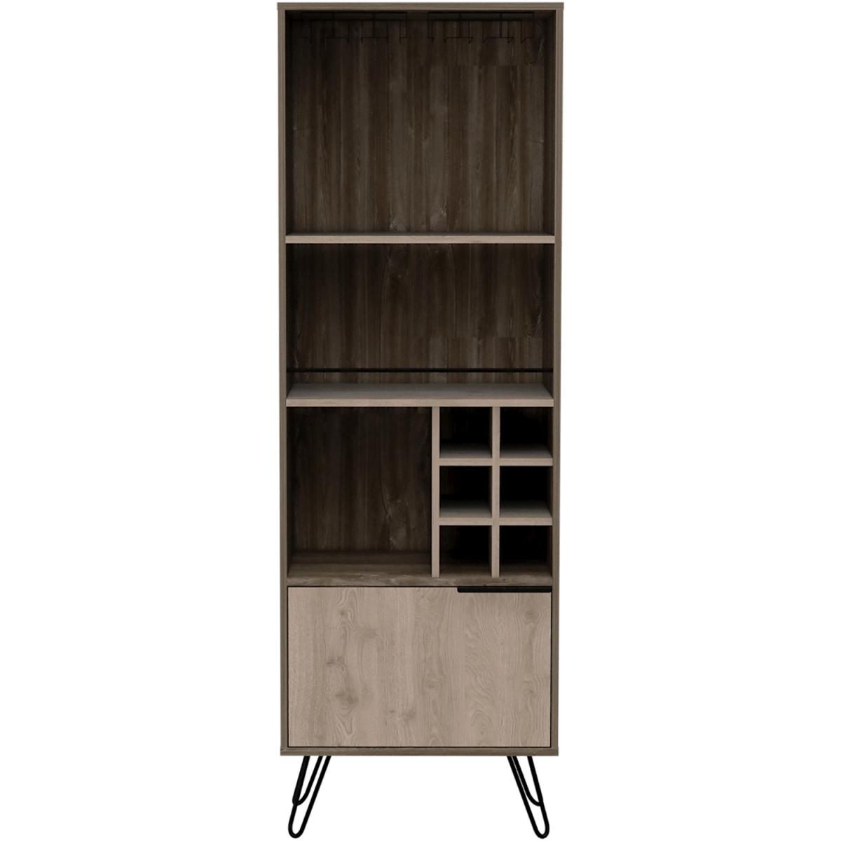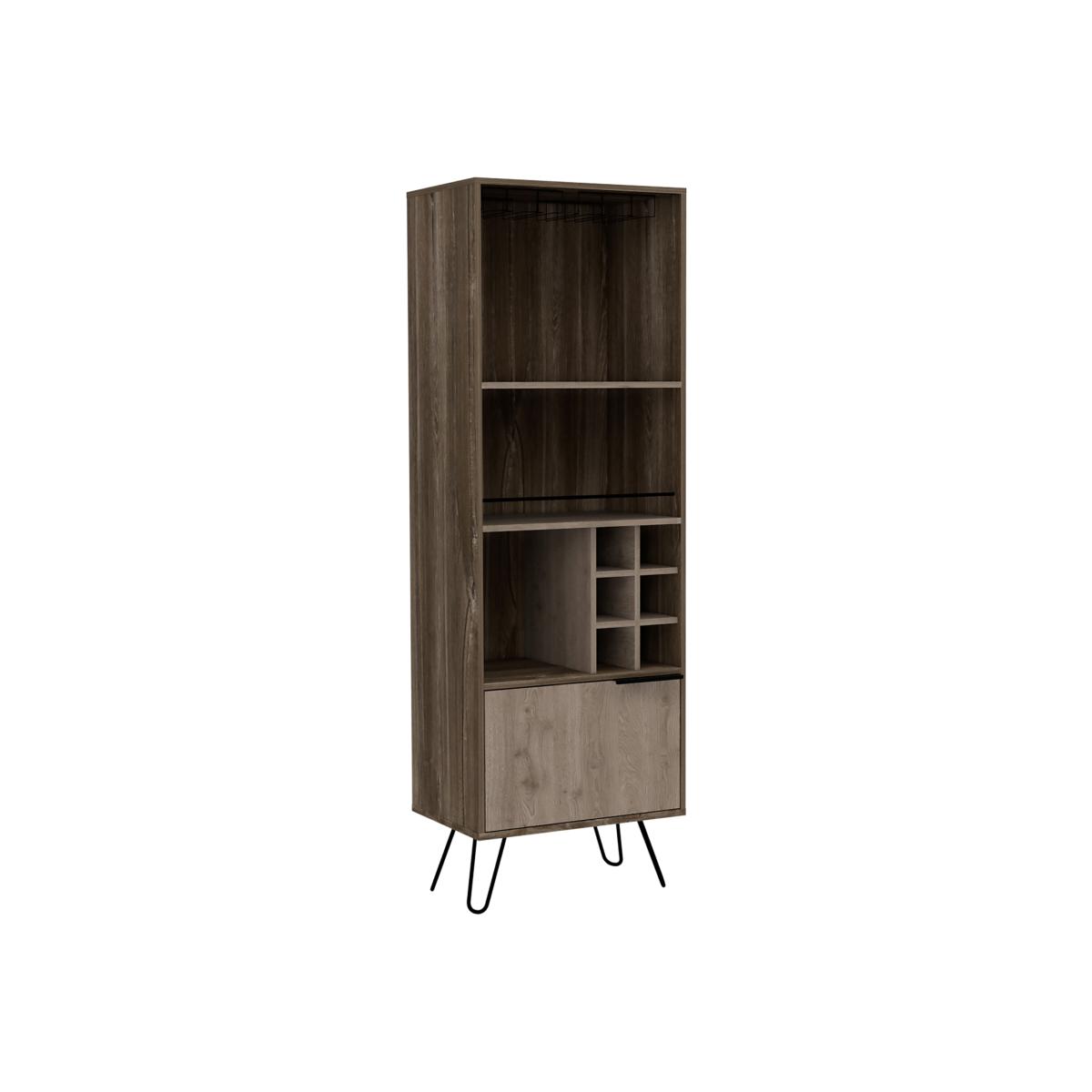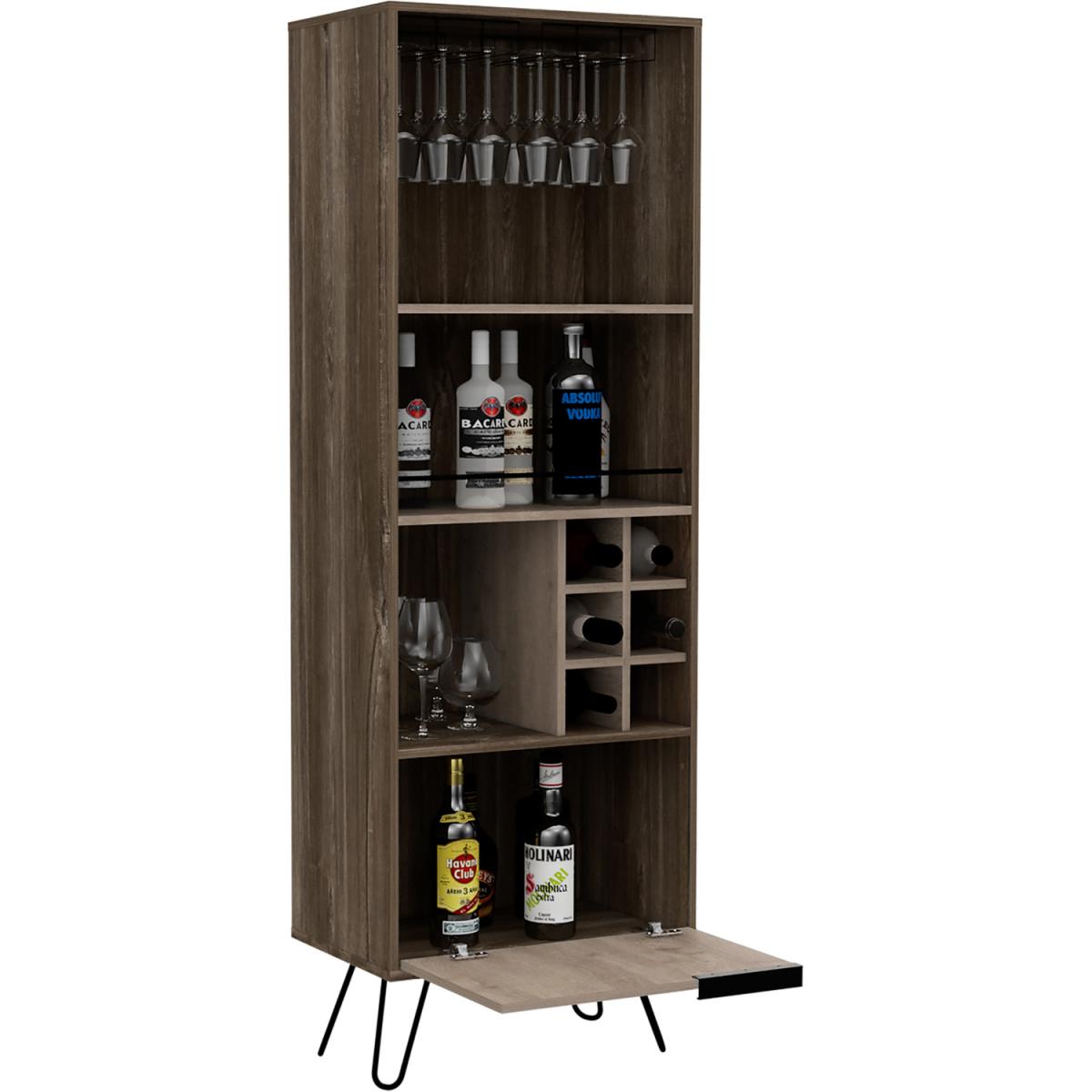 The Nevada collection is designed to give you a fresh outlook on making the most of your home, with innovative pieces which are ideal for todays casual living lifestyle. Each piece is designed to serve a practical purpose and can be used individually or combined with other pieces from our Nevada range for a fully co-ordinated look. Made from hardwearing manufactured boards. An easy to clean woodgrain textured smoked oak effect is used for the cabinets with bleached grey effect for the fronts and coordinating panels. The industrial feel is further accented with real metal black painted grip handles and hairpin legs. Our tall bar cabinet encompasses everything you need in a compact space. From the top you have a metal suspension rack ideal for wine glasses, a contrasting finish shelf for tumblers and a wipe clean shelf which effortlessly works as a servery. It also features a front safety rail to help avoid spilling. You then have an upright bottle storage area alongside 6 bottle racks. The contrasting wide drop down door at the bottom with adjustable hinges conceals even more storage space for you.