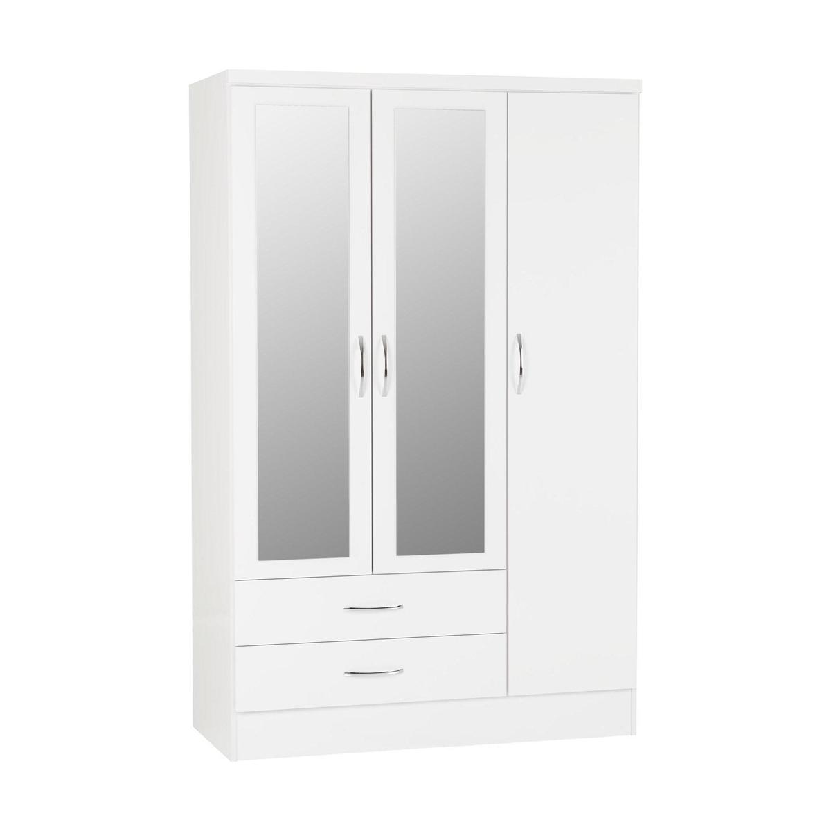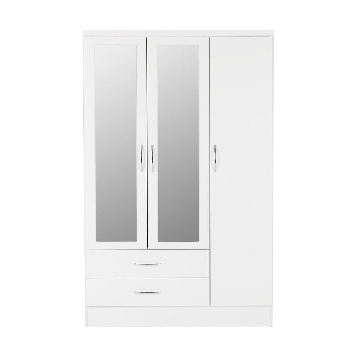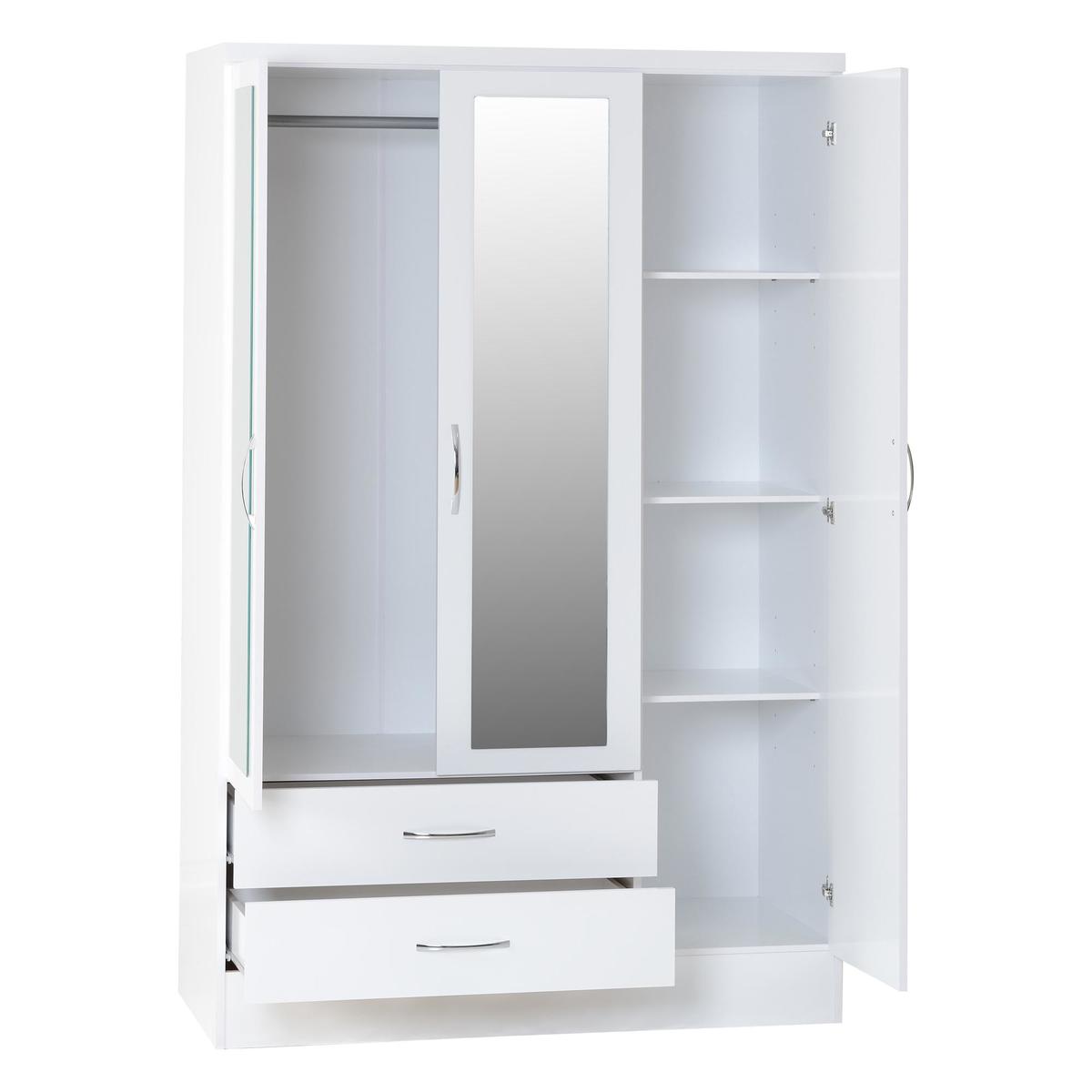 The Nevada Triple 2 Drawer Mirrored Wardrobe features a contemporary design owing to the gloss finished front which contrasts perfectly with the light oak veneers. The Nevada has your storage needs covered thanks to the 2 drawers, top shelf and hanging space from the metal rail. dunelm. com/category/home-and-furniture/furniture/shop-by-collection/nevada-furniture-collection)
