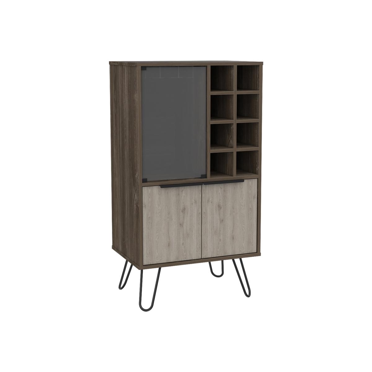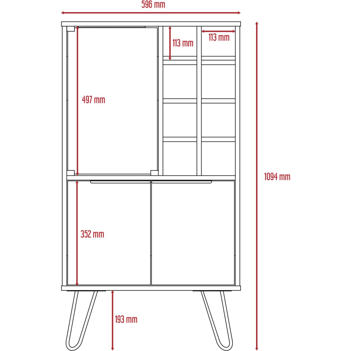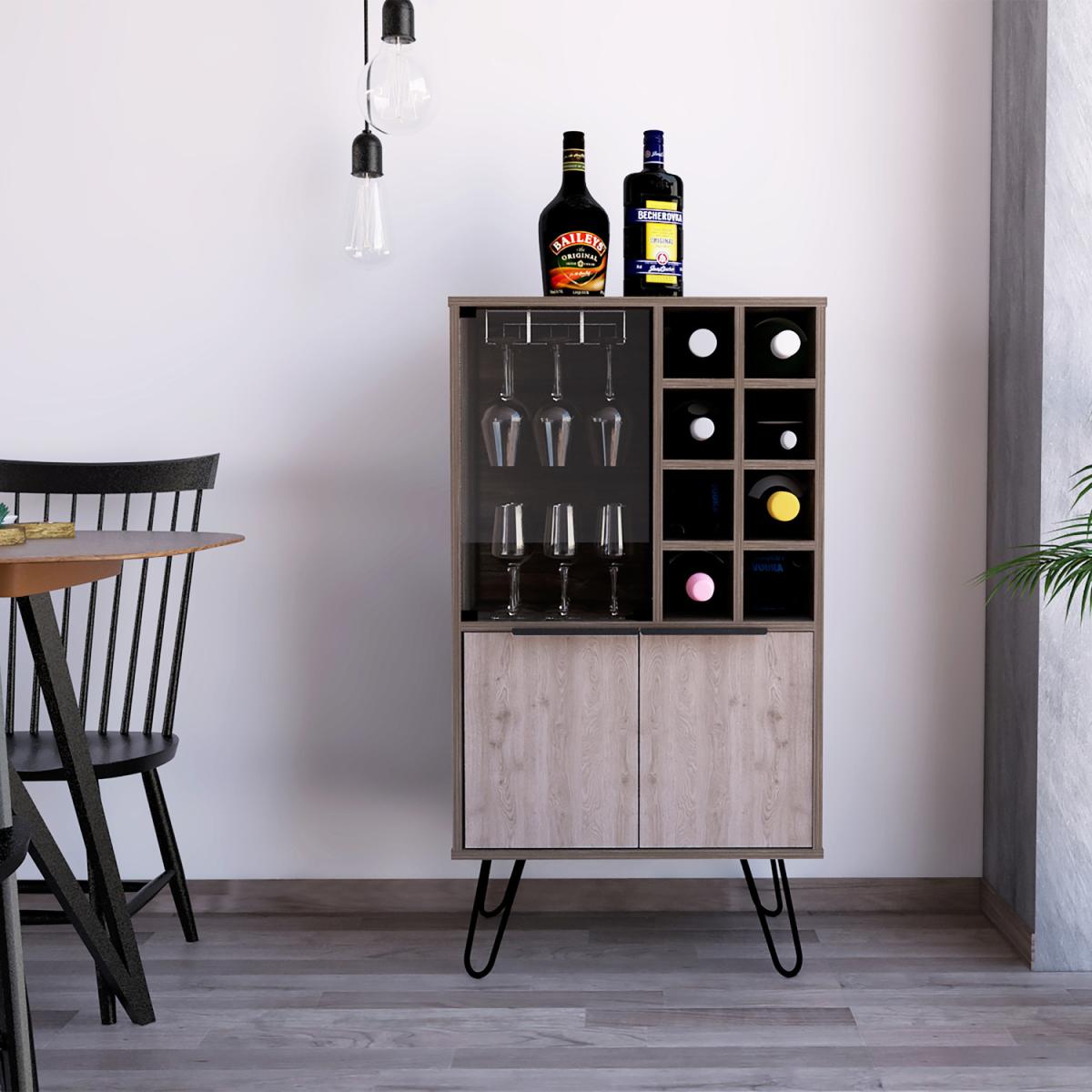 The Nevada collection is designed to give you a fresh outlook on making the most of your home, with innovative pieces which are ideal for todays casual living lifestyle. Each piece is designed to serve a practical purpose and can be used individually or combined with other pieces from our Nevada range for a fully co-ordinated look. Made from hardwearing manufactured boards. An easy to clean woodgrain textured smoked oak effect is used for the cabinets with bleached grey effect for the fronts and coordinating panels. The industrial feel is further accented with real metal black painted grip handles and hairpin legs. This drinks bar offers you an ideal place to store glasses, bottles and anything you need to get the party started. Open bottle storage slots sit alongside an enclosed display area, ideal for glassware, to keep everything clean and tidy there is a glass door with discreet handle and adjustable hinges. Underneath two doors conceal a cupboard which provides plenty of space for more storage.