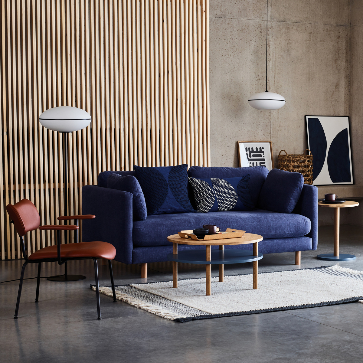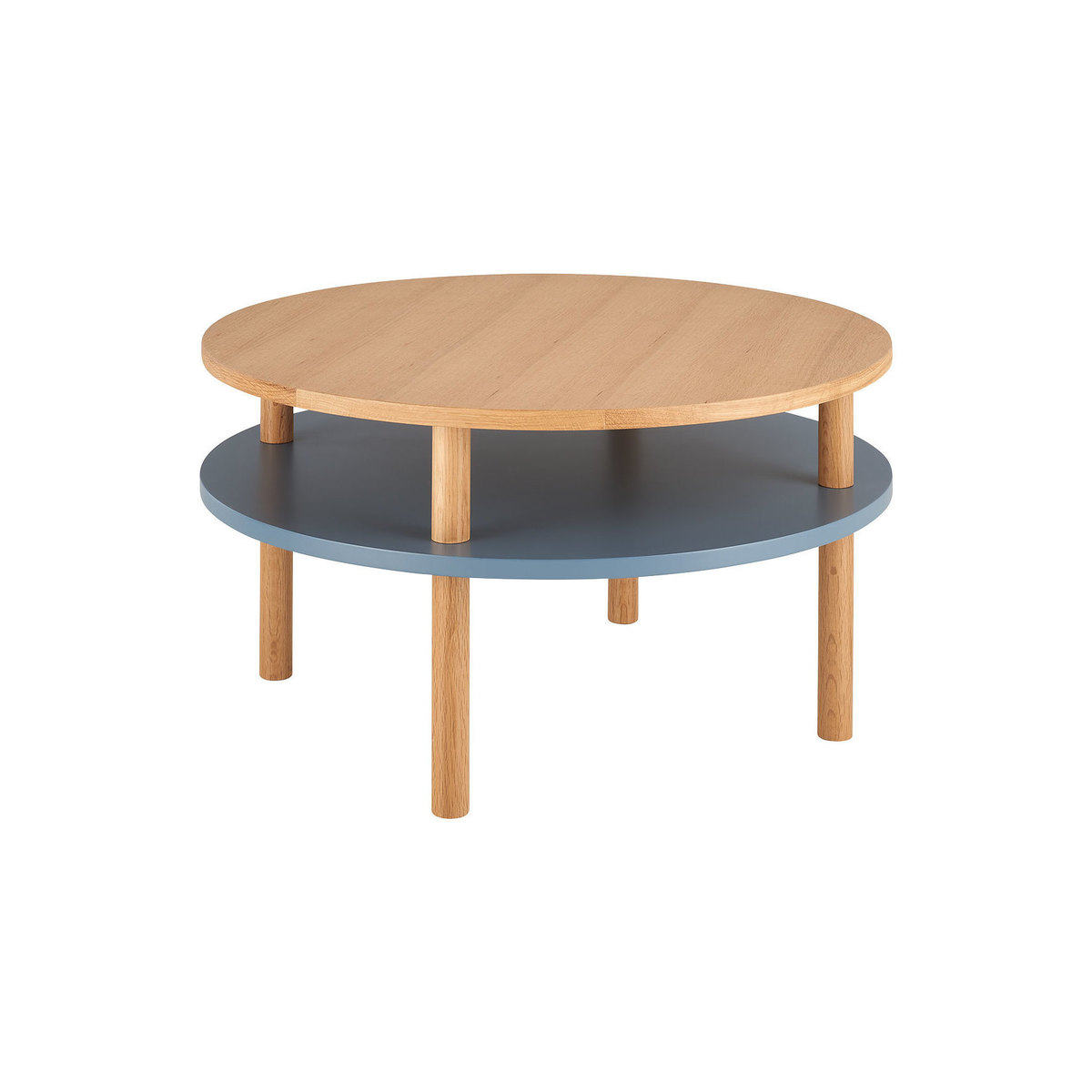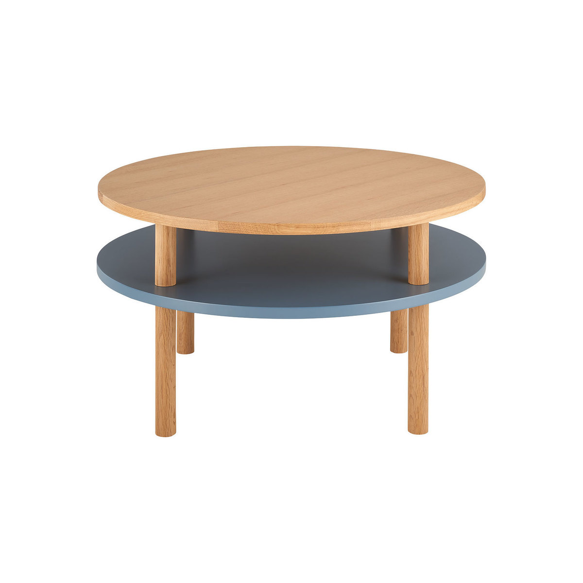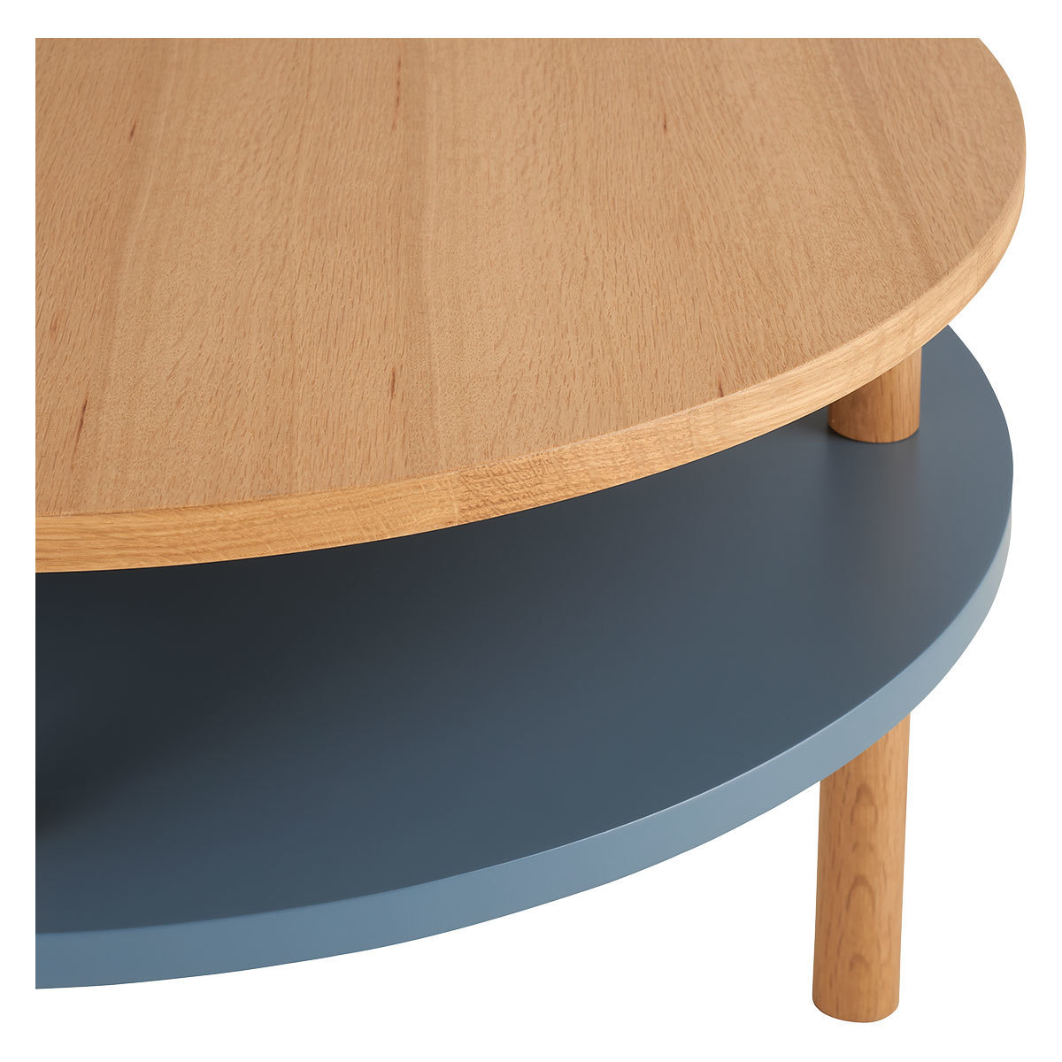 Cool and clever, the Neville blue and oak coffee table lends storage and style to any space. The design is elevated on 4 solid oak legs creating a lightweight look which gives the illusion of more space. It’s two-tiered, rounded profile features an oak veneer top and a lower shelf which is perfect for storing magazines and books. Fusing together minimalist design with solid, sturdy materials, the coffee table will make a stylish addition to your living room and its warming tones fit both bold and pared-back colour schemes.