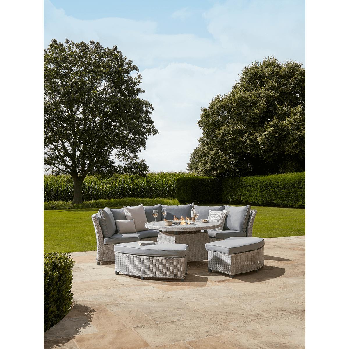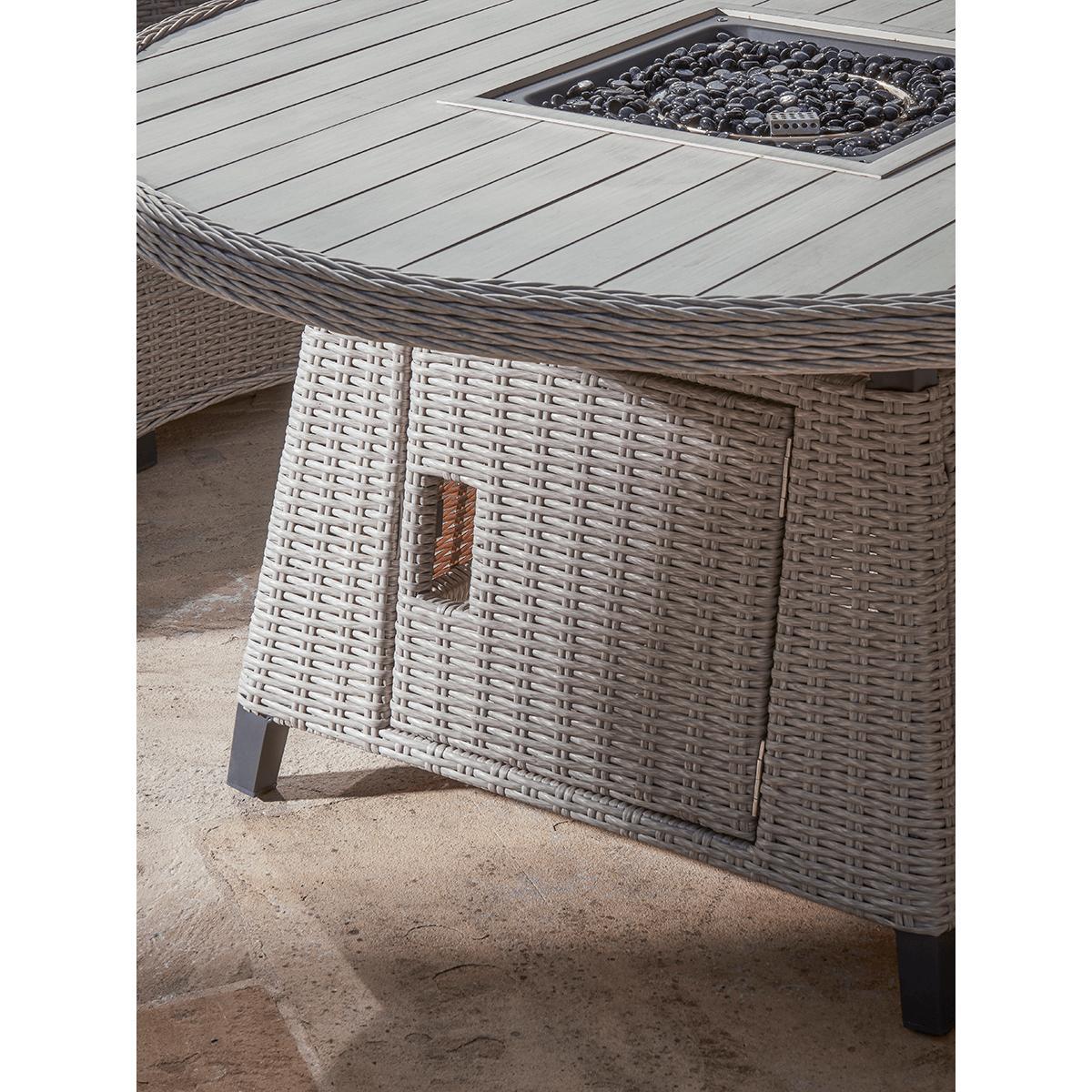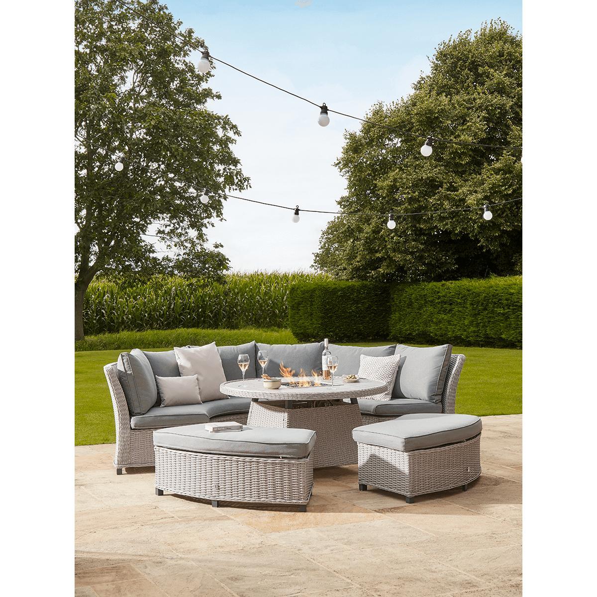The ultimate way to extend your living space into the. Garden. , our Antibes Dining Set, with its inbuilt firepit, is sure to become the focal point of all your parties, whatever the season. The pale faux wicker weave of the seating provides a Scandi feel that chimes perfectly as the sun goes down and you gather family and friends around the gas firepit to keep cosy. The circular aluminium tabletop gives the appearance of natural wood, with none of the upkeep. There is a cubby hole in the table base to store away the gas cannister, and the firepit is surrounded by a glass guard, which still leaves room for drinks and nibbles. The seating includes a crescent shaped sofa, made up of two halves, and two benches. View our useful. Outdoor Furniture Buying Guide.