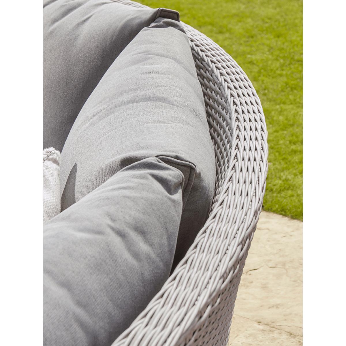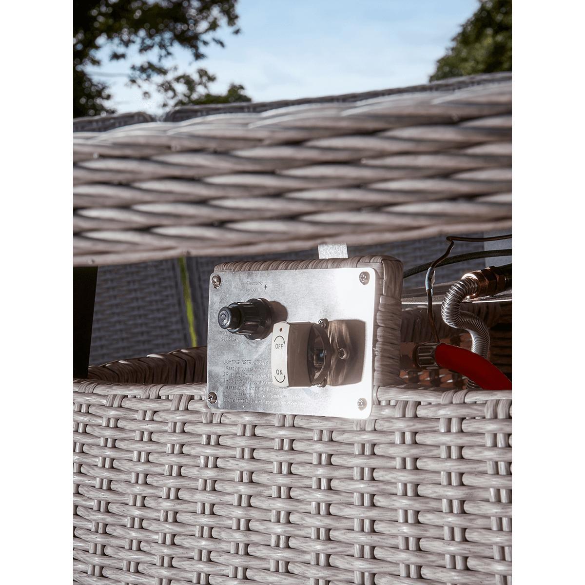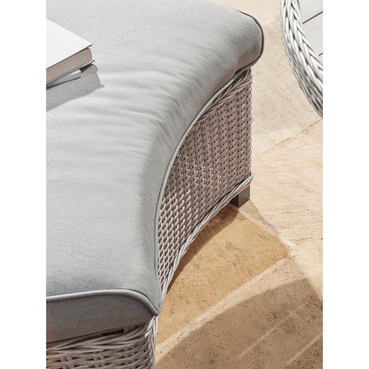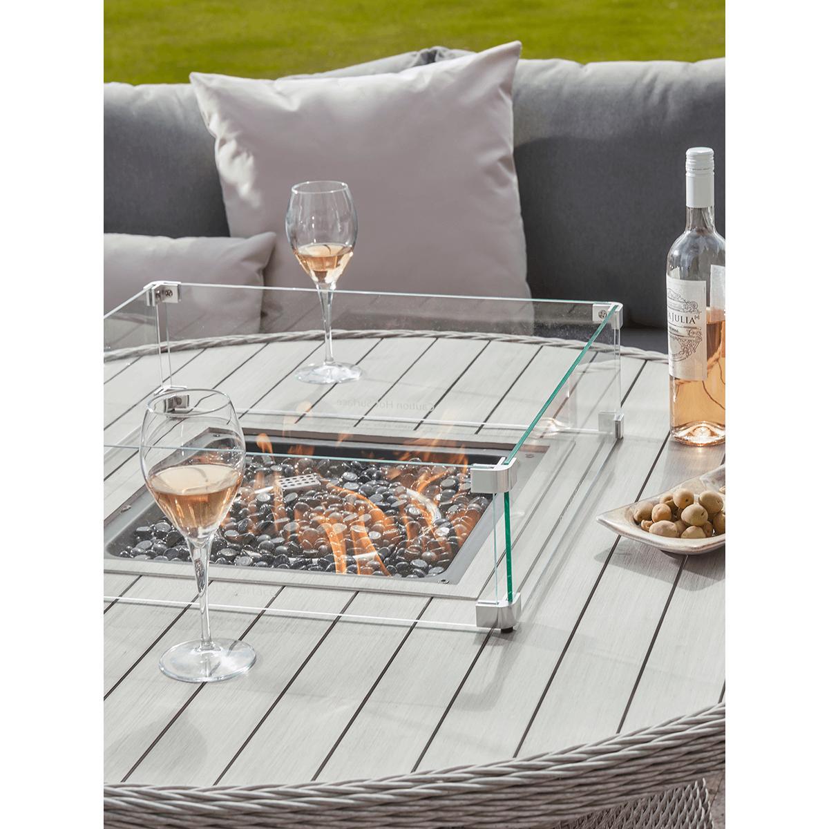 The ultimate way to extend your living space into the. Garden. , our Antibes Dining Set, with its inbuilt firepit, is sure to become the focal point of all your parties, whatever the season. The pale faux wicker weave of the seating provides a Scandi feel that chimes perfectly as the sun goes down and you gather family and friends around the gas firepit to keep cosy. The circular aluminium tabletop gives the appearance of natural wood, with none of the upkeep. There is a cubby hole in the table base to store away the gas cannister, and the firepit is surrounded by a glass guard, which still leaves room for drinks and nibbles. The seating includes a crescent shaped sofa, made up of two halves, and two benches. View our useful. Outdoor Furniture Buying Guide.