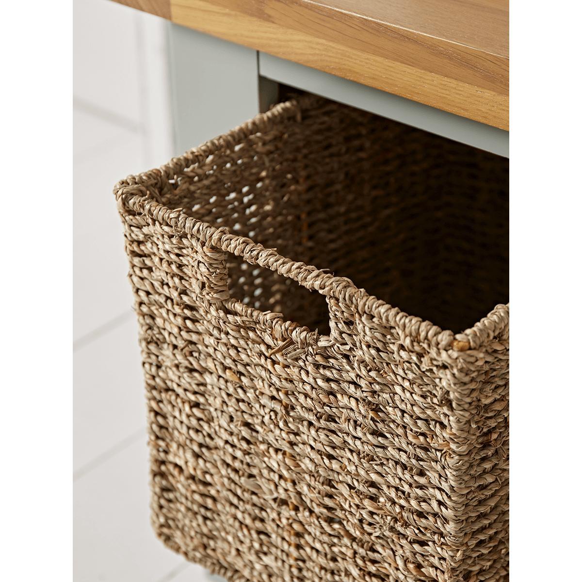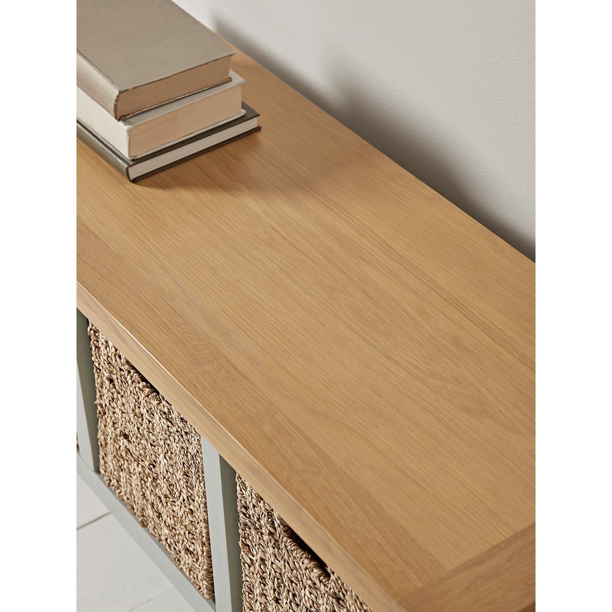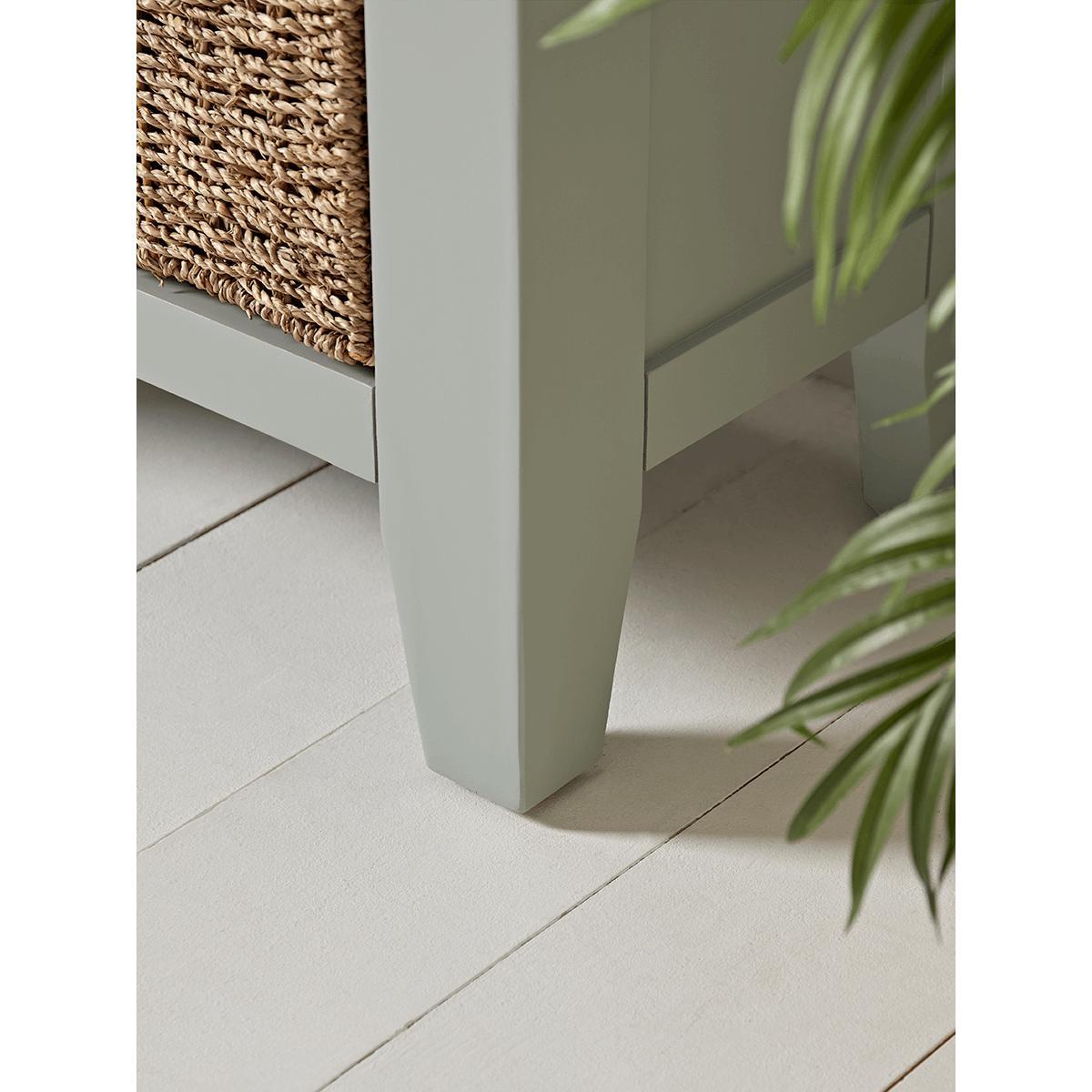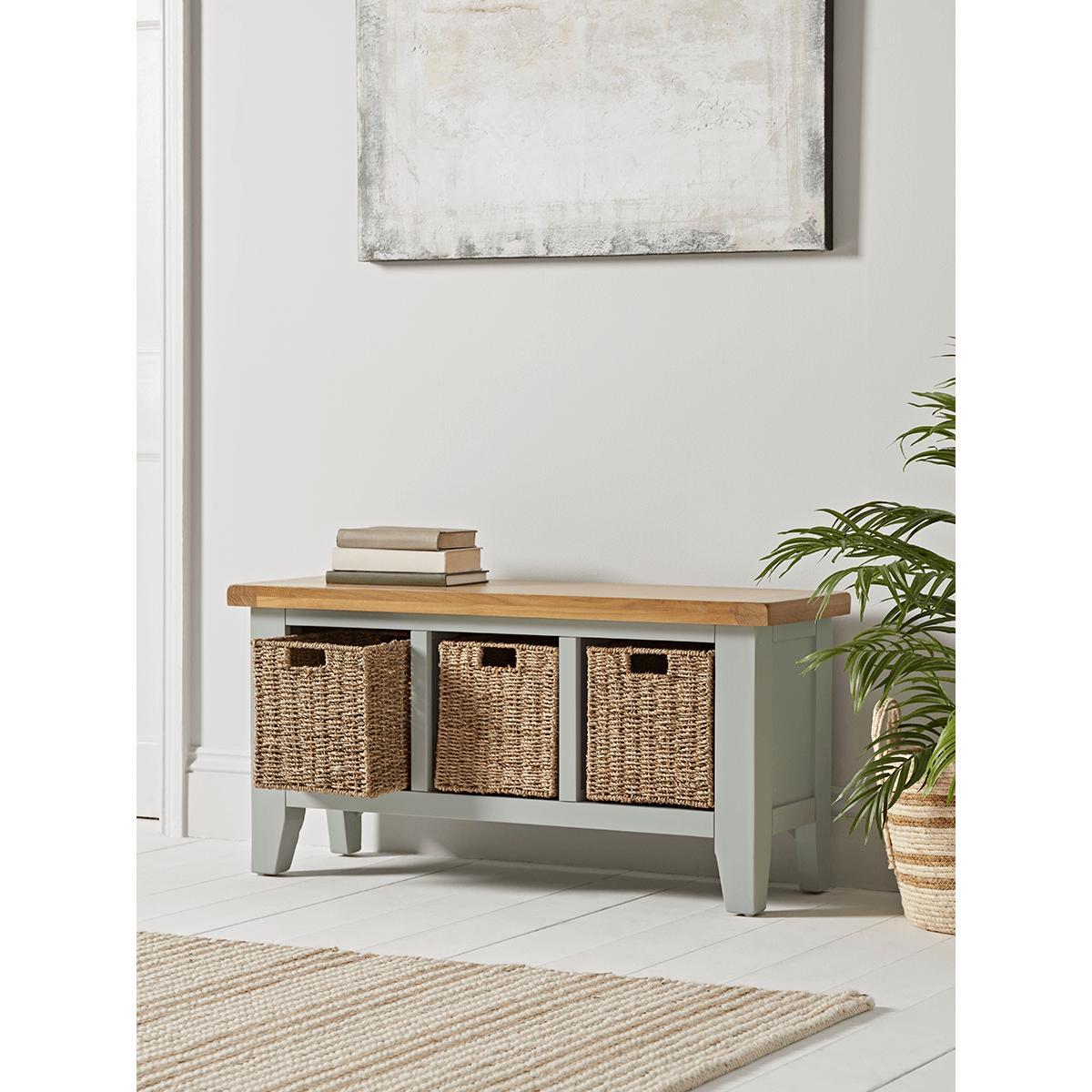 The Bibury Storage Bench will make short work of your hallway or boot room clutter with its three capacious seagrass storage baskets which slide neatly into their respective cubby holes. The blue-grey painted base doesn’t commit too much to colour and the oak seat will bring a touch of. Modern Rustic. Comfort to any home. The Bibury range also includes a. Low bookcase. , a. Narrow bookcase. And a. Bench seat.