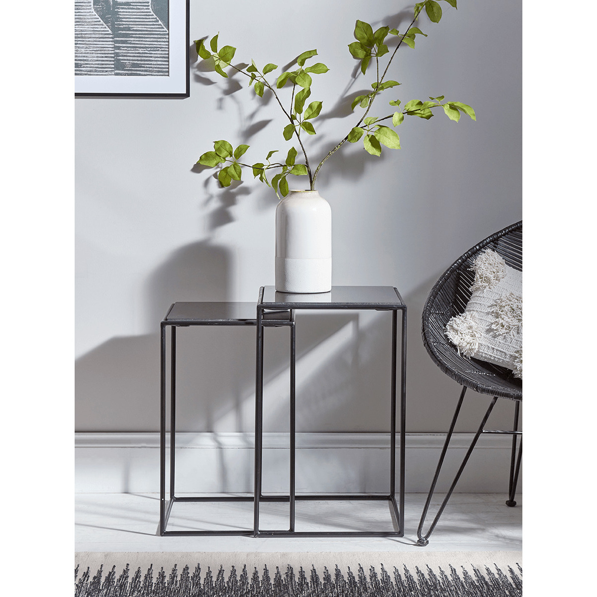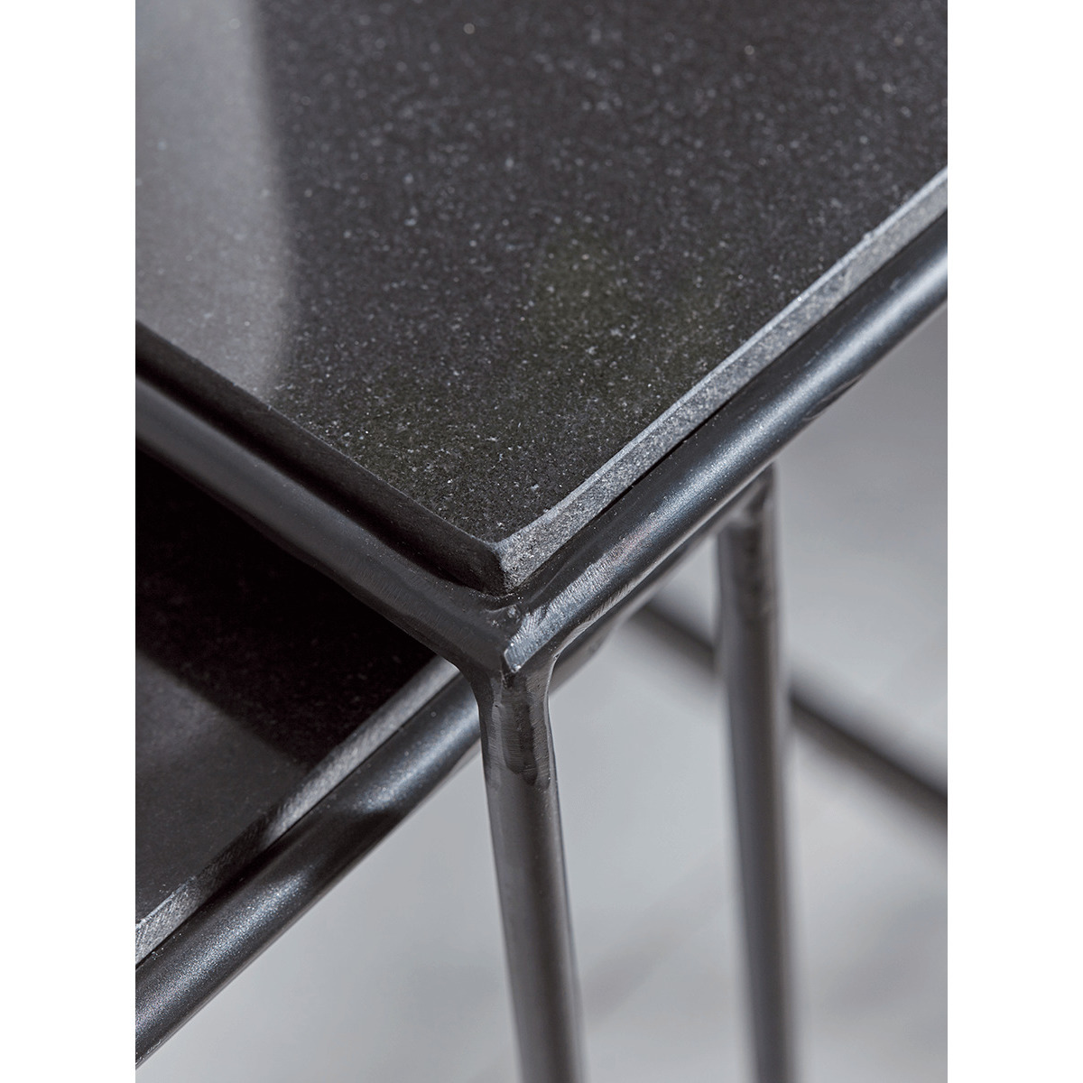 Our pair of nesting tables have a slender frame made of dark toned iron and a table top crafted from granite which strikes an industrial tone without impressing too heavily on your space. A versatile piece of furniture that will serve your living space well when extra surfaces are needed, or that might be used as bedside tables.