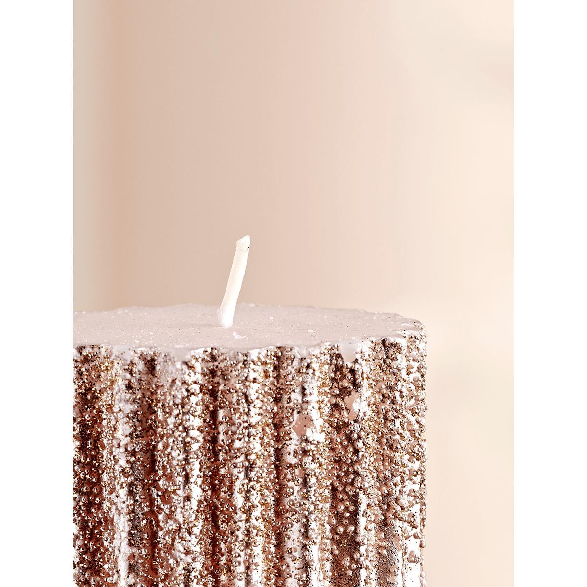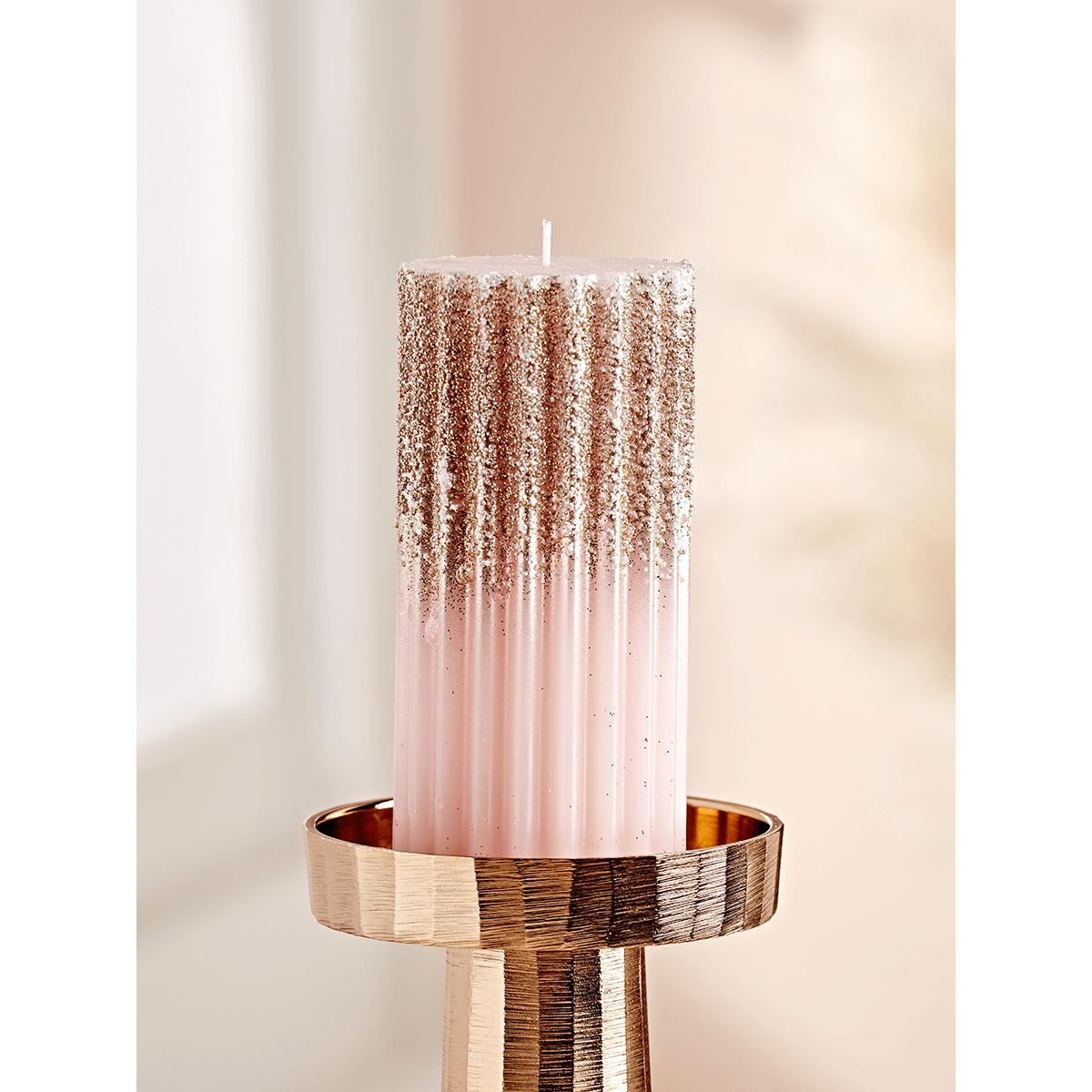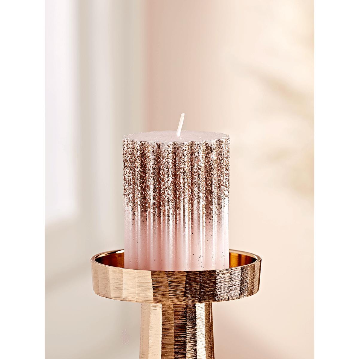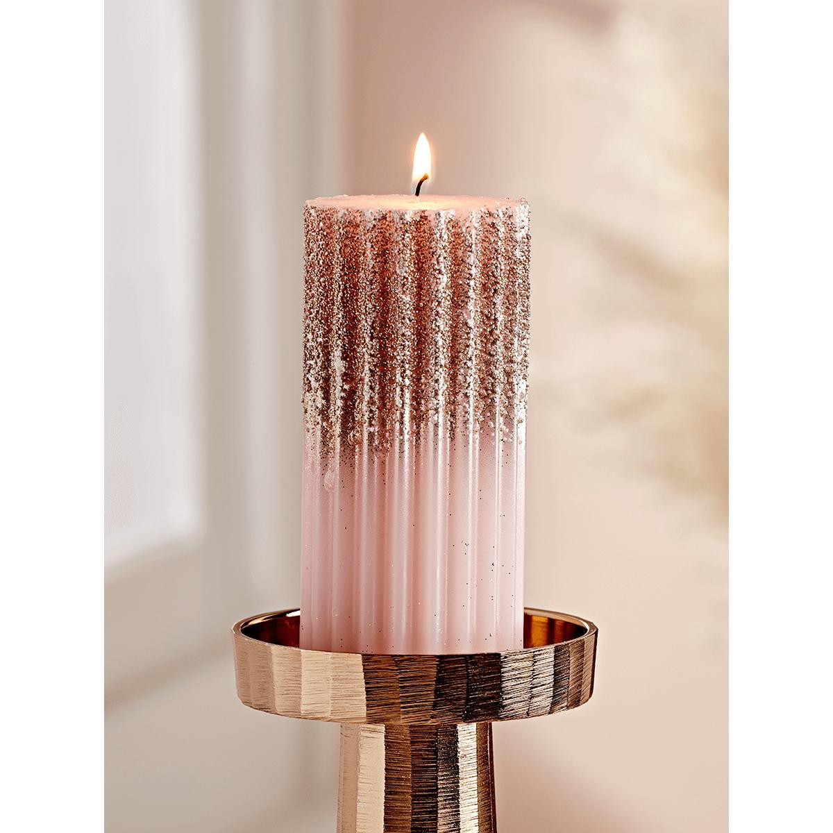 I love this large blush glittered pillar for bringing a touch of glamour to both contemporary and romantic interiors. Its soft pink hue and subtle shimmer make it versatile enough to work well in living rooms, bedrooms, or even bathrooms, adding a gentle glow without overpowering the space. To style it effectively, consider pairing with minimal accessories or placing it on a sleek tray with complementary candles or flowers for an elegant vignette. For a modern look, position it on metallic or glass surfaces; for a cosier feel, nestle it among plush textiles or natural elements like wood or stone. This piece is perfect for creating a calming yet luxe atmosphere, especially when lit in the evening.