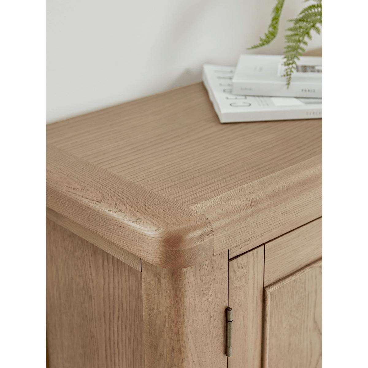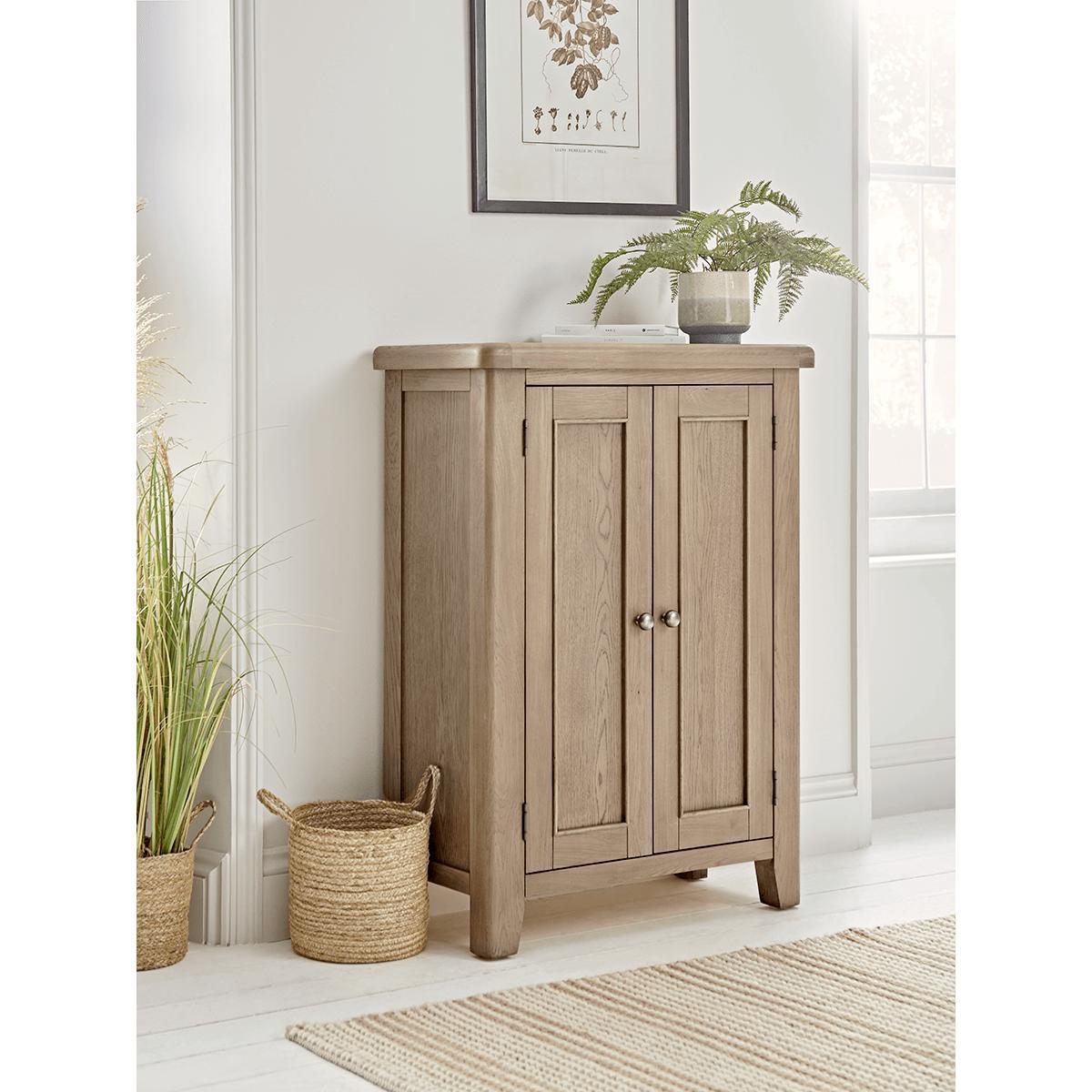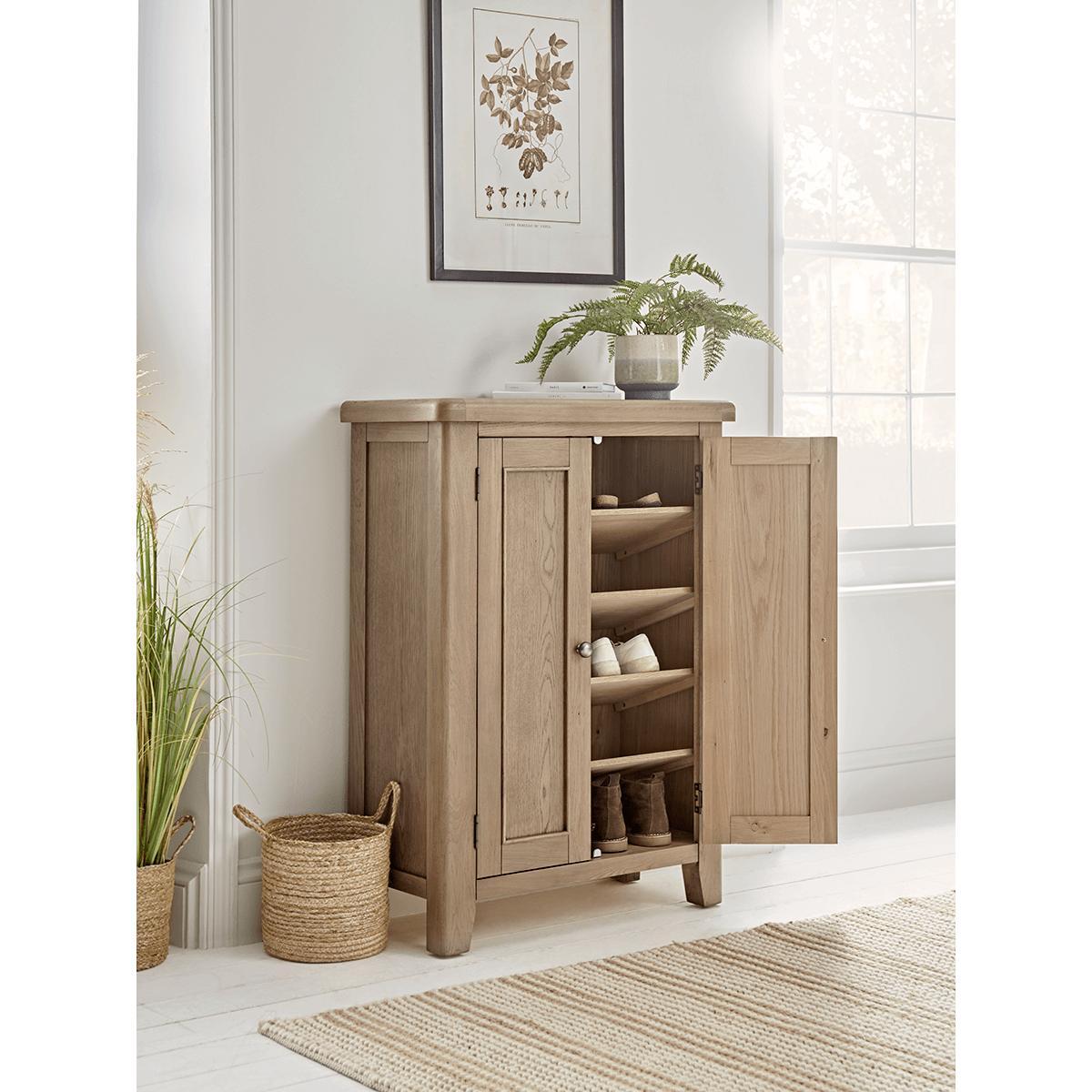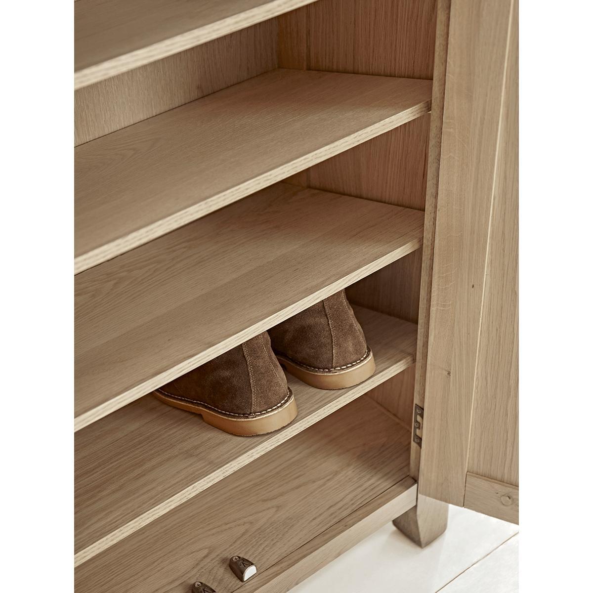 Rid the hallway of the clutter of abandoned shoes once and for all with our Burford Oak Shoe Cupboard. Both practical and stylish, this neat cupboard with its sloping interior shelves, provides ample. Storage. Space for all the family’s footwear. Even the busiest area of the house will have an air of serenity once the trainers, boots and school shoes are out of sight behind closed doors. The top of the cupboard even provides space to display a. Plant. Or. Ornament. With its natural wood finishes, laid back styling and farmhouse charm, our Burford Oak furniture range perfectly encapsulates all the aesthetics of our. Modern Rustic. Trend.