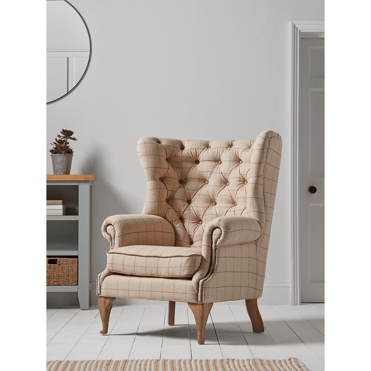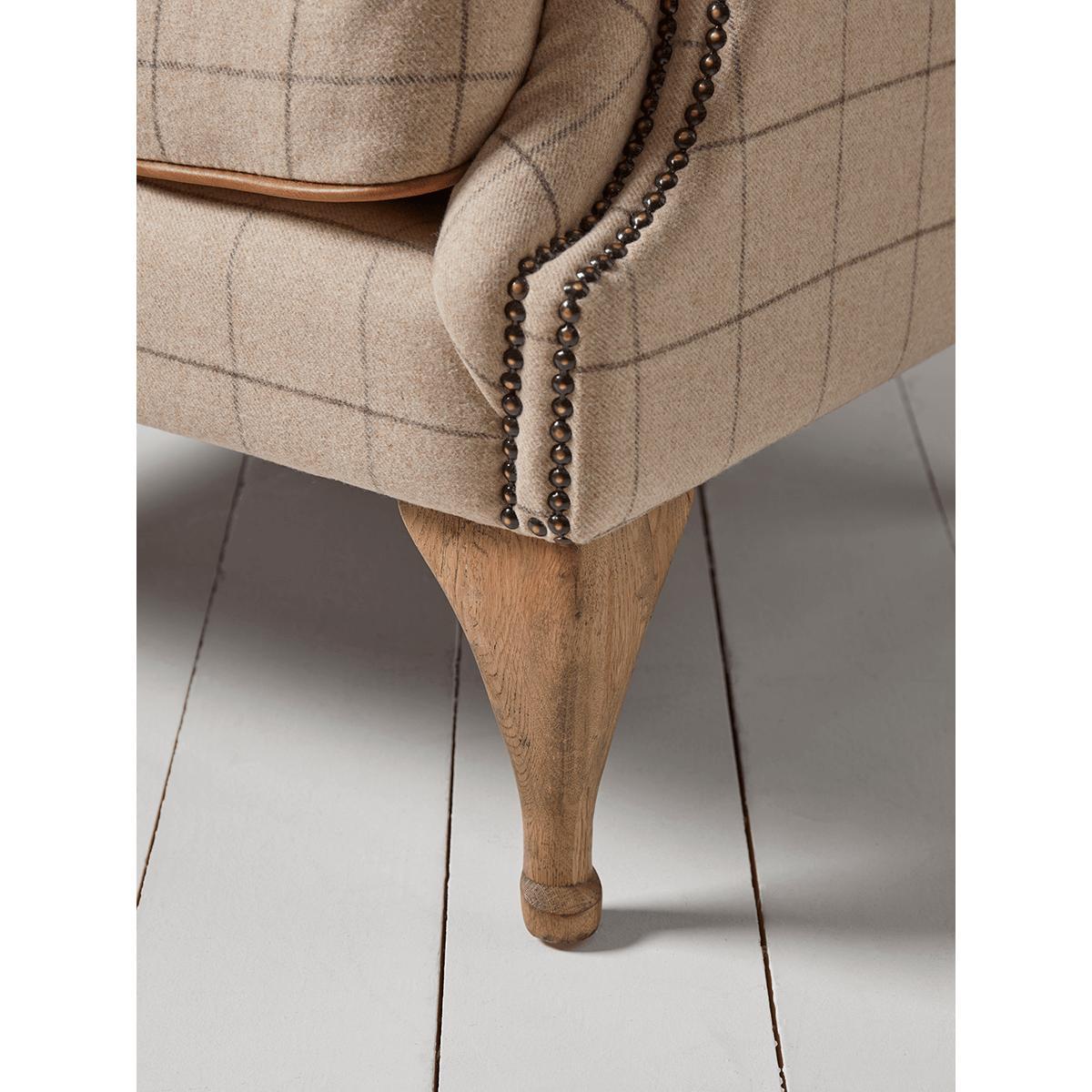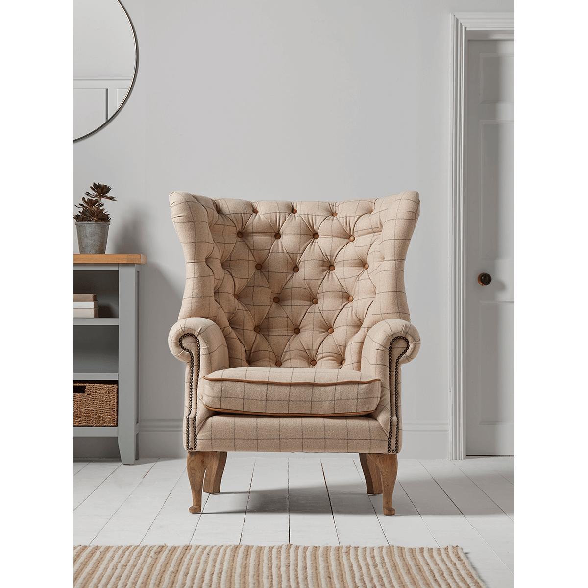 In a bold 100% wool windowpane check, with piping and buttons in contrasting Italian leather, this deeply upholstered Button Back Winged Armchair will offer great comfort as it curves around you on cosy nights in. The scroll arms are highlighted by a traditional nail head trim and carved oak legs complete the timeless appeal of this opulent seat.