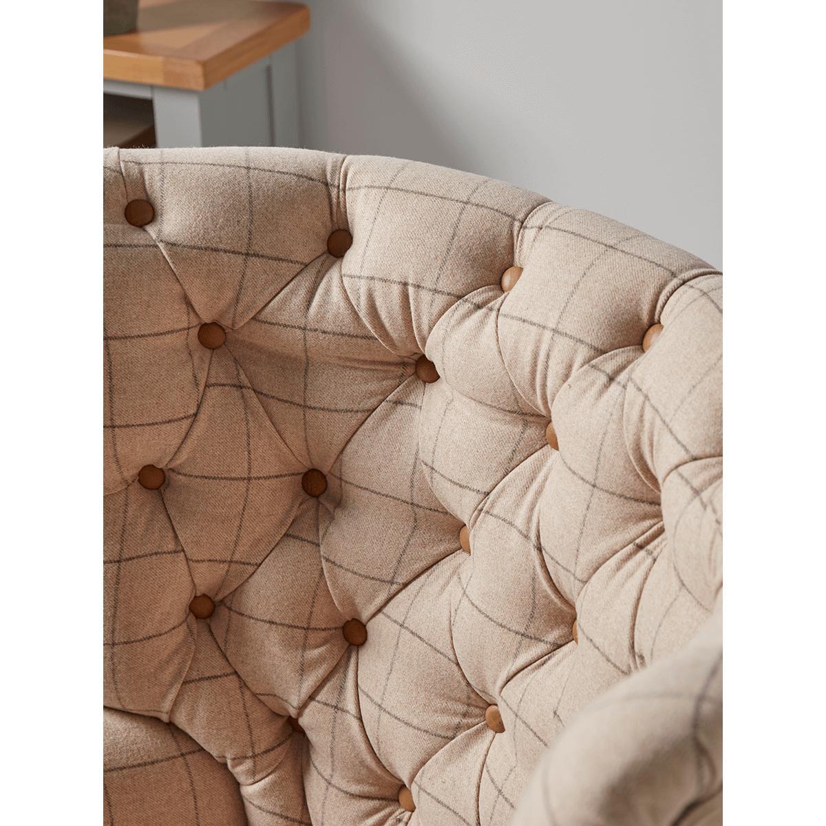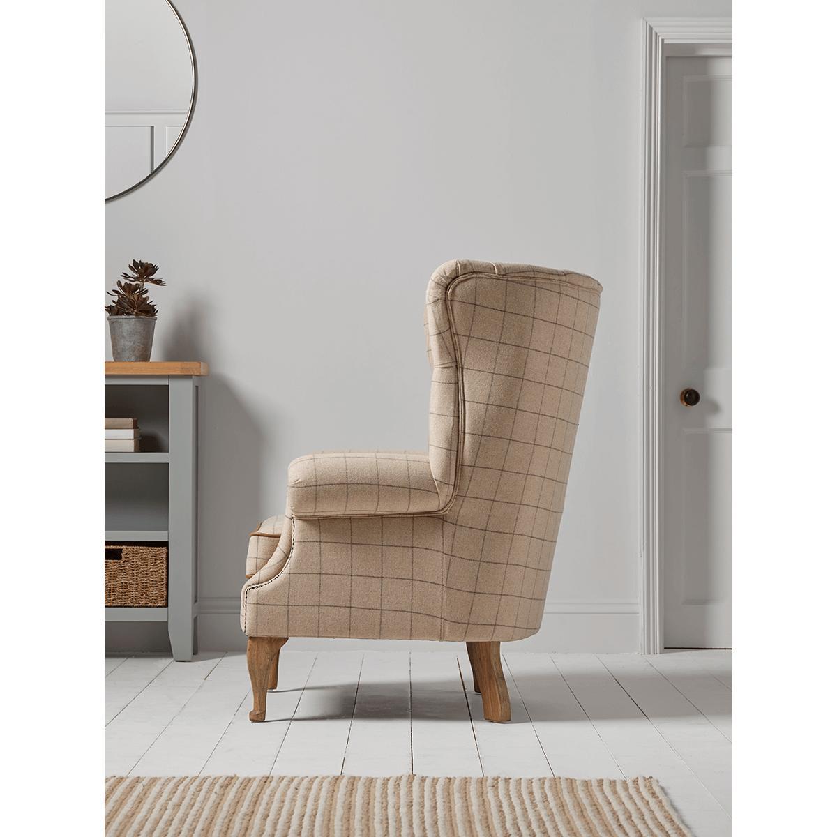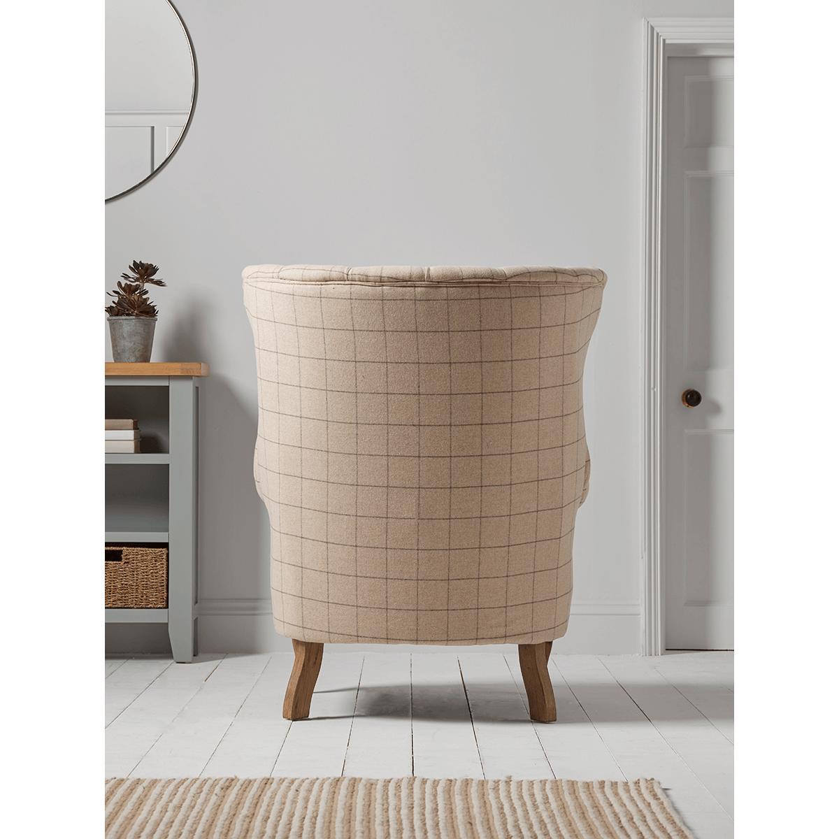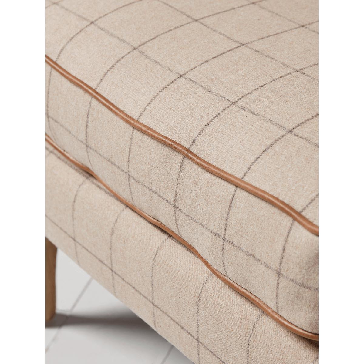 In a bold 100% wool windowpane check, with piping and buttons in contrasting Italian leather, this deeply upholstered Button Back Winged Armchair will offer great comfort as it curves around you on cosy nights in. The scroll arms are highlighted by a traditional nail head trim and carved oak legs complete the timeless appeal of this opulent seat.