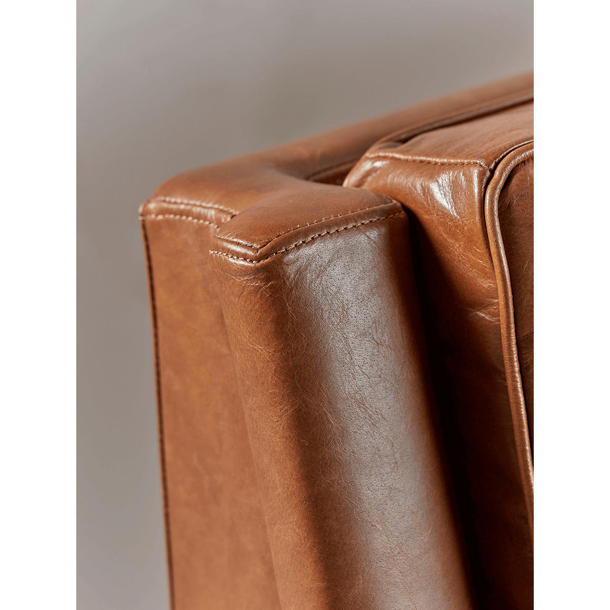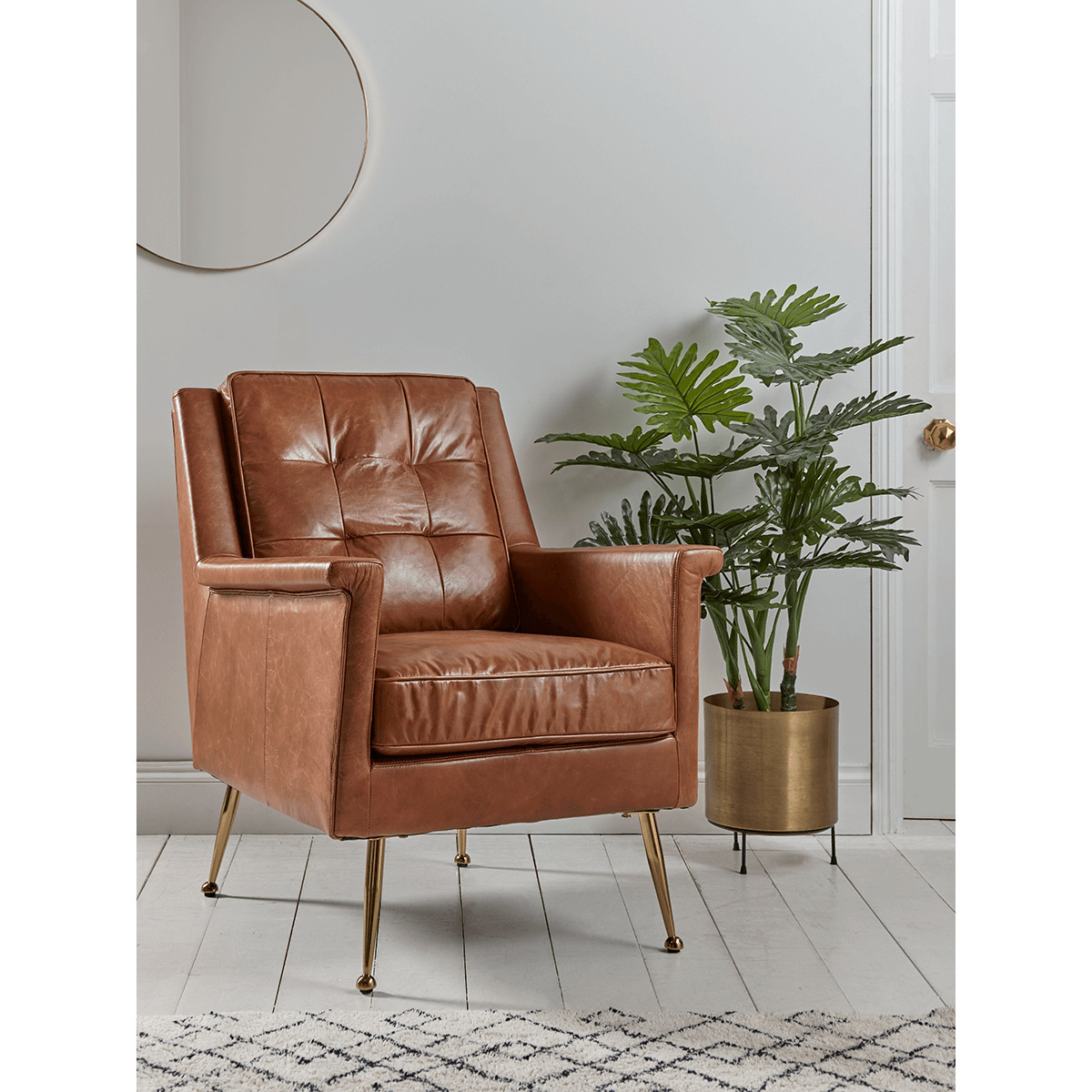 A striking tan leather armchair, with a mid-century styled silhouette by a reclined backrest and structured slender arm. Brass tapered legs finish the look whilst a sumptuous leather upholstered seat and backrest cushion provide the most comfortable seat to relax.