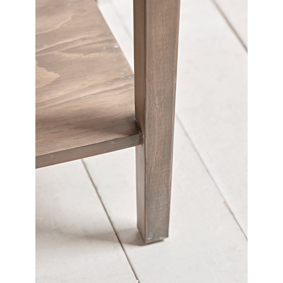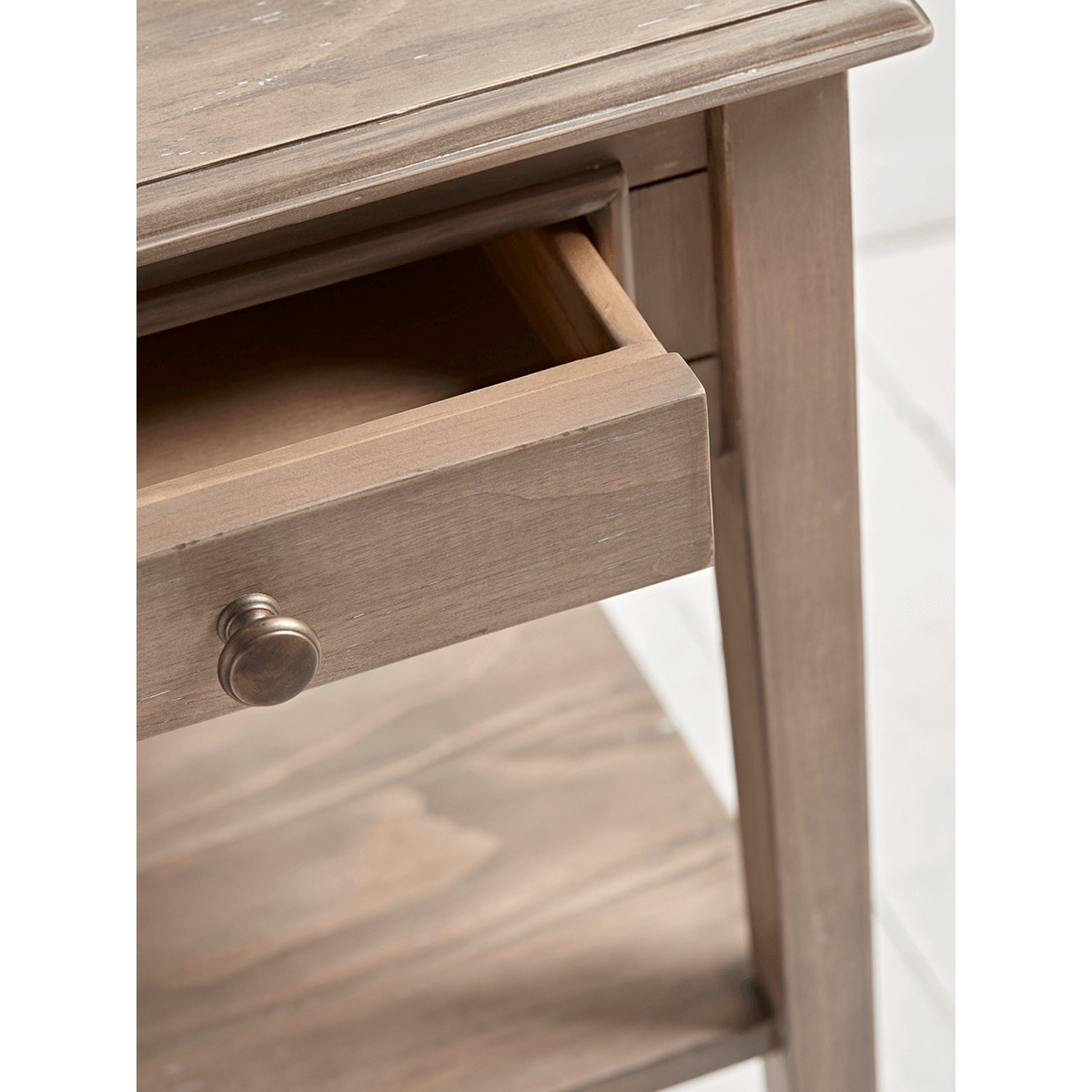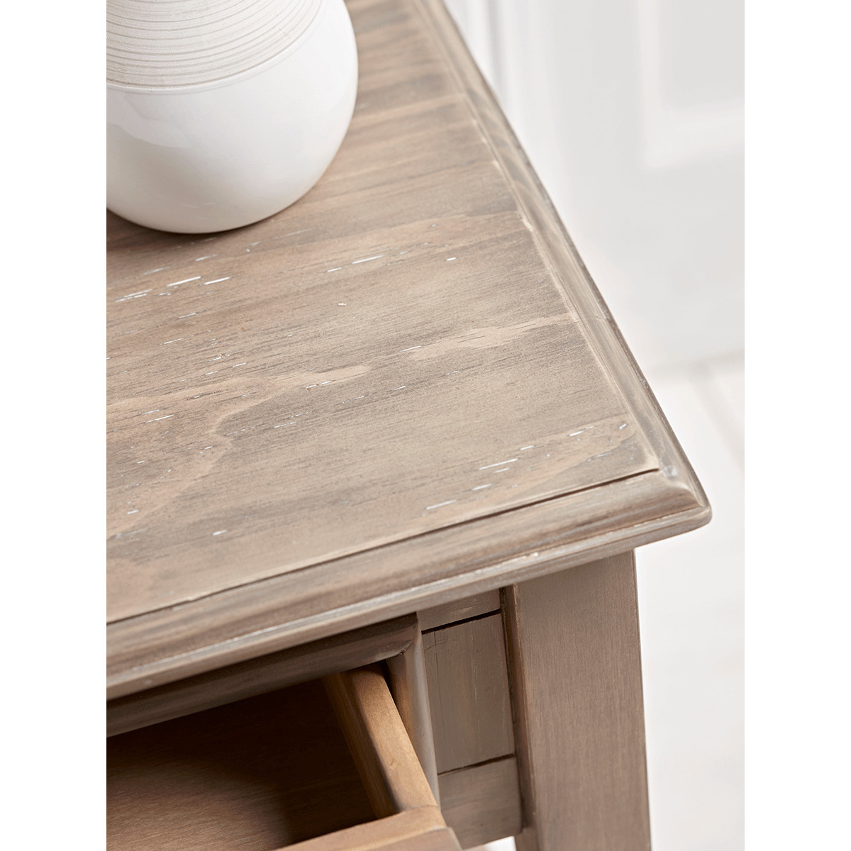 With a lime wash finish and a slender drawer with a simple round metal handle, our elegant Camille table is the perfect way to store essentials at your bedside. Each has a handy shelf for extra storage, and fits snugly against your wall. A matching. Chest of Drawers. Is available, and the our bedside table is also available in. Grey.