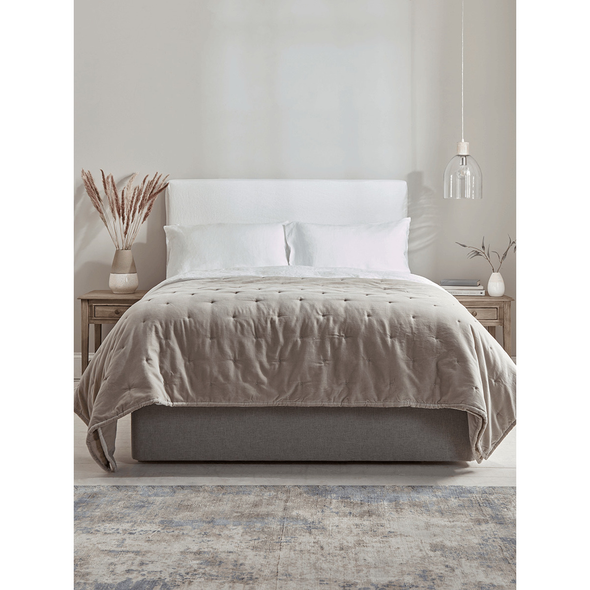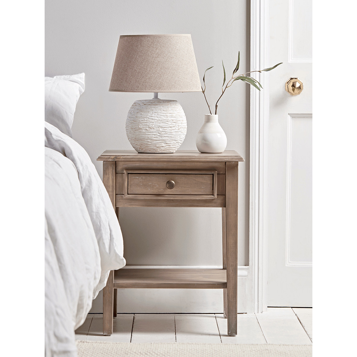 I really like how the limewashed finish on this bedside table brings a softly weathered look without feeling too rustic, and its compact size makes it ideal for both small city flats and more relaxed coastal bedrooms. The simple lines and single drawer suit Scandi, modern farmhouse or pared-back contemporary schemes, and the neutral tone will sit comfortably alongside muted greys, soft blues or fresh whites. For styling, keep the top surface uncluttered with just a low-profile lamp and a small ceramic vase or a stack of two or three coffee-table books. Use the shelf underneath for a woven basket to hide bedtime essentials, or fold a spare throw in a complementary colour. Pay attention to height - your lamp shade should sit around eye level when you’re in bed - and don’t be afraid to add a touch of greenery for a fresh finish.