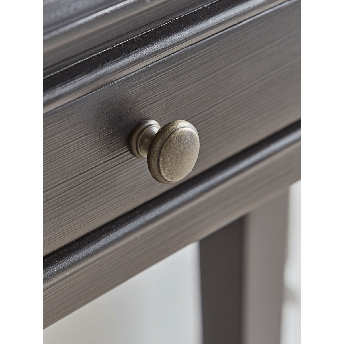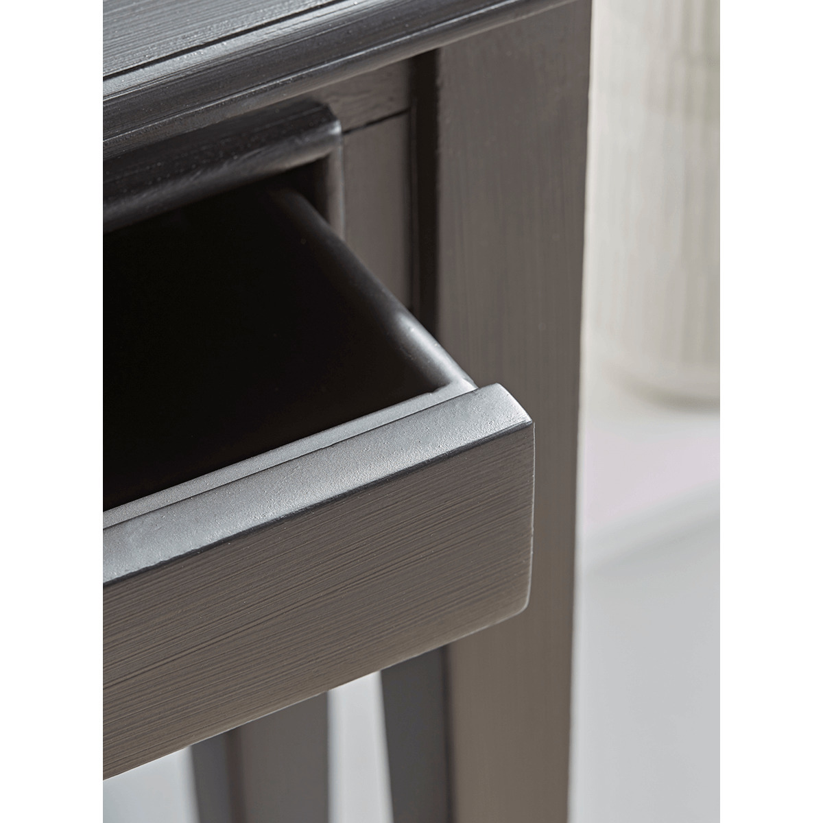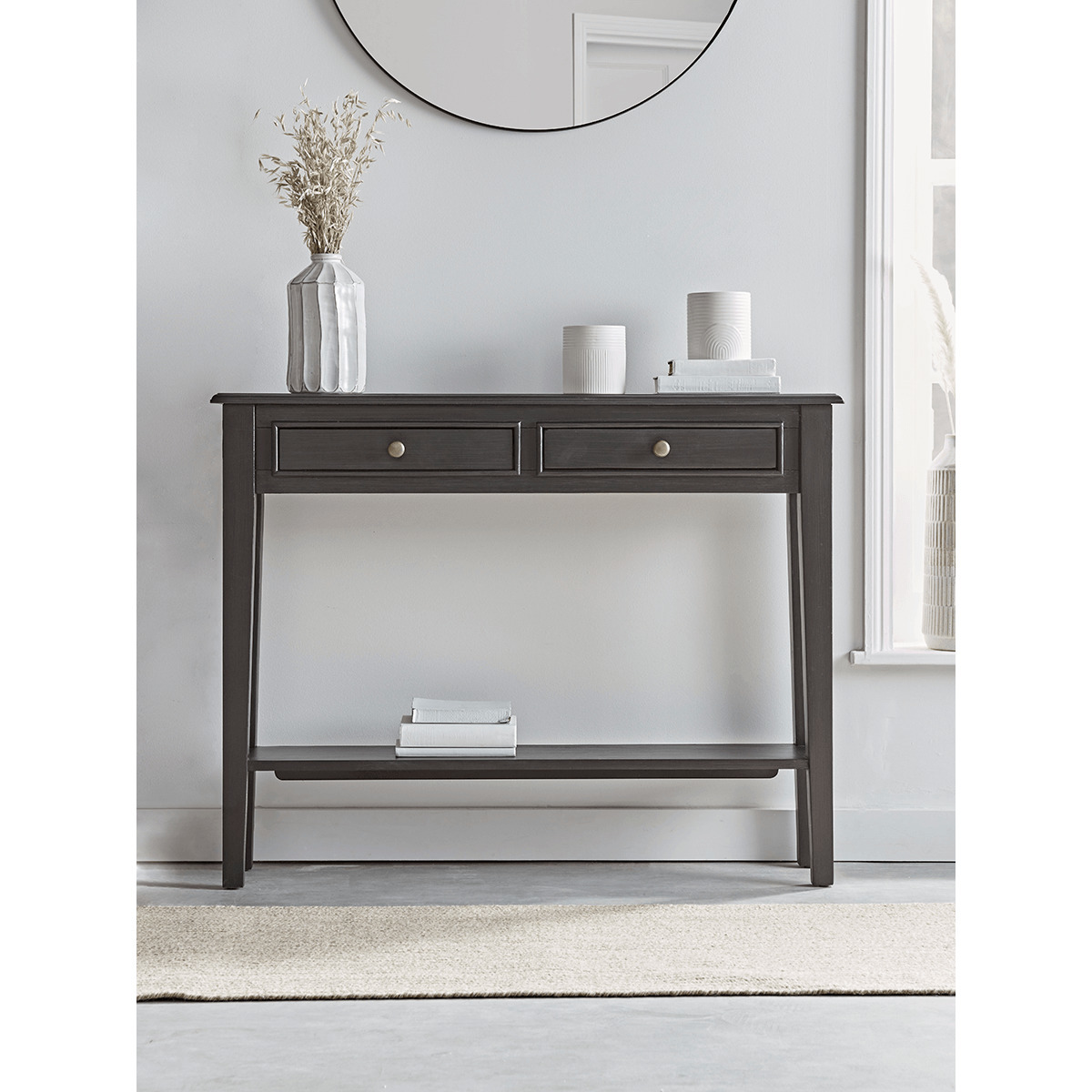 The enduring elegance of our Camille Console table will ensure it is a much admired addition to your hallway or living room for years to come. The slender lines of the table allow it to fit snuggly against your wall and there are two drawers, perfect for hiding away keys and other essentials. Team with a statement table lamp or place beneath a dramatic mirror for maximum impact. Shown here in a striking dark painted finish, ideal for both contemporary and classic settings.