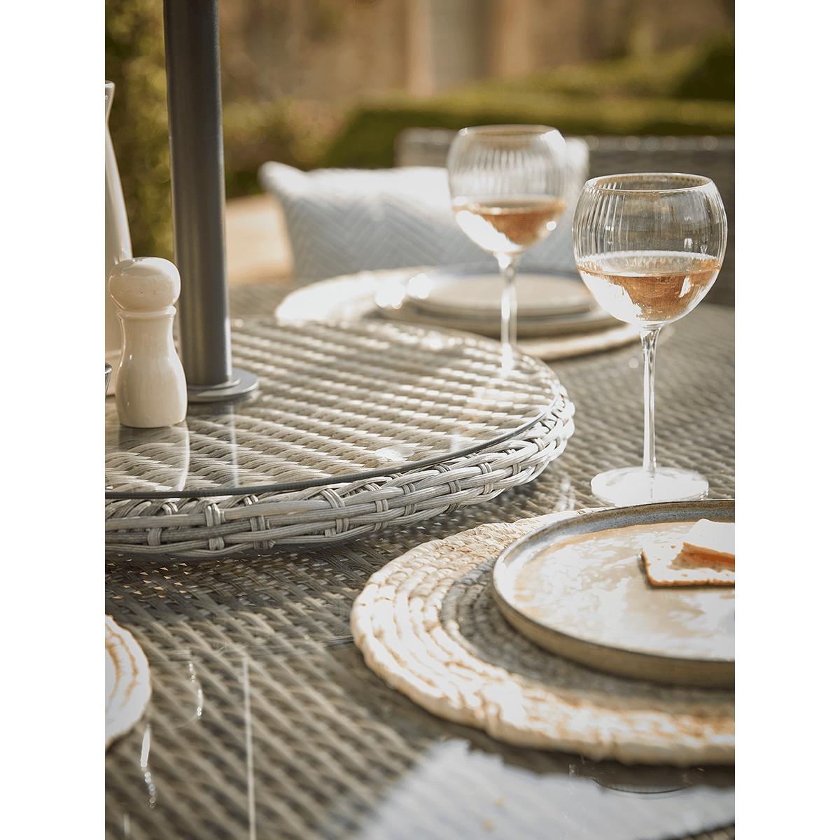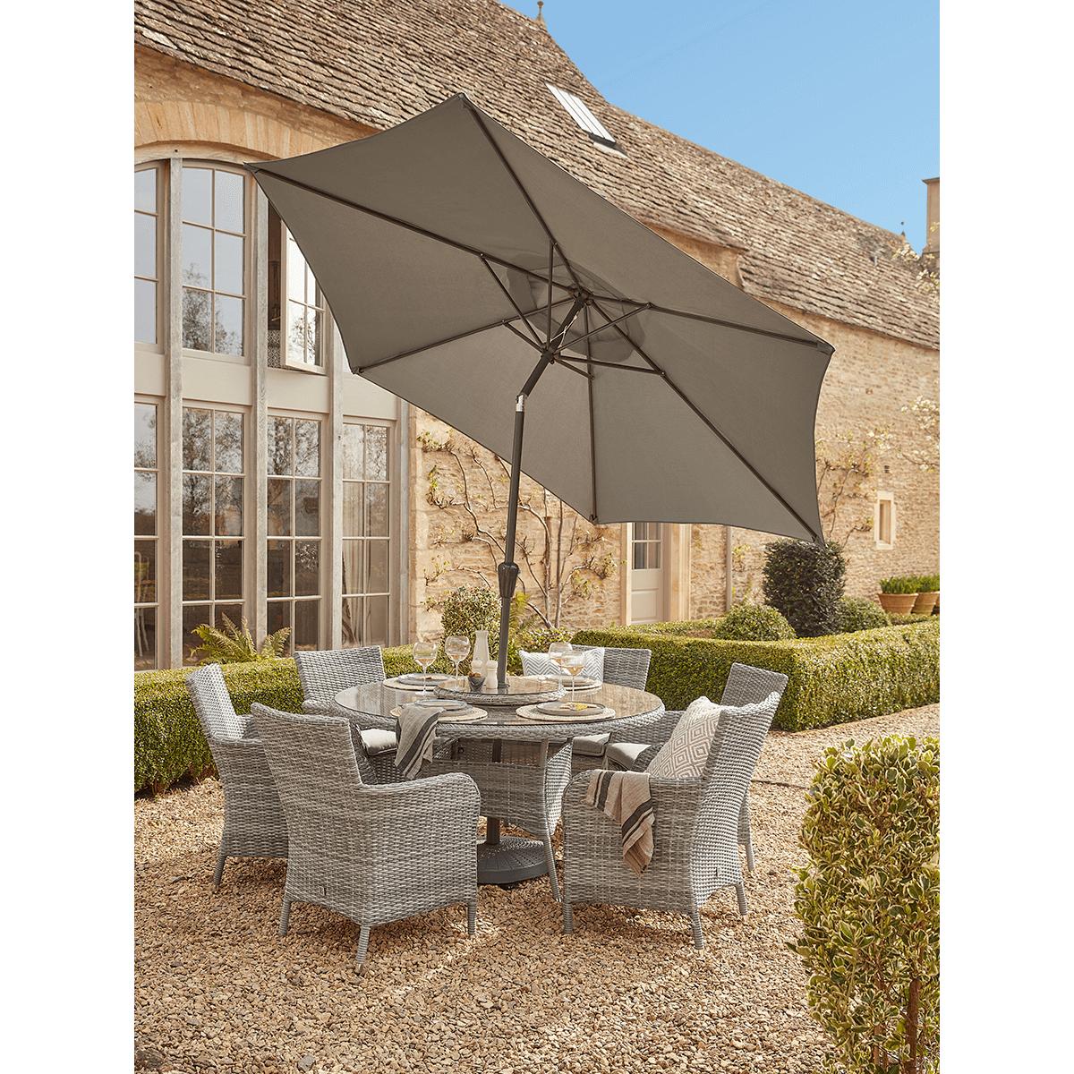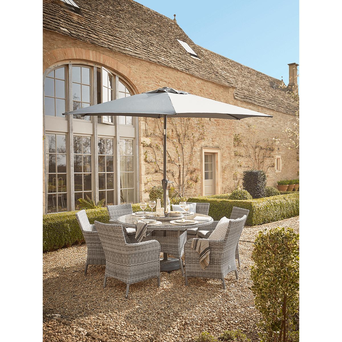 Our Cannes range features long-lasting faux wicker and classic durable good looks you can enjoy in your outdoor living space for years to come. In an elegant grey weave, with sumptuous toning cushions, our six-seat dining set is perfect for convivial lunches and suppers. This set comprises a round, glass-topped table, complete with a small central rotating serving table, and six comfortable armchairs. A parasol to cast some welcome shade on warmer days finishes off this comprehensive set.