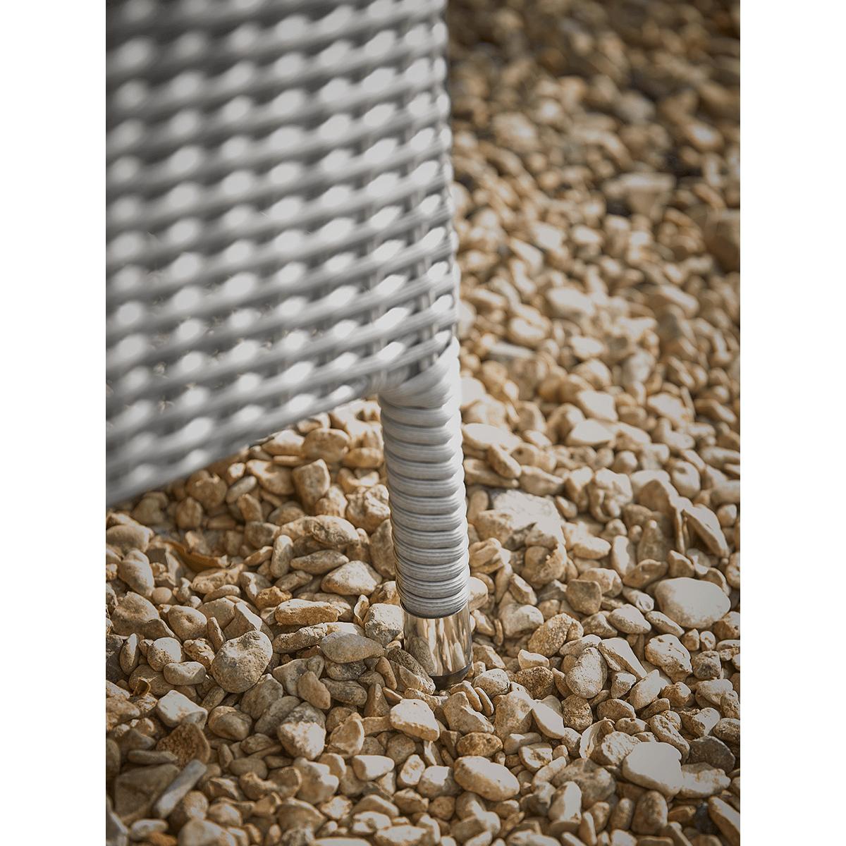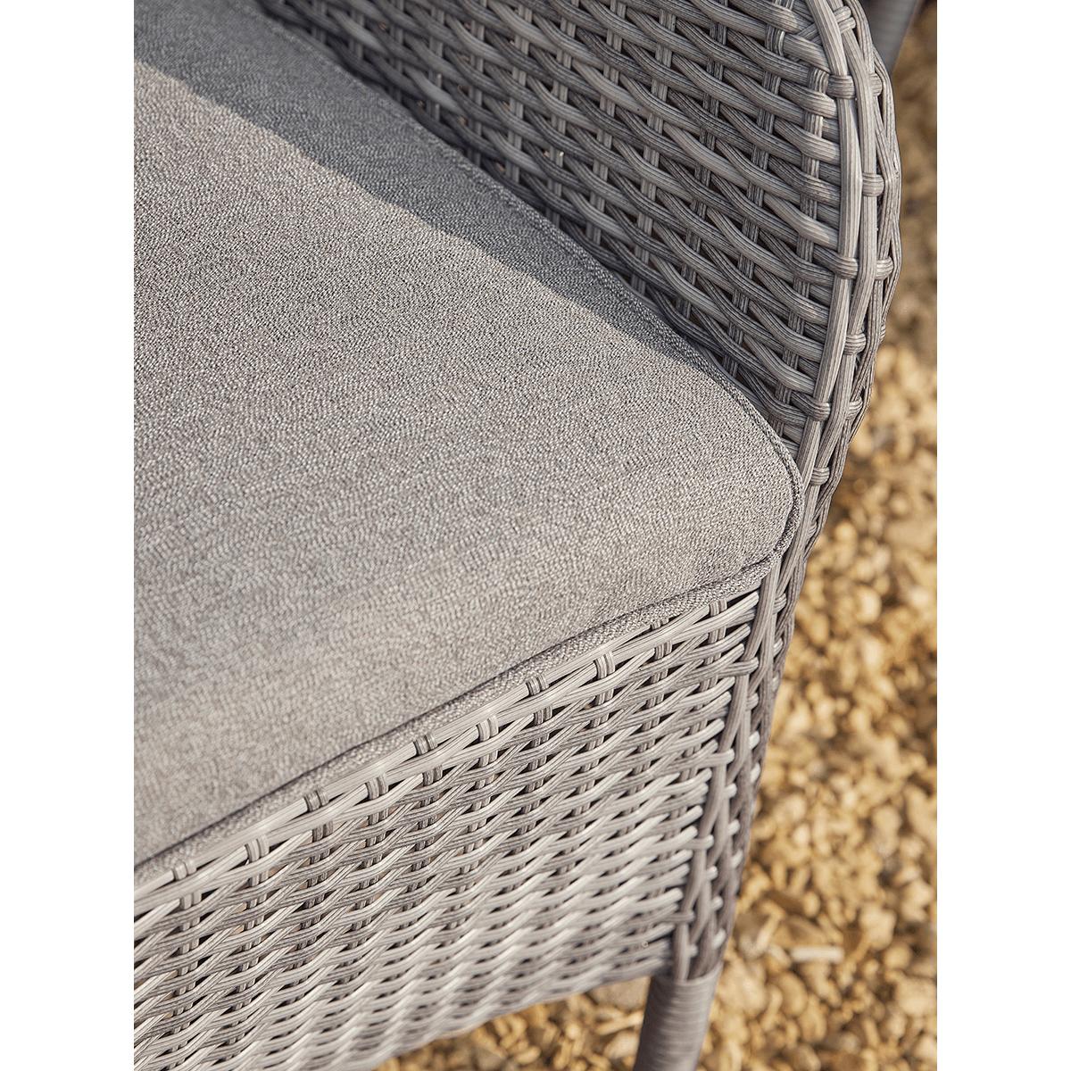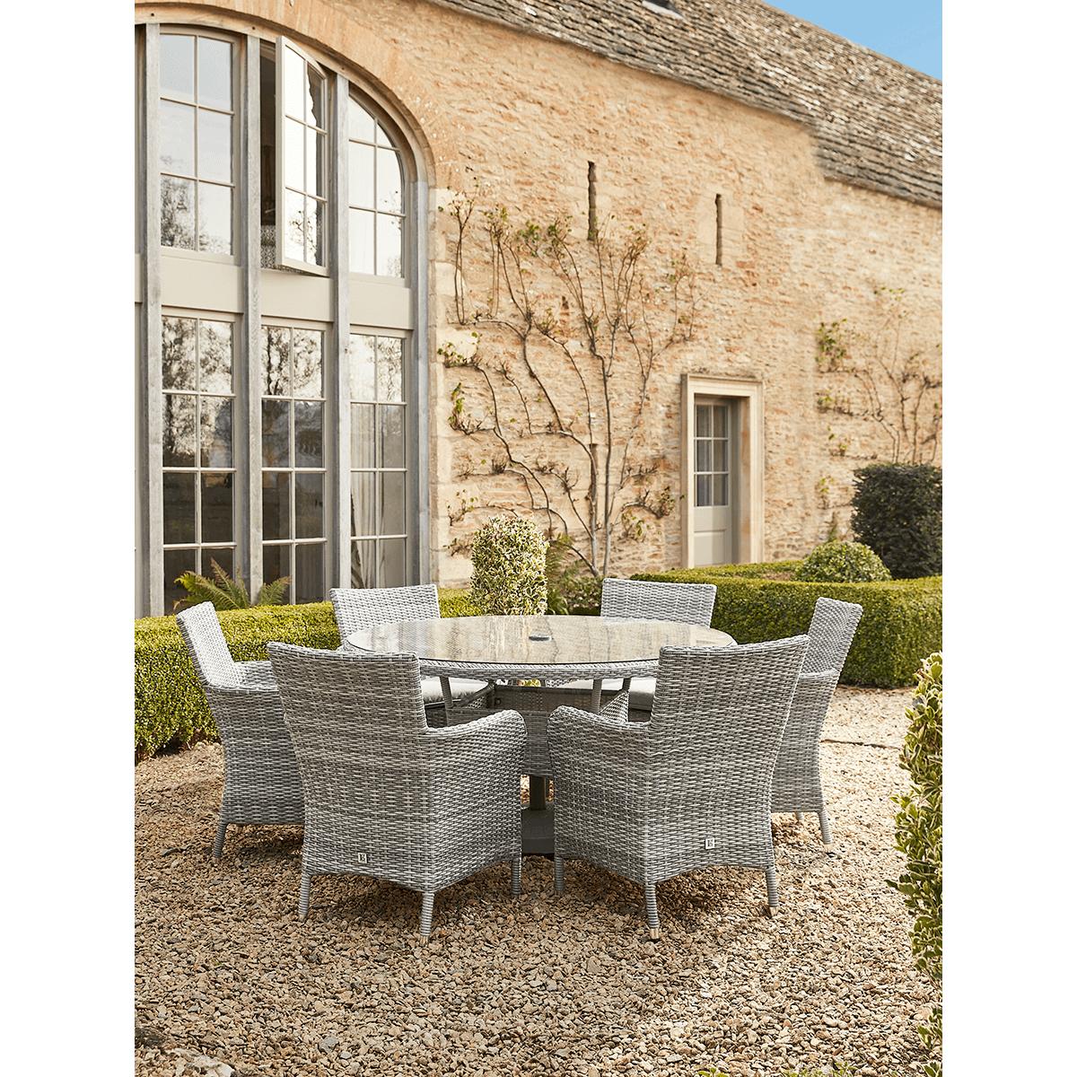 Our Cannes range features long-lasting faux wicker and classic durable good looks you can enjoy in your outdoor living space for years to come. In an elegant grey weave, with sumptuous toning cushions, our six-seat dining set is perfect for convivial lunches and suppers. This set comprises a round, glass-topped table, complete with a small central rotating serving table, and six comfortable armchairs. A parasol to cast some welcome shade on warmer days finishes off this comprehensive set.