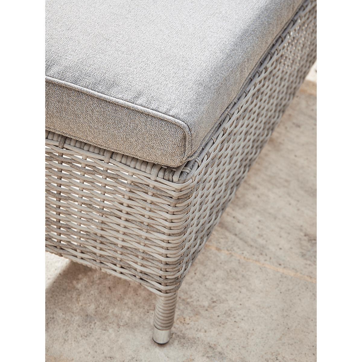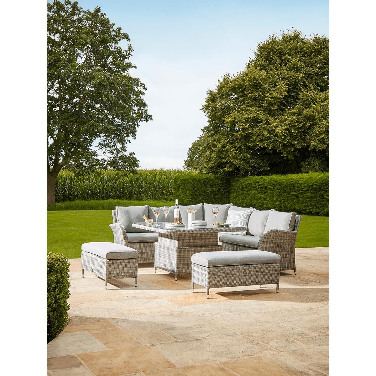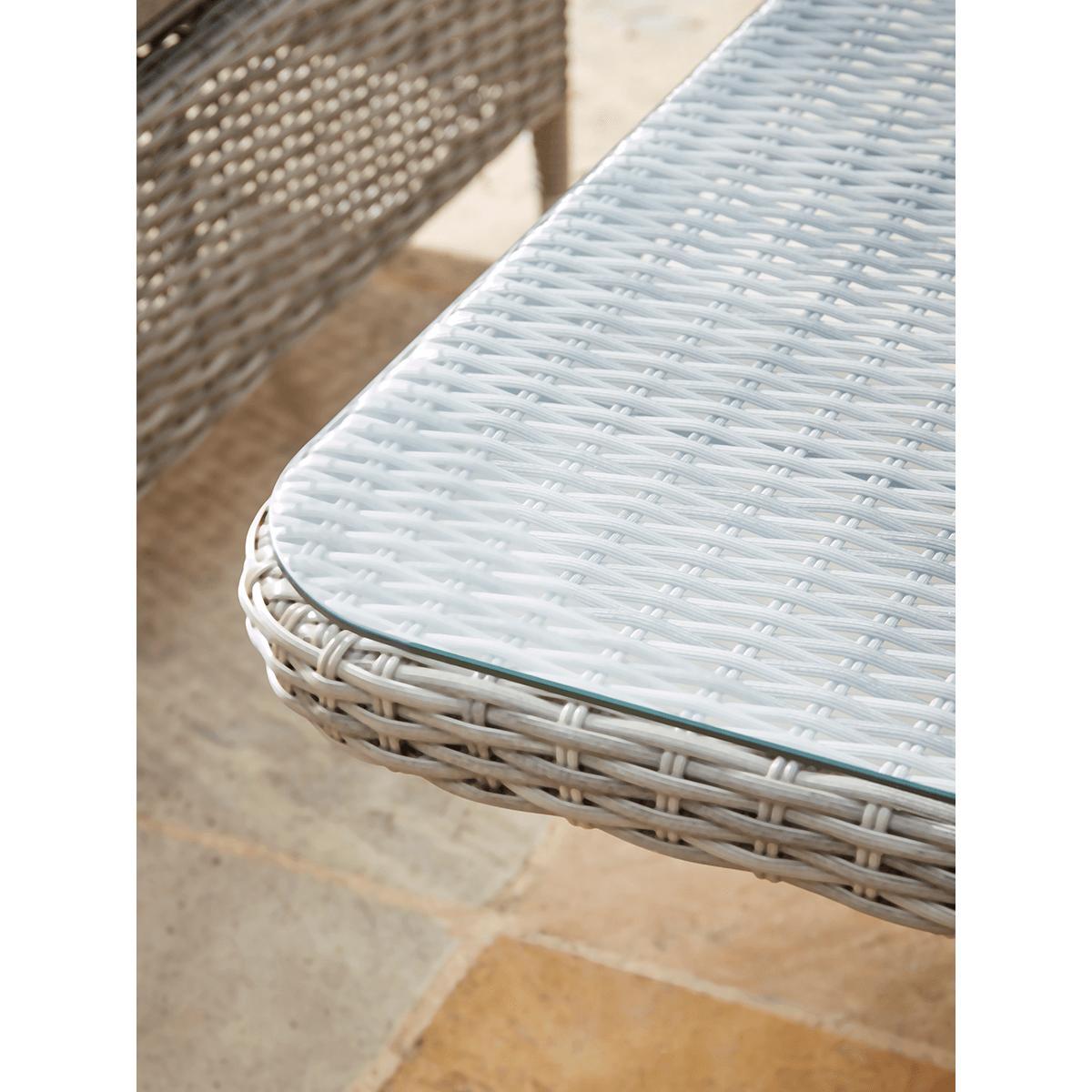 Our Cannes range features long lasting faux wicker and classic good looks that you will enjoy in your outdoor living space for years to come. The gently tonal changes in the pale sepia weave of this range gives a more authentic rattan effect while the curved edge on the cushions provides greater comfort. The Cannes Corner Dining Set offers superb versatility. The modular set can be arranged to make either a right or left-handed shape to suit your outdoor space. It will seat five people comfortably for a meal, and even more for drinks. In addition to the corner seat, there are two bench seats and a clever glass-topped table. Height adjustable, it takes you from a low table for drinks to a high table for dining in one easy move.