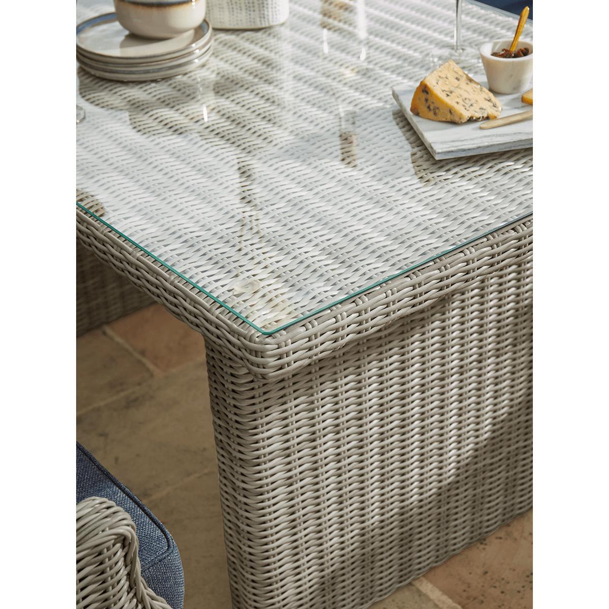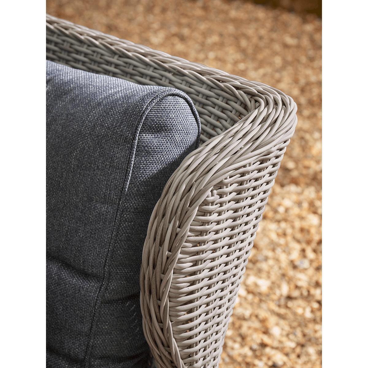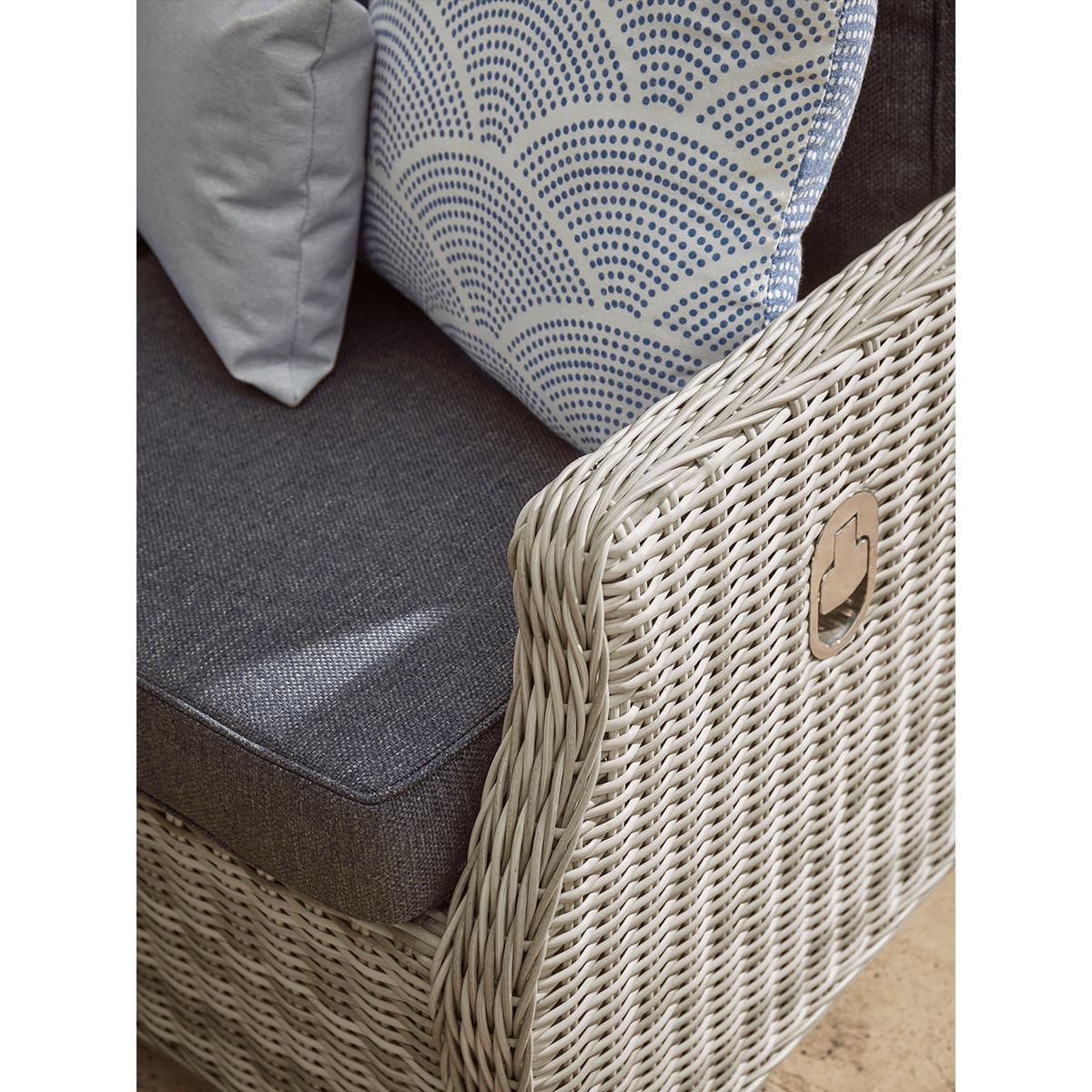 There’s a real touch of decadence to our Clovelly range. The elegant lines of the fresh grey faux wicker frame and high winged seat backs sparks nostalgia for country house parties or holidays on the Riviera. The plump denim blue buttoned cushions promise opulent comfort for all. The seats in the Clovelly Lounge Set, which includes two chairs and a bench, recline for further relaxation. This set also includes a glass topped table. This versatile set will see you through serious al fresco dining to giggly drinks with friends.