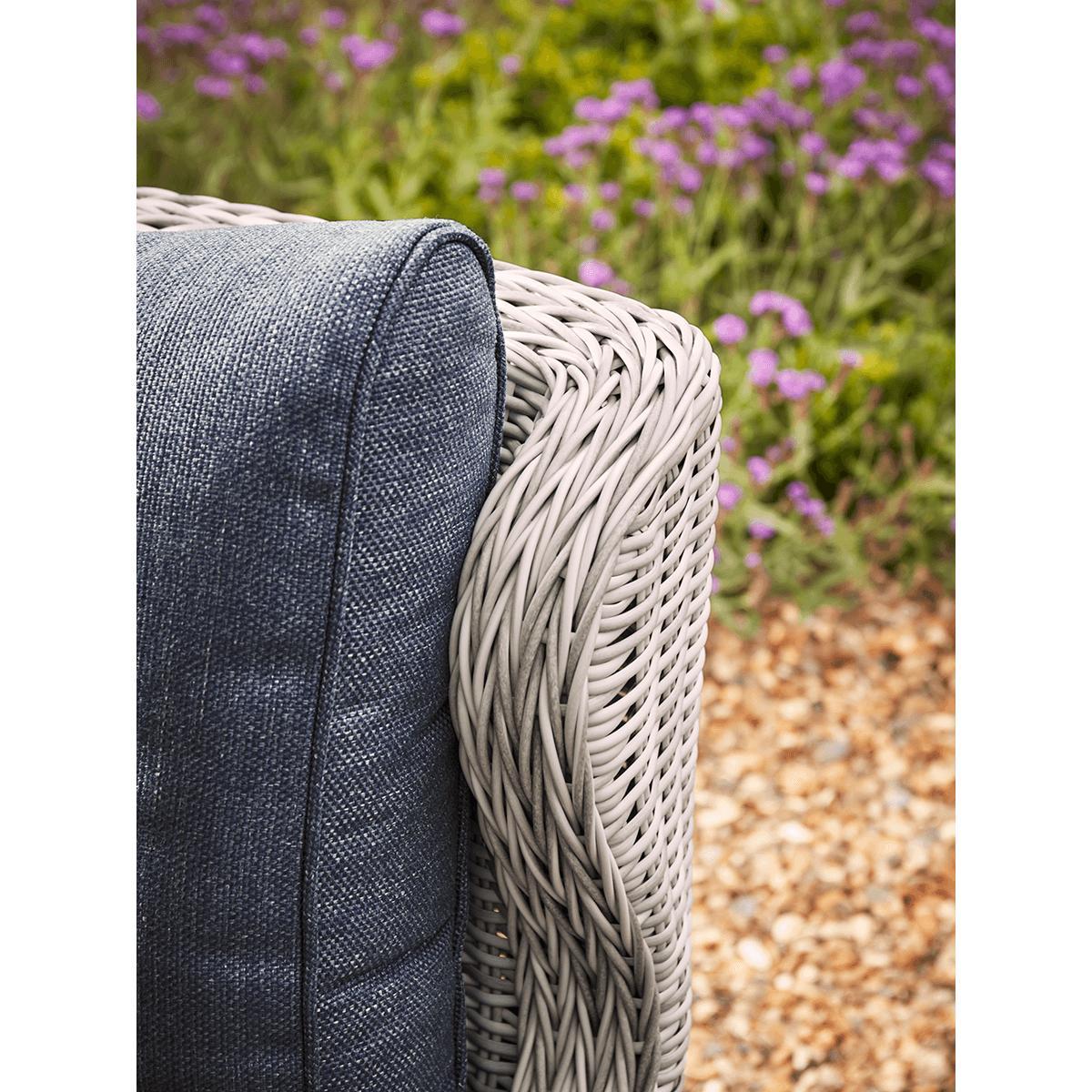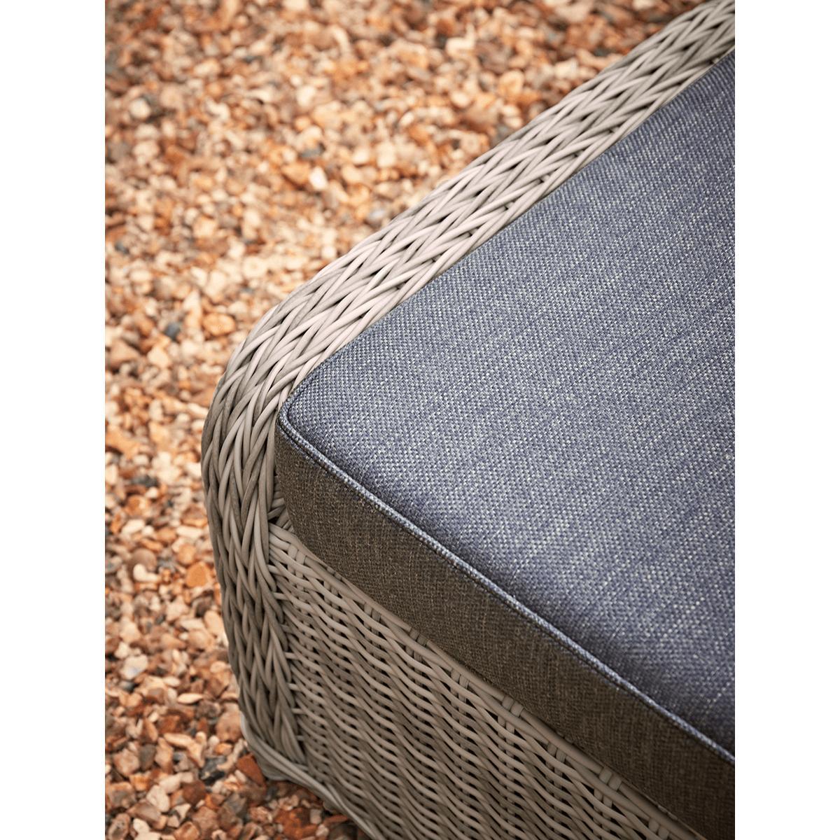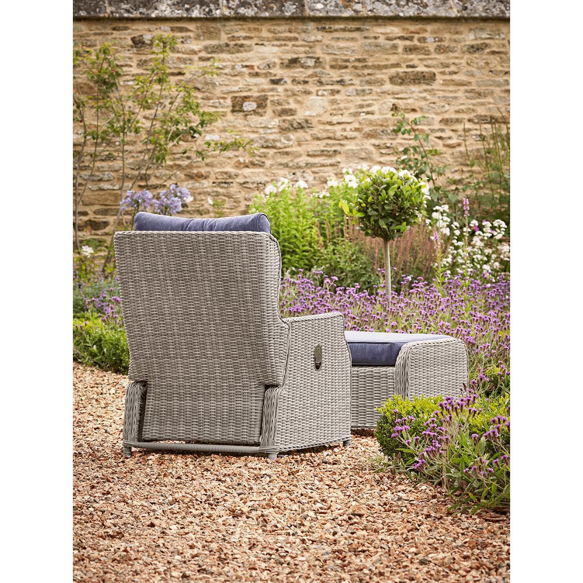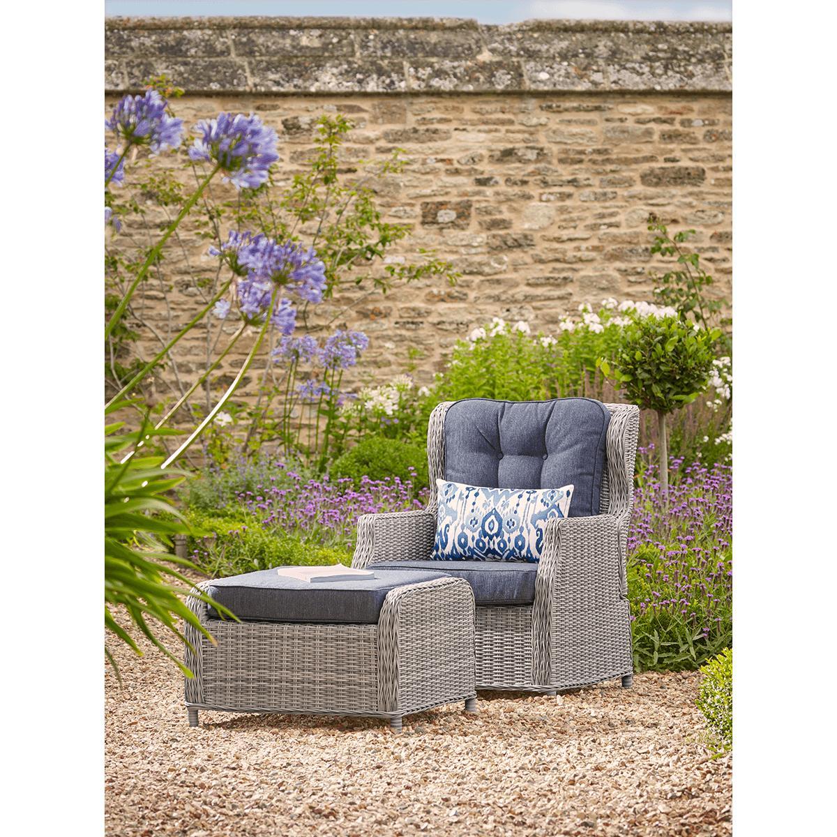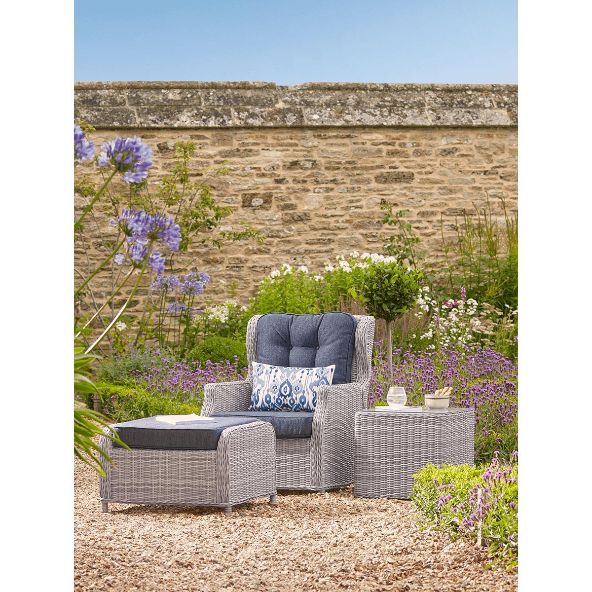 There’s a touch of old school decadence to our Clovelly range. The elegant fresh grey faux wicker frame and high winged seat sparks nostalgia for country house parties or holidays on the Riviera. The plump denim blue buttoned cushions promise opulent comfort for all. The recliner set is perfect for those keen to carve out some restorative time alone. Drop the seat back, pop your legs up onto the footstool and just relax into the moment. View our useful. Outdoor Furniture Buying Guide.