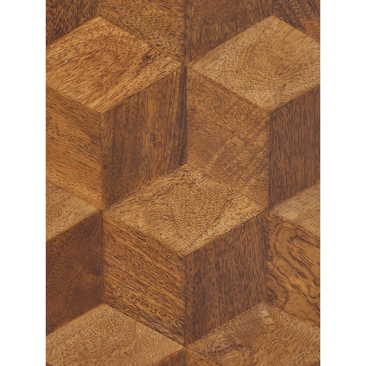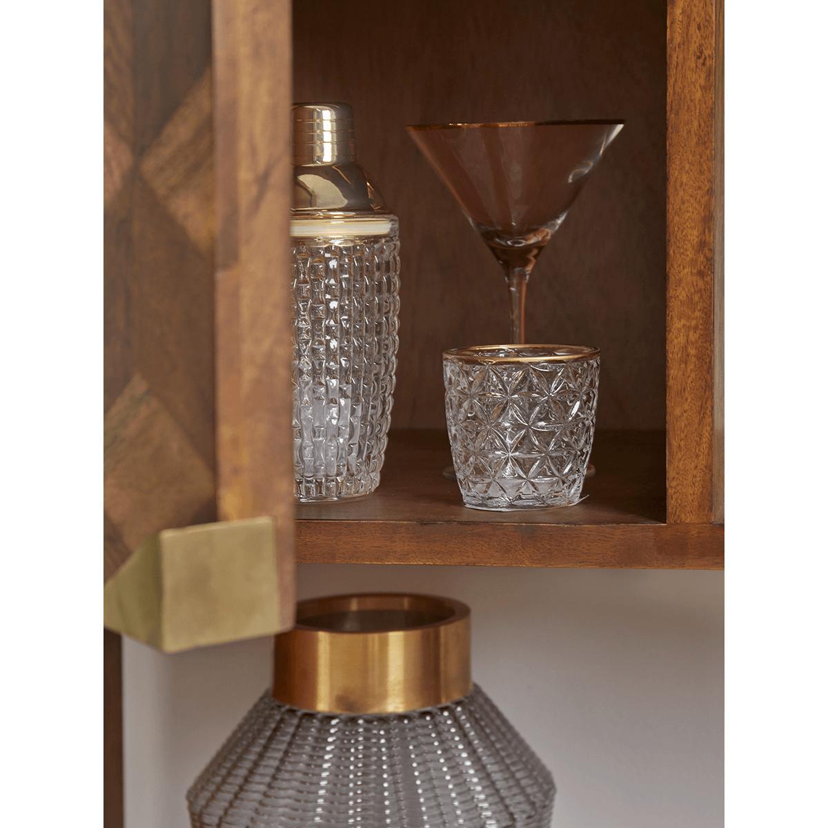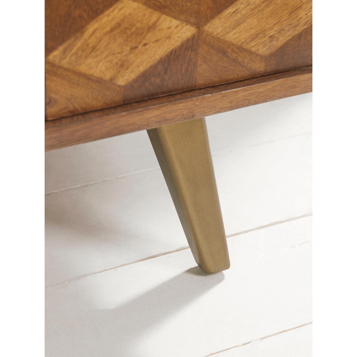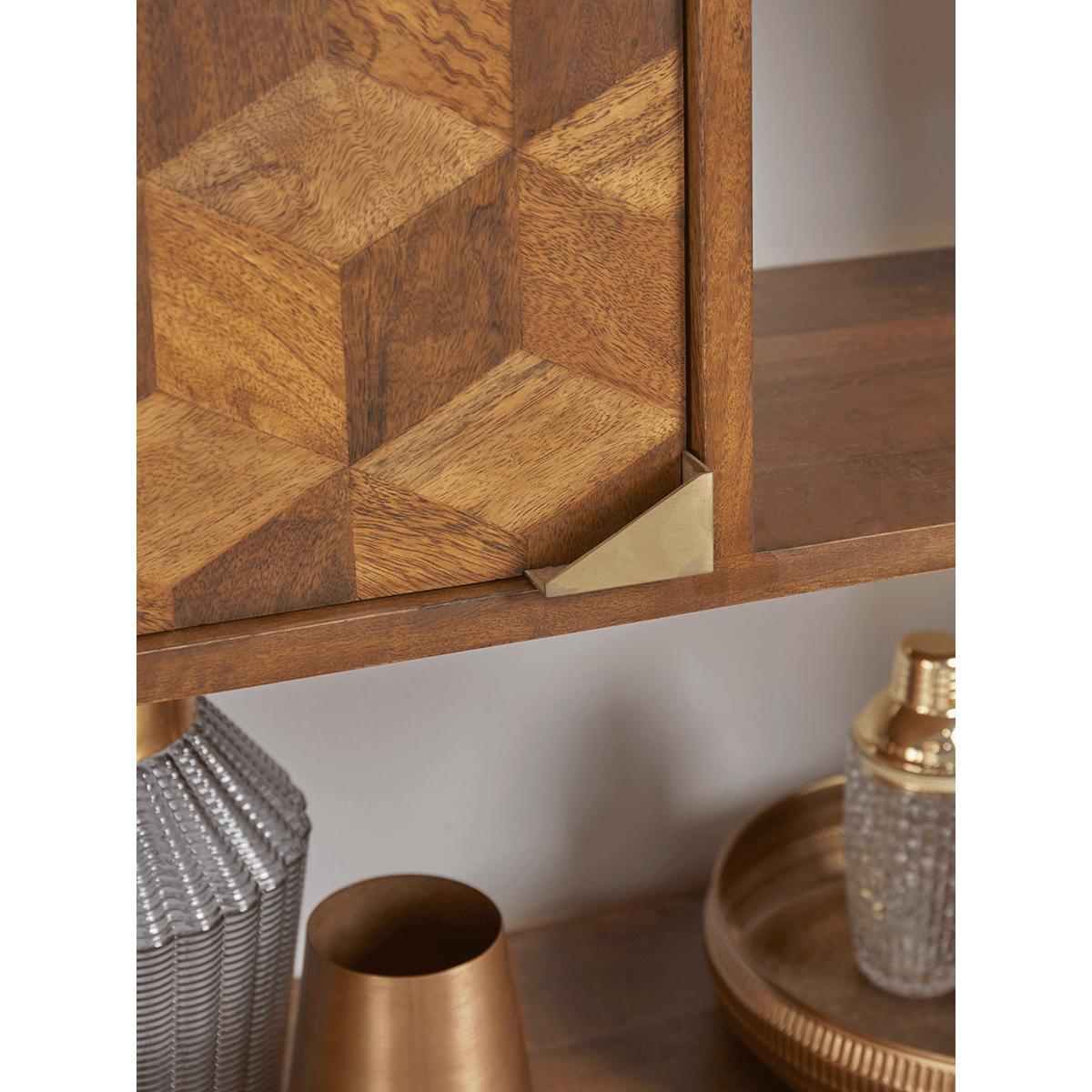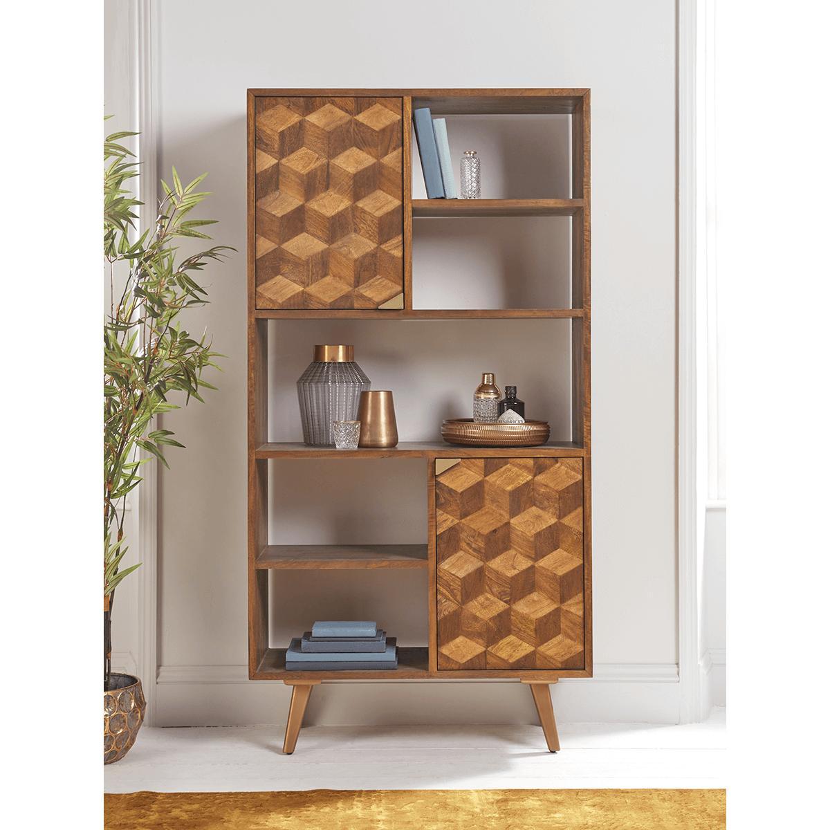 A striking statement piece for lovers of mid-century style, our Cubist Bookcase has a pleasing parquet-style veneer on the cupboard doors and ample display shelving. The wider central shelf is ideal for a drinks tray or presenting larger ornaments. The rich warmth of the mango wood is echoed in the legs and door handles which are finished in a burnished gold colour. A sophisticated addition to any living or dining space.