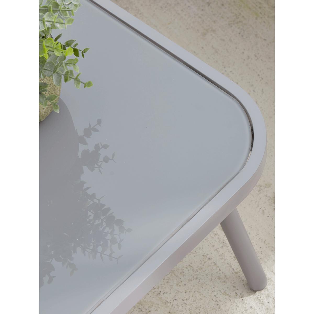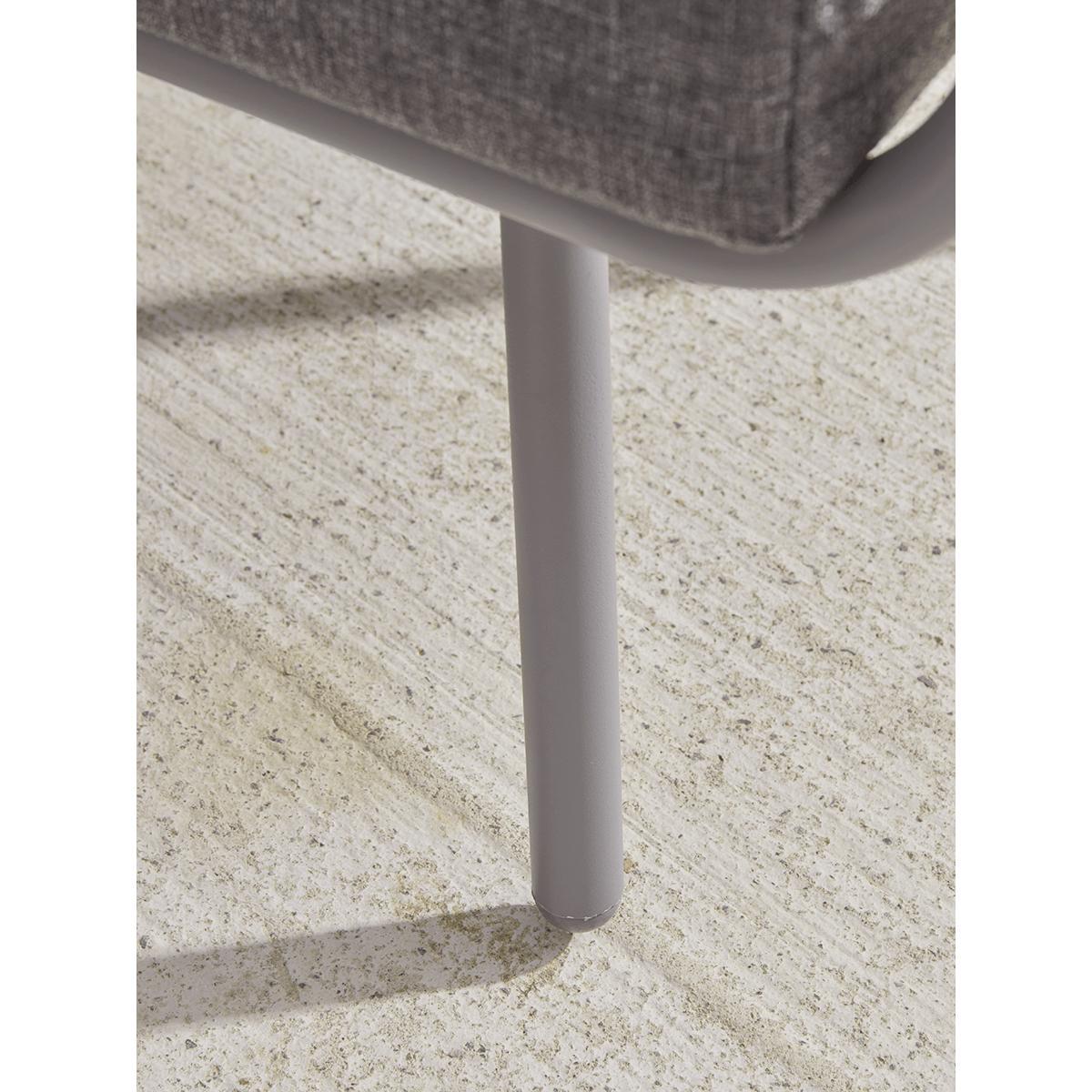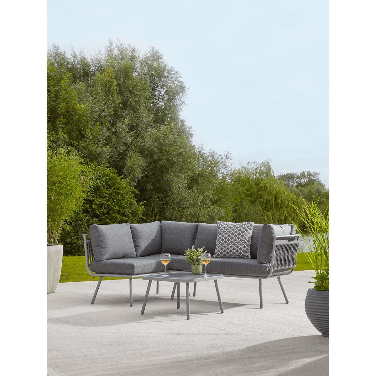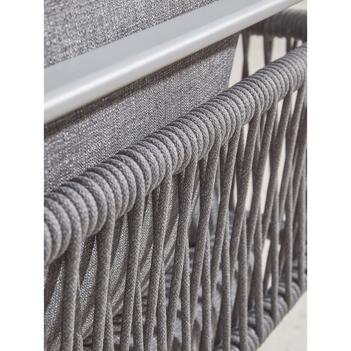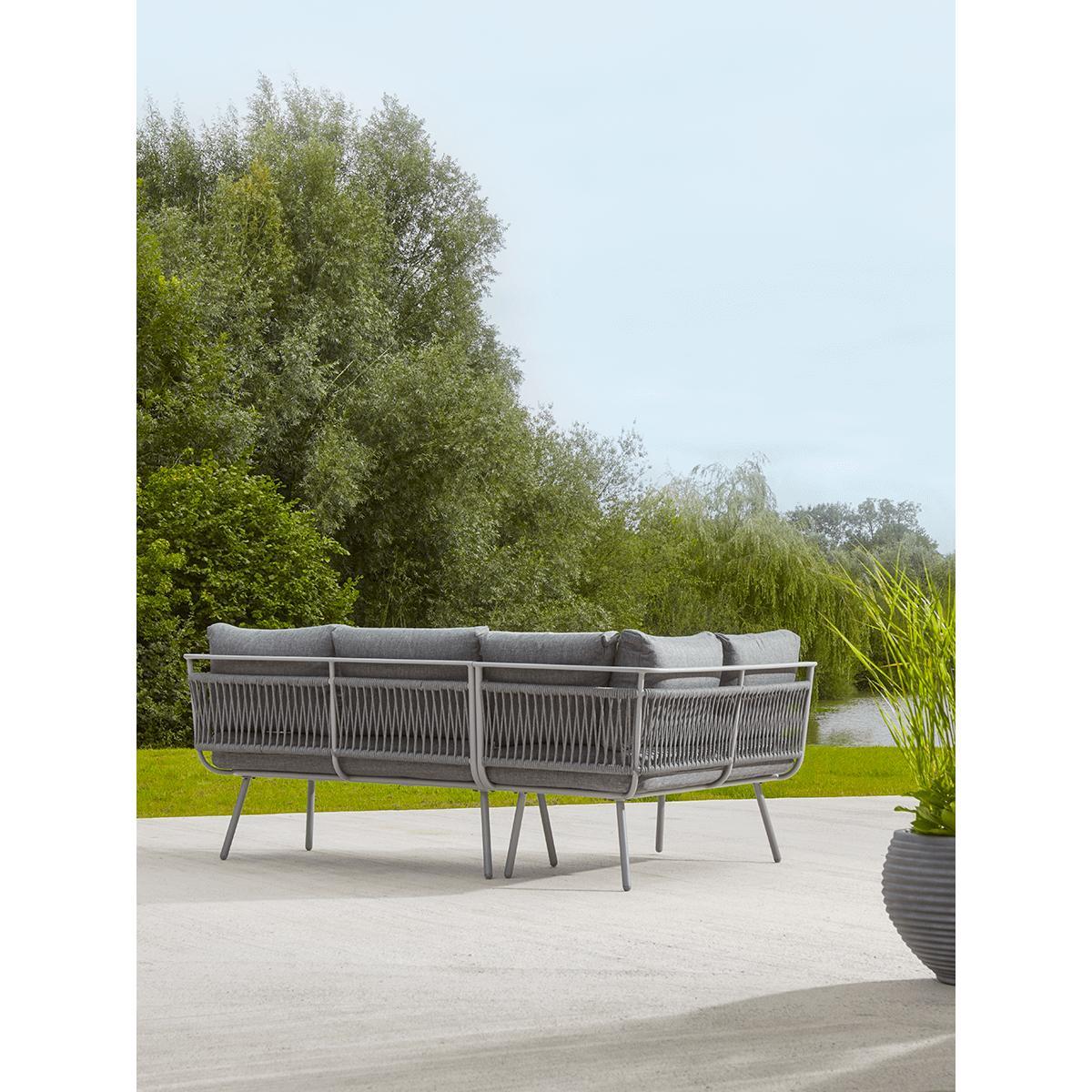 Forming a band across the back and sides of the seating, the sparing use of woven rope in the making of this Delos Corner Set gives it a minimalist quality that will age well. The soft grey of the powder coated steel frame corresponds with matching grey upholstery for a cohesive look that will enhance any number of outdoor living spaces. The set includes the corner sofa and glass topped table. View our useful. Outdoor Furniture Buying Guide.