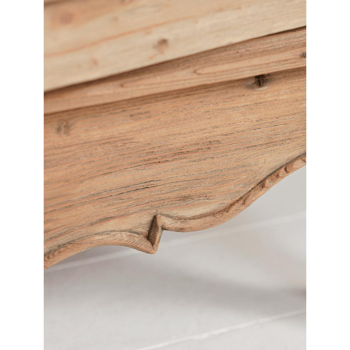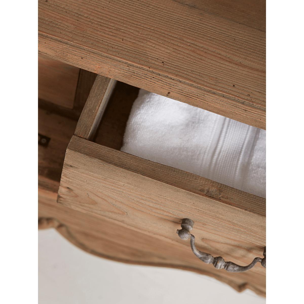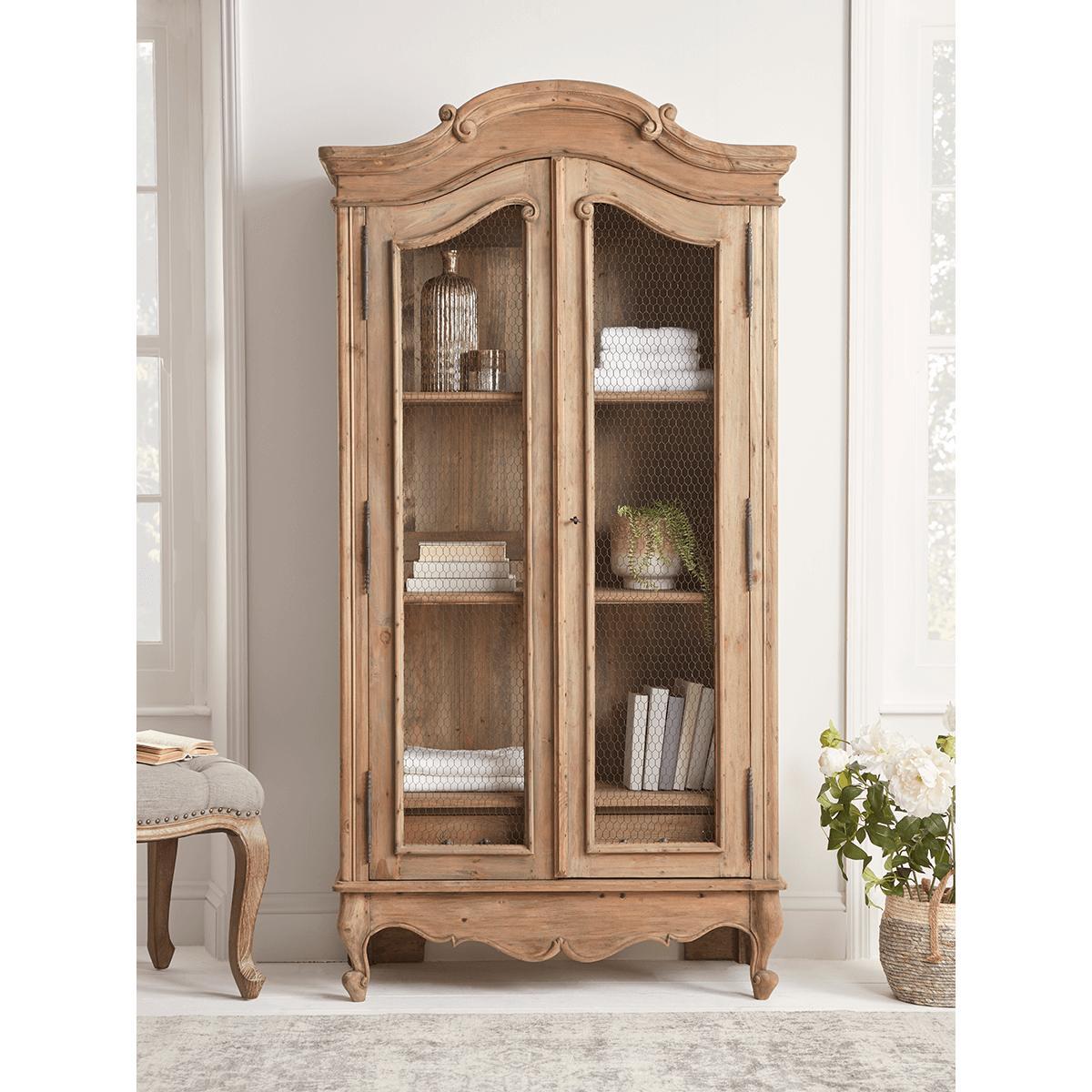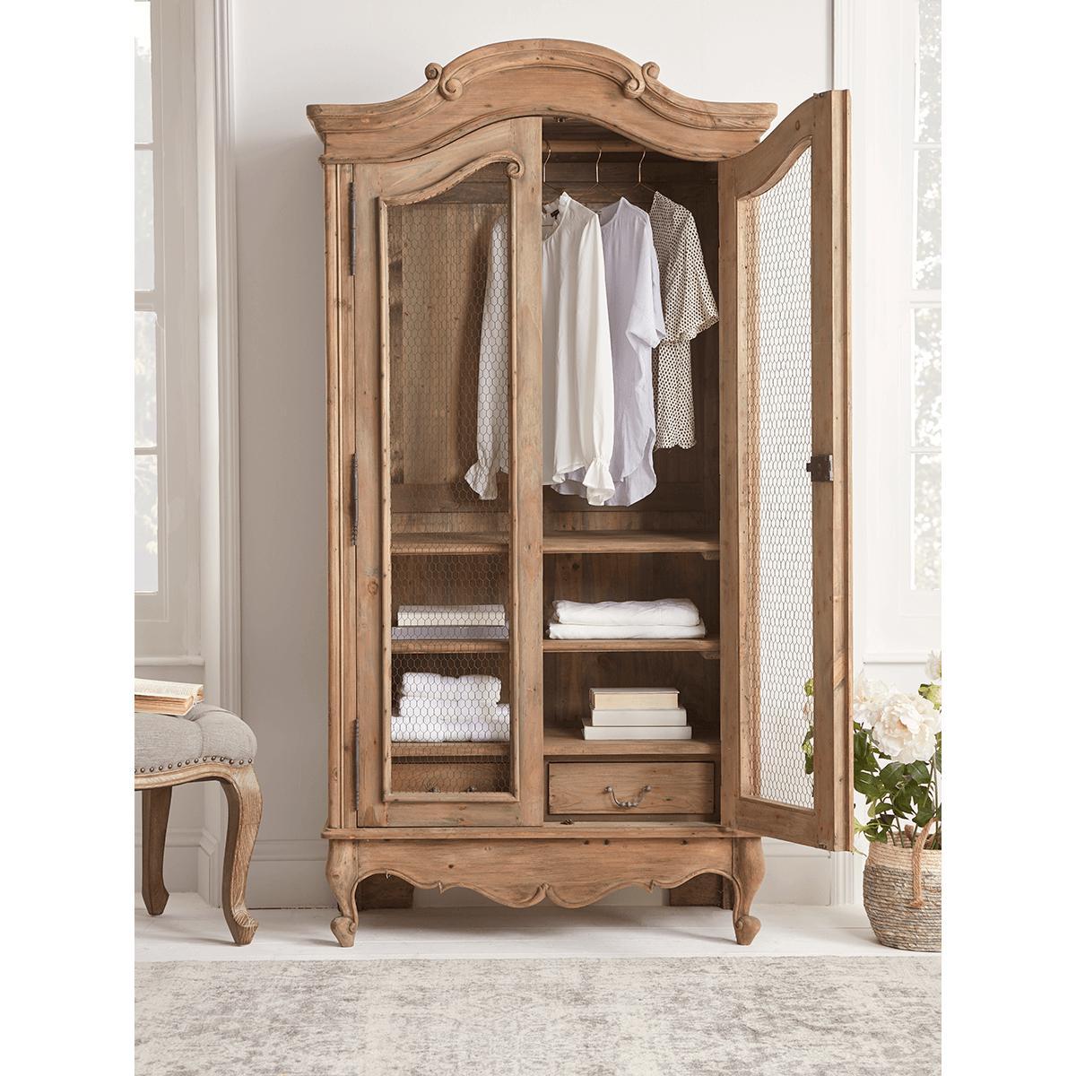 Embodying all the romance of chateau life, our Delphine Armoire will make a stately piece in any home. Crafted in reclaimed pine for an heirloom feel, this piece has classic carved details including a curvaceous pelmet, scrolls across the door frames and elegantly shaped feet. The wire insets on the doors and adjustable shelves make this perfect for storing neatly folded clothes, freshly pressed bedlinen or favourite glass and chinaware. There are also two handy internal drawers with traditional looking iron handles. This tall cupboard is both versatile and beautiful and sure to give a lifetime of pleasure. A. Chest of drawers. And. Bedside table. Are also available in the range.
