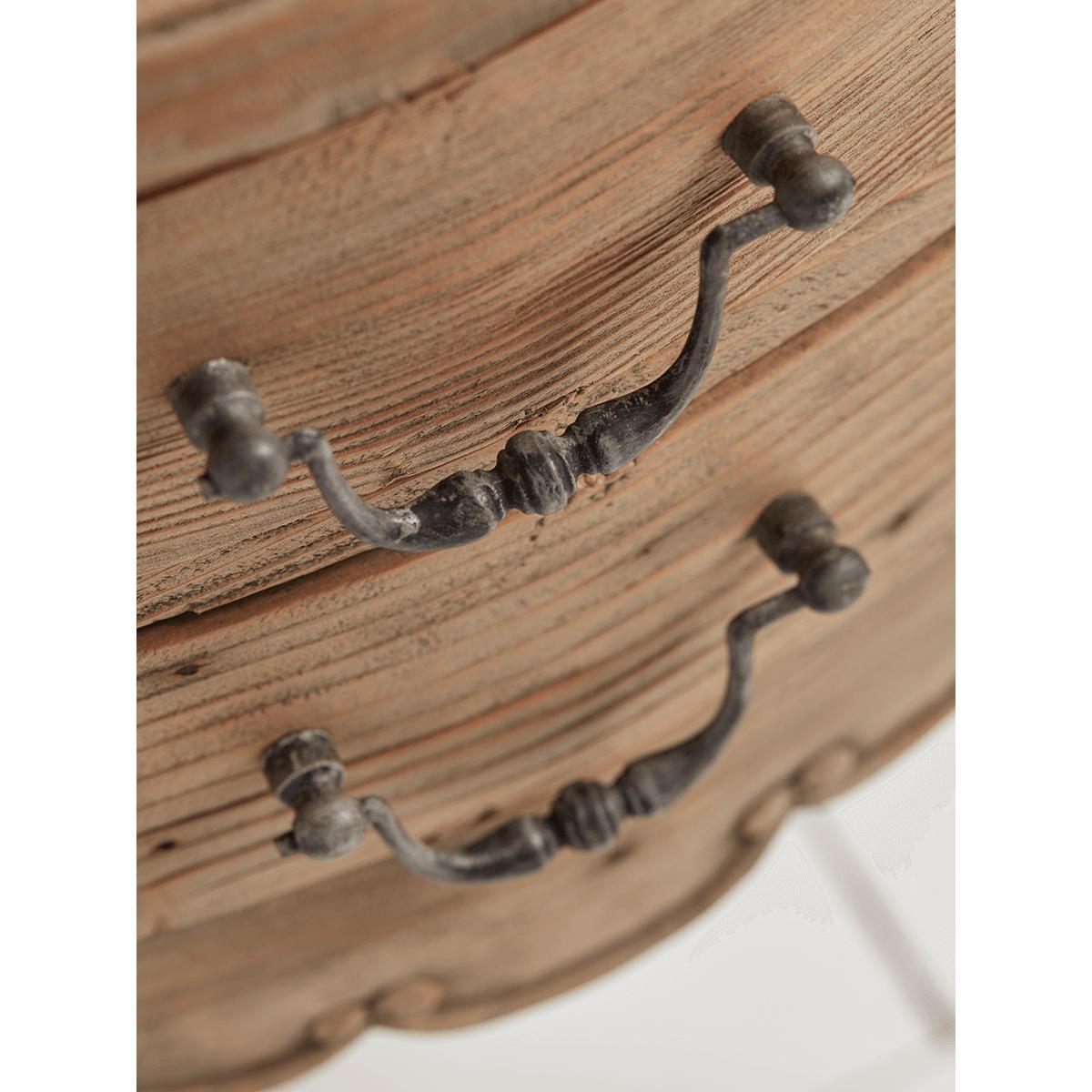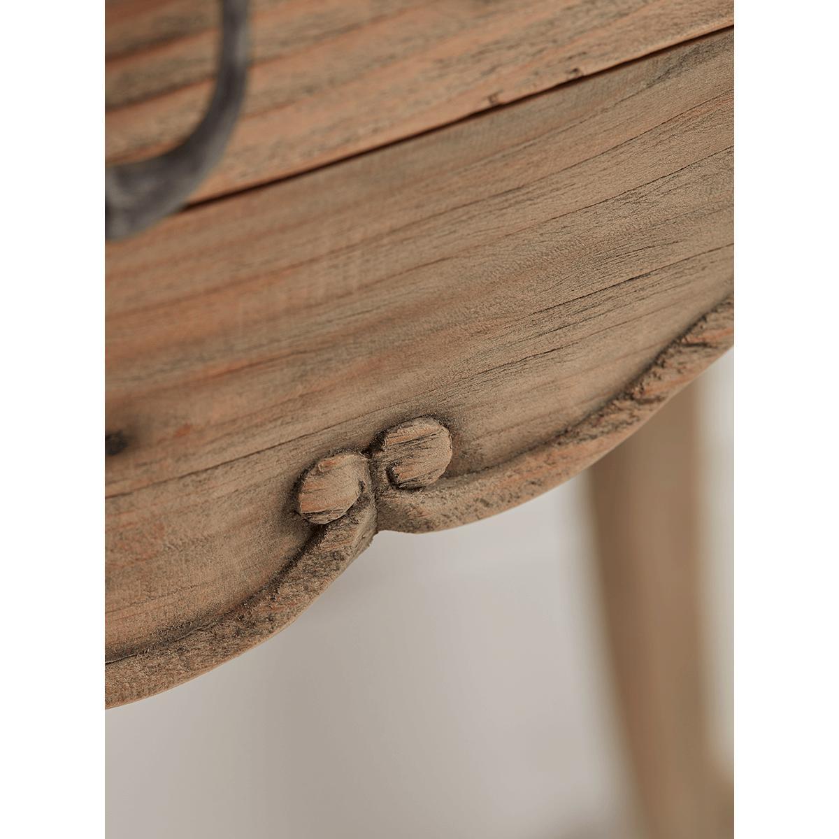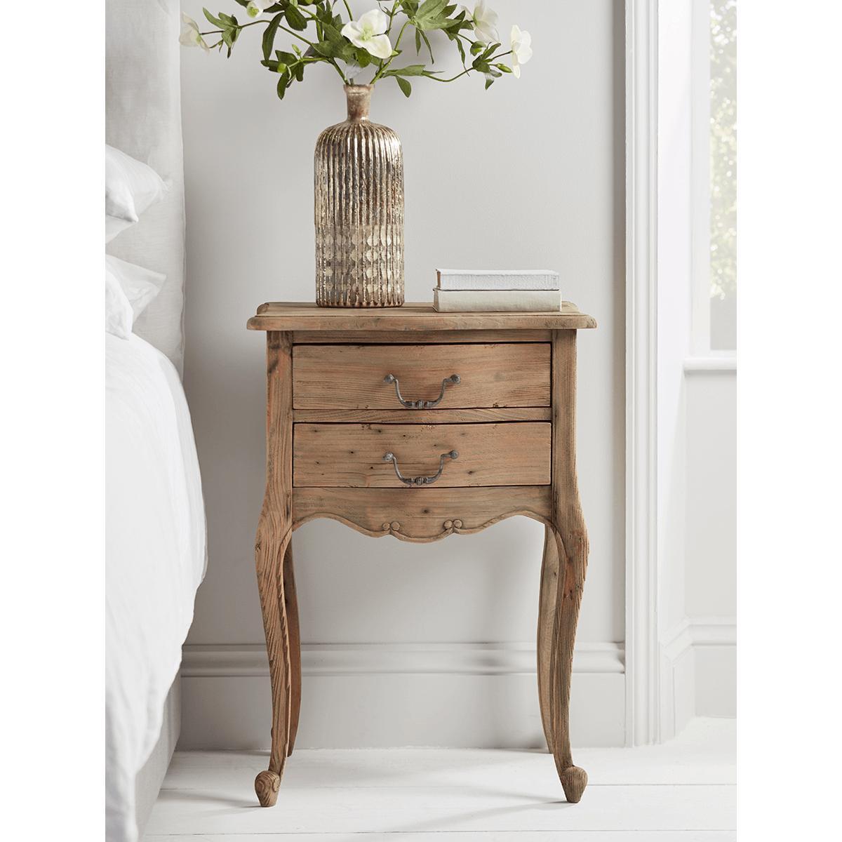 Please accept our apologies, this much loved item is currently sold out. For a lived-in look, to add authenticity to your scheme, the charming Delphine range comes with material character and classic design detail. Made from reclaimed pine, with visible wood grain and colour variance for a time aged look, the range features slender shaped metal handles, classic cabriole legs and a curved decorative edge. Perfect for the bedroom, this table has two drawers for bedside accessories and will provide a surface for a small. Bedside lamp. In the same age old style. A. Chest of drawers. And an. Armoire. Are available in the same range.