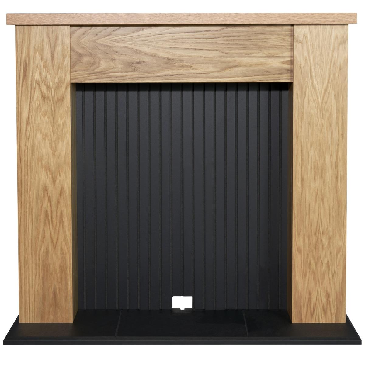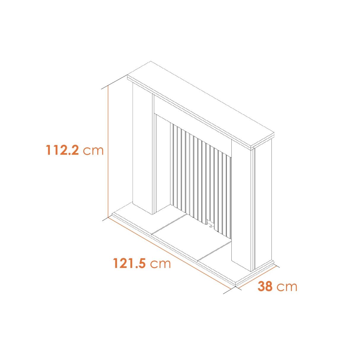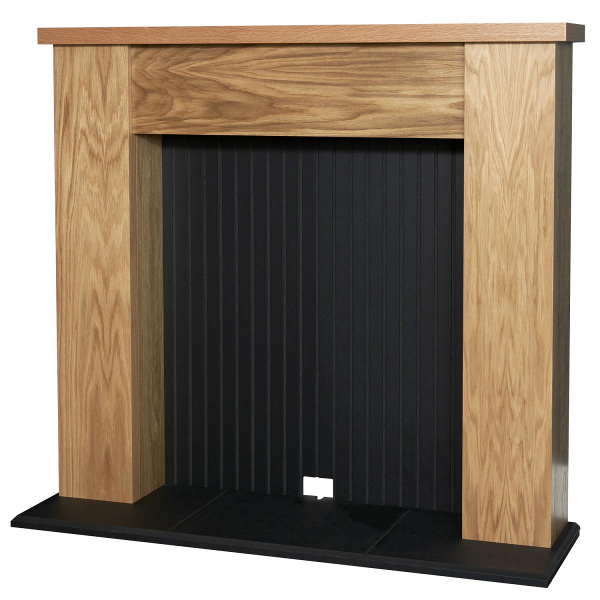 Dimensions H111.6 x W121 x D38 cm. The New England stove fireplace offers an attractive and modern focal point for your home with its oak effect surround and black back panel and hearth. Combine the New England stove fireplace with an Adam electric stove and this will certainly look the part in your home. Features. Oak surround with black back panel and; hearth48 inch hearth Suitable for electric and; bio ethanol stoves. Fits flat to the wall no recess required. Downlights No. Assembly required..
