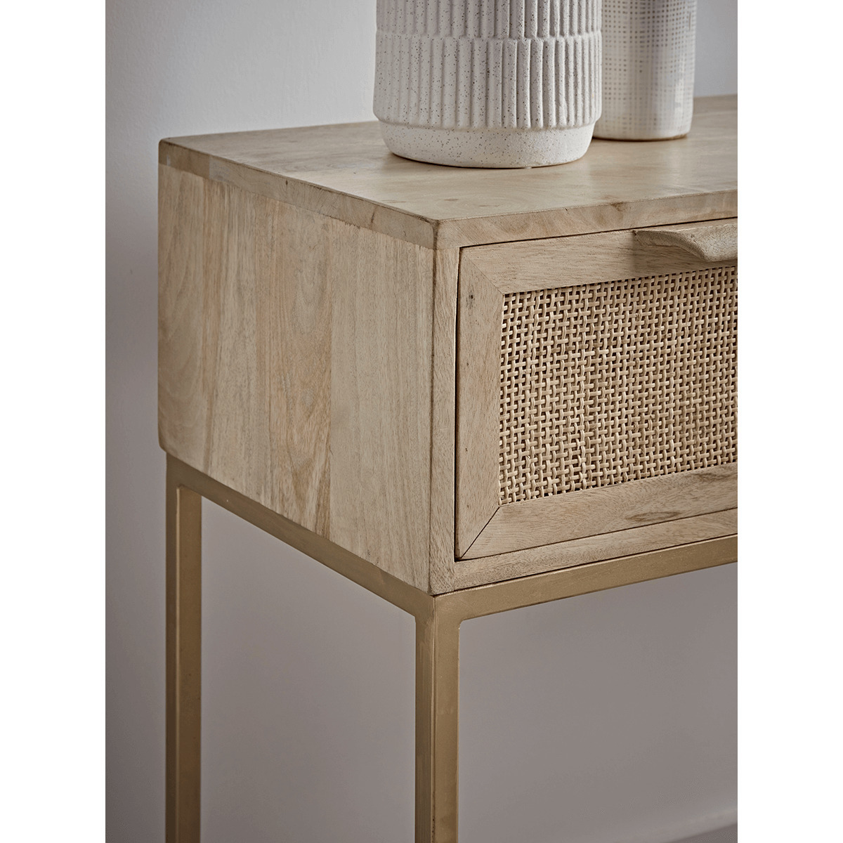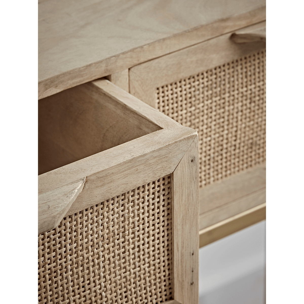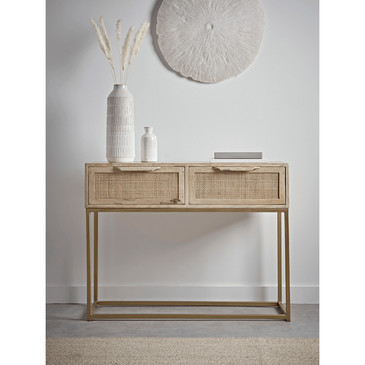 The natural tones of our Flat Rattan Webbing Console Table set a warm and inviting tone to any neutral scheme whilst the cane-look woven panels deliver an instant style update. Two deep drawers provide ample storage and a brass painted iron frame communicates a luxe feel. Position to a hallway or living area and style with complementing pieces to open up your space.