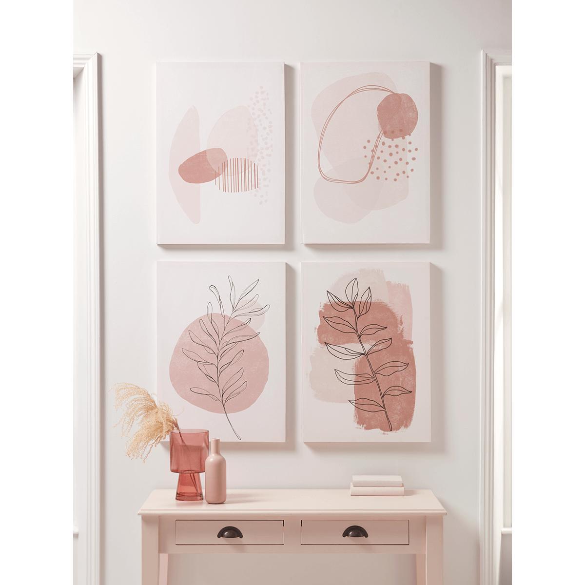 These four abstract blush canvases are a versatile addition to many interiors, offering a gentle pop of colour and a modern touch of artistry. I love how they bring a sense of cohesion when grouped together, making them perfect for living rooms, bedrooms or even hallway spaces that need a subtle focal point. To style them effectively, consider pairing with neutral or pastel soft furnishings to keep the colour palette cohesive, or juxtapose with bolder accent pieces for visual interest. Practical tips include hanging at eye level and ensuring consistent spacing to create a balanced, curated look that elevates the overall aesthetic of the room.