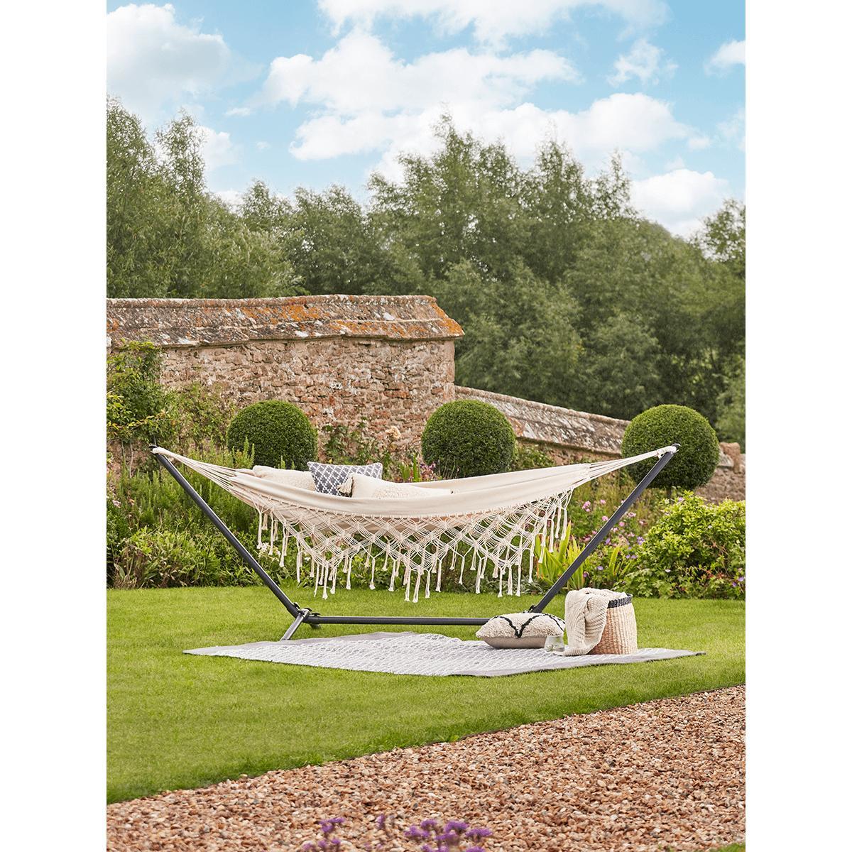 With its opulent tassels and natural cream colouring, our Fringed Hammock is a garden classic. The perfect place to rest and unwind with a good book. Use with our. Hammock Stand. For stable, worry-free relaxation.
