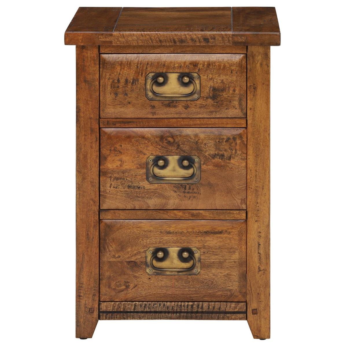 A traditional piece with timeless charm. The New Frontier Mango Wood 3 Drawer Bedside is a great option for storing all your evening necessities and adding an old world look to your bedroom. Featuring drop handles, script handwriting printed drawers and natural grains of wood running throughout each drawer front. New Frontier will look great for many years to come. Sit this bedside next to the New Frontier Mango Wood Sleigh Bed for a put together look. This item is part of the Trees 4 Trees project. Read more here.