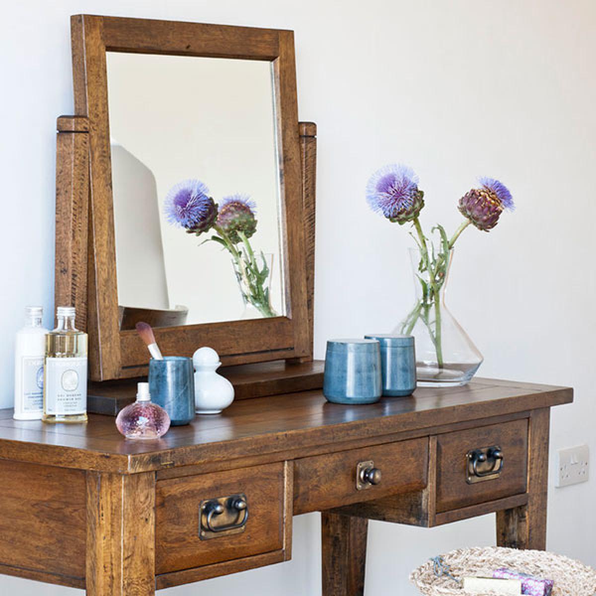 This characterful Gallery Mirror is part of the new Frontier Bedroom Collection and is perfect on top of the Dressing table of chests which is also made from mango wood which has a warm and mellow tone. The Gallery Mirror has been given a cleverly distressed finish which gives it an essentially rustic feel with the clean lines and simple detailing giving the furniture piece it a contemporary feel. Stylish on top of the table, this dressing table set suits traditional and more modern settings. There is also a Cheval Mirror available in this contemporary bedroom collection. The range highly versatile and the ideal addition to any bedroom. This item is part of the Trees 4 Trees project. Read more here.